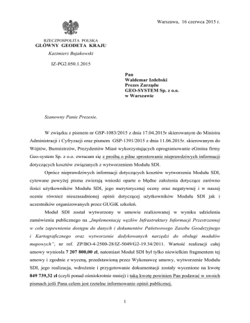 Warszawa, 16 czerwca 2015 r. RZECZPOSPOLITA POLSKA GŁÓWNY GEODETA KRAJU Kazimierz Bujakowski IZ-PG2.050.1.2015 Pan Waldemar Izdebski Prezes Zarządu GEO-SYSTEM Sp. z o.o. w Warszawie Szanowny Panie Prezesie, W związku z pismem nr GSP-1083/2015 z dnia 17.04.2015r skierowanym do Ministra Administracji i Cyfryzacji oraz pismem GSP-1391/2015 z dnia 11.06.2015r. skierowanym do Wójtów, Burmistrzów, Prezydentów Miast wykorzystujących oprogramowanie eGmina firmy Geo-system Sp. z o.o. zwracam się z prośbą o pilne sprostowanie nieprawdziwych informacji dotyczących kosztów związanych z wytworzeniem Modułu SDI. Oprócz nieprawdziwych informacji dotyczących kosztów wytworzenia Modułu SDI, cytowane powyżej pisma zwierają wnioski oparte o błędne założenia dotyczące zarówno ilości użytkowników Modułu SDI, jego merytorycznej oceny oraz negatywnej i w naszej ocenie również nieuzasadnionej opinii dotyczącej użytkowników Modułu SDI jak i uczestników organizowanych przez GUGiK szkoleń. Moduł SDI został wytworzony w umowie realizowanej w wyniku udzielenia zamówienia publicznego na „Implementację węzłów Infrastruktury Informacji Przestrzennej w celu zapewnienia dostępu do danych i dokumentów Państwowego Zasobu Geodezyjnego i Kartograficznego oraz wytworzenie dedykowanych narzędzi do obsługi modułów mapowych”, nr ref. ZP/BO-4-2500-28/IZ-5049/G2-19.34/2011. Wartość realizacji całej umowy wyniosła 7 207 800,00 zł, natomiast Moduł SDI był tylko niewielkim fragmentem tej umowy i zgodnie z wyceną, przedstawioną przez Wykonawcę umowy, wytworzenie Modułu SDI, jego realizacja, wdrożenie i przygotowanie dokumentacji zostały wycenione na kwotę 849 739,32 zł (czyli ponad ośmiokrotnie mniej) i taką kwotę powinien Pan podawać w swoich pismach jeśli Pana celem jest rzetelne informowanie opinii publicznej. 1 Pozostała część wartości tej umowy obejmowała prace związane przede wszystkim z wytworzeniem i wdrożeniem Uniwersalnego Modułu Mapowego, którego zadaniem jest wsparcie działań operacyjnych służb ratowniczych, poprzez wytworzenie dedykowanych aplikacji operujących na referencyjnych danych przestrzennych z wykorzystaniem Modułu SDI, oraz na przestrzennych danych operacyjnych poszczególnych służb. Zakres umowy w tej części to również prace związane z integracją UMM z systemami Partnerów (System Wspomagania Dowodzenia Policji, System Wspomagania Decyzji Państwowego Ratownictwa Medycznego, System Wspomagania Decyzji Państwowej Straży Pożarnej). W tym miejscu należy również zwrócić uwagę, że Pana analizy oprócz błędnych danych dotyczących znacznie zawyżonych kosztów nie zakładają wzrostu ilości użytkowników Modułu SDI co odpowiednio zmniejsza podawane przez Pana koszty odniesione do liczby użytkowników – zainteresowanie w różnej formie wyraża duża ilość podmiotów - jednostek samorządu terytorialnego (powiaty, województwa), a także inne podmioty publiczne prowadzące zbiory danych przestrzennych. Równie nieprawdziwa i nieuprawniona jest podawana przez Pana informacja związana z drugim zamówieniem wymienionym w przywołanych pismach tj. zamówieniem uzupełniającym (nr ref. ZP/BO-4-2500-27/IZ-5049/G2-19.38/2012) o wartości 1 595 925,00 zł, które zostało przygotowane z uwagi na potrzebę integracji UMM z nie ujętym pierwotnie w wymaganiach do UMM, systemem informatycznym centrów powiadamiania ratunkowego. W ramach zamówienia uzupełniającego nie prowadzono prac związanych z tworzeniem Modułu SDI i w tym przypadku podana przez Pana kwota jest zawyżona o całą wartość tego zamówienia. Ostatnie z wymienionych zamówień, tj. zamówienie na Kompleksową organizację i przeprowadzenie szkoleń z zakresu korzystania z aplikacji do prowadzenia ewidencji miejscowości, ulic i adresów oraz z oprogramowania Modułu SDI dla przedstawicieli jednostek samorządu terytorialnego, w części dotyczącej szkoleń z oprogramowania Modułu SDI o wartości 2 299 500,00 zł, nie obejmowało prac związanych z tworzeniem Modułu SDI lub jego modyfikacji. Zamówienie polegało na przeprowadzeniu szkoleń z oprogramowania Modułu SDI, będącego w posiadaniu GUGiK i było w ocenie naszej jak i uczestników potrzebne, ważne i przydatne w realizacji codziennych zadań, w których rolę odgrywa informacja przestrzenna. Szkolenie realizowane były przez wykładowców z dużą wiedzą i doświadczeniem i pozostaje nam ubolewać, że Pan tak źle ocenia uczestników tych szkoleń mając niestety na względzie jedynie partykularny interes. 2 Mając na względzie powyższe wnosimy jak na wstępie tj. o pilne sprostowanie nieprawdziwych informacji dotyczących kosztów Modułu SDI. Odnosząc się natomiast do wykorzystywania Modułu SDI przez podmioty objęte infrastrukturą informacji przestrzennej wyjaśniam, że do chwili obecnej Główny Geodeta Kraju zawarł 19, a nie 21 porozumień dotyczących wykorzystania Modułu SDI, upoważniających łącznie 166 podmiotów do otrzymania oprogramowania i licencji Modułu SDI. różnica wynika z faktu, iż na podstawie Porozumienia zawartego z Województwem Świętokrzyskim, jednostki samorządu terytorialnego Województwa oraz inne jednostki z województwa świętokrzyskiego upoważnione są do otrzymania licencji i oprogramowania Modułu SDI na podstawie pisemnej prośby złożonej do Głównego Geodety Kraju, bez konieczności zawierania odrębnych porozumień. Obecnie procedowany jest również Aneks do porozumienia pomiędzy Głównym Geodetą Kraju a Województwem Mazowieckim. Zgodnie z Aneksem podmioty będące Partnerami Projektu Bazy Wiedzy Województwa Mazowieckiego będą upoważnione do otrzymania licencji Modułu SDI na podstawie pisemnej prośby złożonej do Głównego Geodety Kraju, bez konieczności zawierania odrębnych porozumień. Zgodnie z listą podmiotów, przedstawioną przez Urząd Marszałkowski Województwa Mazowieckiego, planowane jes