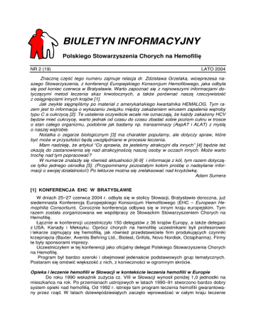 BIULETYN INFORMACYJNY Polskiego Stowarzyszenia Chorych na Hemofilię NR 2 (19) LATO 2004 Znaczną część tego numeru zajmuje relacja dr. Zdzisława Grzelaka, wiceprezesa naszego Stowarzyszenia, z konferencji Europejskiego Konsorcjum Hemofilowego, jaka odbyła się pod koniec czerwca w Bratysławie. Warto zapoznać się z najnowszymi informacjami dotyczącymi metod leczenia skaz krwotocznych, a także porównać naszą rzeczywistość z osiągnięciami innych krajów [1]. Jak zwykle sięgnęliśmy po materiał z amerykańskiego kwartalnika HEMALOG. Tym razem jest to informacja o wykazaniu związku między zakażeniem wirusem zapalenia wątroby typu C a cukrzycą [2]. Te ustalenia oczywiście wcale nie oznaczają, że każdy zakażony HCV będzie mieć cukrzycę, warto jednak od czasu do czasu zbadać sobie poziom cukru w trosce o stan całego organizmu, podobnie jak badamy np. transaminazy (AspAT i ALAT) z myślą o naszej wątrobie. Notatka o zegarze biologicznym [3] ma charakter popularny, ale dotyczy spraw, które być może w przyszłości będą uwzględniane w procesie leczenia. Mam nadzieję, że artykuł “Co sprawia, że jesteśmy atrakcyjni dla innych” [4] będzie też okazją do zastanowienia się nad atrakcyjnością naszej osoby w oczach innych. Może warto trochę nad tym popracować? W numerze znalazły się również aktualności [6-9] i informacje z kół, tym razem dotyczące tylko jednego ośrodka [5]. (Przypominamy pozostałym kołom prośbę o nadsyłanie informacji o swojej działalności!) Po lekturze można się zrelaksować nad krzyżówką. Adam Sumera [1] KONFERENCJA EHC W BRATYSŁAWIE W dniach 25–27 czerwca 2004 r. odbyła się w stolicy Słowacji, Bratysławie doroczna, już siedemnasta Konferencja Europejskiego Konsorcjum Hemofilowego (EHC – European Hemophilia Consortium). Corocznie konferencja odbywa się w innym kraju europejskim. Tym razem została zorganizowana we współpracy ze Słowackim Stowarzyszeniem Chorych na Hemofilię. Łącznie w konferencji uczestniczyło 150 delegatów z 36 krajów Europy, a także delegaci z USA, Kanady i Meksyku. Oprócz chorych na hemofilię uczestnikami byli profesorowie i lekarze zajmujący się hemofilią, jak również przedstawiciele firm produkujących czynniki krzepnięcia (Baxter, Aventis Behring Ltd., Biotest, Grifols, Novo Nordisk, Octapharma). Firmy te były sponsorami imprezy. Uczestniczyłem w tej konferencji jako oficjalny delegat Polskiego Stowarzyszenia Chorych na Hemofilię. Program był bardzo szeroki i obejmował jedenaście podstawowych grup tematycznych. Postaram się omówić większość z nich, z konieczności w ogromnym skrócie. Opieka i leczenie hemofilii w Słowacji w kontekście leczenia hemofilii w Europie Do roku 1990 wskaźnik zużycia cz. VIII w Słowacji wynosił poniżej 1,0 jednostki na mieszkańca na rok. Po przemianach ustrojowych w latach 1990–91 stworzono bardzo dobry system opieki nad hemofilią. Od 1992 r. istnieje tam program leczenia hemofilii gwarantowany przez rząd. W latach dziewięćdziesiątych zaczęto wprowadzać w całym kraju leczenie domowe. Poza tym prowadzone są zabiegi operacyjne, zarówno planowe, jak i nagłe, program immunotolerancji dla chorych z inhibitorem oraz wtórna profilaktyka. Od 12 lat Narodowe Centrum Hemofilowe wspólnie ze Słowackim Stowarzyszeniem Chorych na Hemofilię organizują letnie turnusy rehabilitacyjne. Obecnie osiągnięto już wskaźnik zużycia 3 jednostki na mieszkańca na rok. Wprowadzono także pierwotną profilaktykę i okresową profilaktykę wtórną. Na ponad 20 krajów prezentowanych pod względem wskaźnika zużycia czynnika VIII Polska była niestety na przedostatnim miejscu. Postępy w leczeniu hemofilii – wprowadzanie technologii inżynierii genetycznej Okazuje się, że można przedłużyć czas półtrwania czynnika VIII we krwi po modyfikacji genetycznej molekuł czynnika VIII. Na razie są to badania na zwierzętach transgenicznych produkujących cz. VIII. Sklonowane owce produkują np. w mleku czynnik IX bardziej oporny na rozpad. Podobnie jest w przypadku transgenicznych świń. Obliczono, że mleko od 60 świń mogłoby wypełnić całe zapotrzebowanie na cz. IX w USA. Takie zmienione genetycznie świnie mogłyby także produkować w mleku czynnik VIII. Ocenia się, że w ciągu 15–20 lat dostępna już będzie terapia genowa (TG). Nie należy jednak zapominać o zagrożeniach, jakie ona może nieść z powodu używania wirusów (adenowirusów) jako wektorów przenoszących informację genetyczną. Bezpieczeństwo krwi i zaopatrzenie w osocze w Europie W dbałości o bezpieczeństwo krwi bardzo ważna jest dobra technika pobierania krwi od dawców. Jej wynikiem powinna być: - zachowana aktywność czynników krzepnięcia - eliminacja bakterii, wirusów i innych patogenów . Drugim ważnym czynnikiem jest odpowiednie magazynowanie (temperatura) i transport. Bezpieczeństwo produktów krwiopochodnych staje się priorytetem numer jeden. W Polsce, Czechach czy Słowacji warunki poboru krwi i jej testowania są takie same jak w “starych” krajach Unii Europejskiej, a nieraz nawet lepsze. Plazma importowana z całego świata do UE powinna zawsze spełniać te same wysokie kryteria. Należy kierować się dyrektywami europejskimi. Hepatitis C – nowe strategie lecznicze Terapia bezobjawowego nosicielstwa wirusa zapalenia wątroby typu C (HCV), jak również pełnoobjawowej infekcji stwarzają ciągle jeszcze ogromne trudności. Owszem, leczenie za pomocą interferonu pegylowanego i rybawiryny daje obiecujące i coraz lepsze rezultaty, jednakże nie są one na tyle zadowalające, aby można było powiedzieć, że ten problem mamy już za sobą. Aktualnie testowane są nowsze wersje interferonu o nieco lepszej skuteczności, równocześnie nie wywołujące tak silnych efektów ubocznych, jak poprzednie generacje tego leku. Leczenie domowe i profilaktyka u chorych bez inhibitora i z inhibitorem Najbardziej