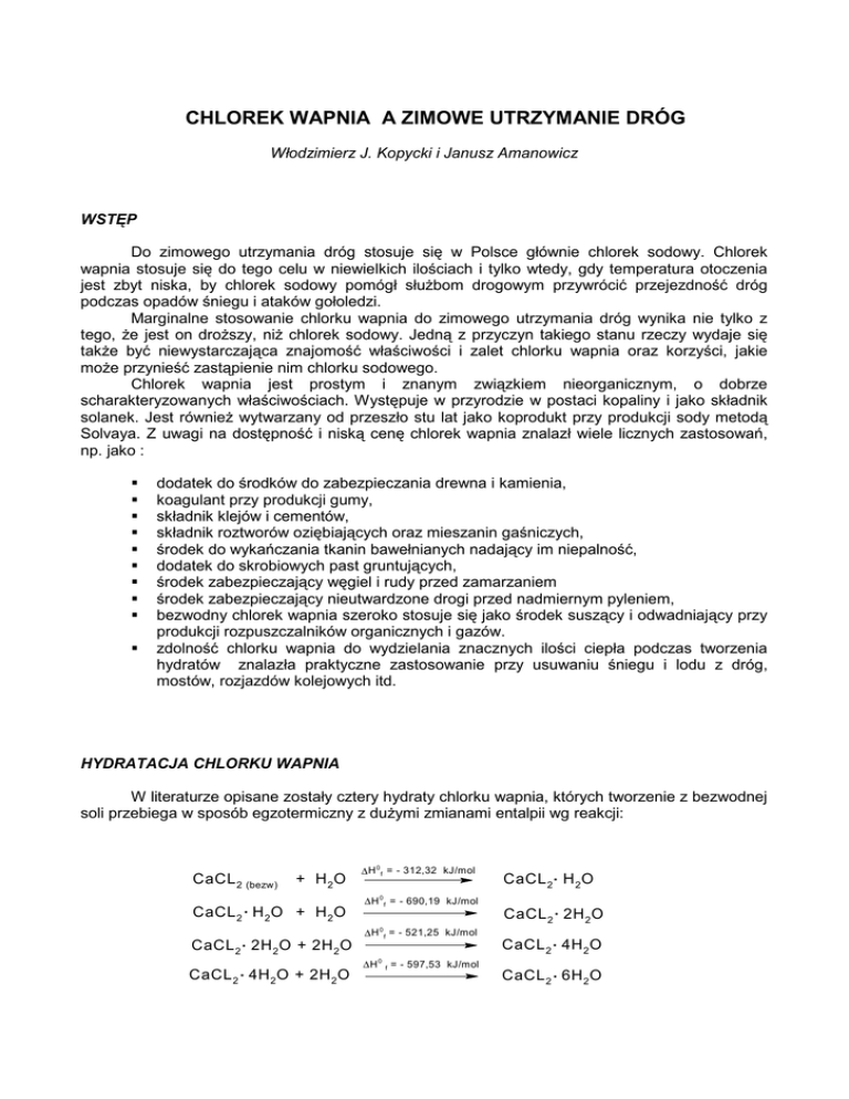 CHLOREK WAPNIA A ZIMOWE UTRZYMANIE DRÓG Włodzimierz J. Kopycki i Janusz Amanowicz WSTĘP Do zimowego utrzymania dróg stosuje się w Polsce głównie chlorek sodowy. Chlorek wapnia stosuje się do tego celu w niewielkich ilościach i tylko wtedy, gdy temperatura otoczenia jest zbyt niska, by chlorek sodowy pomógł służbom drogowym przywrócić przejezdność dróg podczas opadów śniegu i ataków gołoledzi. Marginalne stosowanie chlorku wapnia do zimowego utrzymania dróg wynika nie tylko z tego, że jest on droższy, niż chlorek sodowy. Jedną z przyczyn takiego stanu rzeczy wydaje się także być niewystarczająca znajomość właściwości i zalet chlorku wapnia oraz korzyści, jakie może przynieść zastąpienie nim chlorku sodowego. Chlorek wapnia jest prostym i znanym związkiem nieorganicznym, o dobrze scharakteryzowanych właściwościach. Występuje w przyrodzie w postaci kopaliny i jako składnik solanek. Jest również wytwarzany od przeszło stu lat jako koprodukt przy produkcji sody metodą Solvaya. Z uwagi na dostępność i niską cenę chlorek wapnia znalazł wiele licznych zastosowań, np. jako : dodatek do środków do zabezpieczania drewna i kamienia, koagulant przy produkcji gumy, składnik klejów i cementów, składnik roztworów oziębiających oraz mieszanin gaśniczych, środek do wykańczania tkanin bawełnianych nadający im niepalność, dodatek do skrobiowych past gruntujących, środek zabezpieczający węgiel i rudy przed zamarzaniem środek zabezpieczający nieutwardzone drogi przed nadmiernym pyleniem, bezwodny chlorek wapnia szeroko stosuje się jako środek suszący i odwadniający przy produkcji rozpuszczalników organicznych i gazów. zdolność chlorku wapnia do wydzielania znacznych ilości ciepła podczas tworzenia hydratów znalazła praktyczne zastosowanie przy usuwaniu śniegu i lodu z dróg, mostów, rozjazdów kolejowych itd. HYDRATACJA CHLORKU WAPNIA W literaturze opisane zostały cztery hydraty chlorku wapnia, których tworzenie z bezwodnej soli przebiega w sposób egzotermiczny z dużymi zmianami entalpii wg reakcji: CaCL 2 (bezw) + H 2O CaCL 2 . H 2 O + H 2 O ∆H 0 f = - 312,32 kJ/mol ∆H 0 f = - 690,19 kJ/mol CaCL 2 . H 2 O CaCL 2 . 2H 2 O 0 CaCL 2 . 2H 2 O + 2H 2 O CaCL 2 . 4H 2 O + 2H 2 O ∆H f = - 521,25 kJ/mol ∆H 0 f = - 597,53 kJ/mol CaCL 2 . 4H 2 O CaCL 2 . 6H 2 O W Tabeli 1 zestawiono ważniejsze właściwości hydratów chlorku wapnia Tabela 1. Wybrane właściwości fizykochemiczne i termodynamiczne hydratów chlorku wapnia. . . . . CaCL2 (soln) CaCL2 (cryst) Masa cząsteczkowa 219,09 183,05 147,02 129,00 - 110,99 Entalpia tworzenia ∆H°°f -2604,77 kJ/mol - 2007,24 kJ/mol - 1485,99 kJ/mol - 1108,12 kJ/mol - 877,05 kJ/mol - 795,80 kJ/mol Ciepło (*) rozpuszczania + 15,75 kJ/mol -10,87 kJ/mol -44,74 kJ/mol -52,2 kJ/mol - -81,75 kJ/mol 6,487 kJ/mol °C 7,307 kJ/mol °C 7,961 kJ/mol °C 6,481 kJ/mol °C - 6,026 kJ/mol °C 29,9 °C 45,3 °C 176 °C 187 °C - 773 °C Prężność pary wodnej w 25°°C 5,0 mm Hg 3,9 mm Hg 0,8 mm Hg - - - Gęstość 1,71 g/cm CaCL2 6 H2O CaCL2 4 H2O CaCL2 2 H2O CaCL2 H2O Pojemność cieplna Temperatura topnienia Zawartość CaCL2 (*) 50,66 % 3 1,83 g/cm 60,63 % 3 1,85 g/cm 75,49 % 3 2,24 g/cm 86,03 % 3 2,16 g/cm - 3 100 % - dla roztworów o nieskończenie wielkim rozcieńczeniu Efekt cieplny powstawania sześciohydratu można obliczyć na podstawie prawa Hessa, jeśli znane jest ciepło rozpuszczania poszczególnych hydratów (Tabela 1): - dla bezwodnego chlorku wapnia ∆H (hydrat) = - 81,75 -(+15,75) = - 97,5 kJ/mol (- 878,5 kJ/kg) - dla dwuwodnego chlorku wapnia ∆H (hydrat) = - 44,74 -(+15,75) = - 60,5 kJ/mol (- 411,5 kJ/kg) Pełna hydratacja 1 kg dwuwodnego chlorku wapnia dostarcza, zatem do otoczenia w przybliżeniu taką ilość ciepła, jaka jest potrzebna do stopienia 1,23 kg lodu (ciepło topnienia lodu w temperaturze 0 °C wynosi 6,01 kJ/mol lub 333,9 kJ/kg) Dehydratacja, czyli przeprowadzenie sześciowodnego chlorku wapnia w niższe hydraty przebiega łatwo wg równań: 30 0 C - 45 0 C CaCL 2 . 6H 2 O - 2H 2 O CaCL 2 . 4H 2 O > 45 0 C - 2H 2 O CaCL 2 . 2H 2 O Jak to wynika z przytoczonego wyżej przebiegu reakcji dehydratacja sześciohydratu do dwuhydratu nie wymaga szczególnych warunków ani wysokich temperatur i może być łatwo przeprowadzona z wykorzystaniem tzw. taniego „ciepła odpadowego” pochodzącego z innych procesów lub ze spalarni odpadów. W temperaturze ok. 200°C dwuwodny chlorek wapnia traci wodę całkowicie i przechodzi w bezwodny. WODNE ROZTWORY CHLORKU WAPNIA Bezwodny chlorek wapnia jest związkiem higroskopijnym, zdolnym pochłonąć duże ilości wody (pary wodnej), przechodząc przez kolejne stopnie hydratacji aż do całkowitego rozpuszczenia się w zaabsorbowanej wodzie. Szybkość pochłaniania wody zależna jest od temperatury, wilgotności otoczenia oraz stopnia rozwinięcia powierzchni. Z przytoczonych wcześniej równań hydratacji wynika, że 1 mol bezwodnego chlorku wapnia w czasie pełnej hydratacji pochłania 6 moli wody, co w przeliczeniu na jednostki wagowe daje 0,97 kg wody na 1 kg bezwodnego chlorku. W przypadku dwuwodnego chlorku ilość pochłoniętej wody wynosi ok. 0,5 kg wody na 1 kg dwuhydratu Proces pochłaniania wody przez powstały roztwór chlorku wapnia przebiega dalej, aż do osiągnięcia równowagi pomiędzy prężnością pary wodnej nad roztworem i prężnością pary wodnej w powietrzu i tak np. w temperaturze 25°C i przy wilgotności względnej 60% 1 kg bezwodnego chlorku wapnia jest w stanie pochłonąć 1,5 kg wody z wytworzeniem 30 % roztworu. W tabeli 2 podano prężność pary wodnej w temperaturze 25°C nad wodnymi roztworami chlorku wapnia i wilgotność względną w zależności od stężenia. Tabela 2. Prężność pary wodnej i wilgotność względna nad roztworami chlorku wapnia Stężenie (% wagowy) Prężność pary wodnej (mm Hg) Wilgotność względna (%) 0 23,76 100 9,33 22,57 95 14,95 21,38 90 