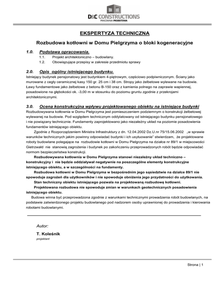EKSPERTYZA TECHNICZNA Rozbudowa kotłowni w Domu Pielgrzyma o bloki kogeneracyjne 1.0. 2.0. Podstawa opracowania. 1.1. Projekt architektoniczno – budowlany. 1.2. Obowiązujące przepisy w zakresie przedmiotu sprawy Opis ogólny istniejącego budynku. Istniejący budynek pensjonatowy jest budynkiem 4-piętrowym, częściowo podpiwniczonym. Ściany jako murowane z cegły ceramicznej kasy 150 gr. 25 cm i 38 cm. Stropy jako żelbetowe wylewane na budowie. Ławy fundamentowe jako żelbetowe z betonu B-150 oraz z kamienia polnego na zaprawie wapiennej, posadowione na głębokości ok. -3,00 m w stosunku do poziomu gruntu zgodnie z przekrojami architektonicznymi. 3.0. Ocena konstrukcyjna wpływu projektowanego obiektu na istniejące budynki Rozbudowywana kotłownia w Domu Pielgrzyma jest pomieszczeniem podziemnym o konstrukcji żelbetowej wylewanej na budowie. Pod względem technicznym oddylatowany od istniejącego budynku pensjonatowego i nie powiązany technicznie. Fundamenty zaprojektowano jako niezależny układ na poziomie posadowienia fundamentów istniejącego obiektu. Zgodnie z Rozporządzeniem Ministra Infrastruktury z dn. 12.04.2002 Dz.U.nr 75/15.06.2002 „w sprawie warunków technicznych jakim powinny odpowiadać budynki i ich usytuowanie” stwierdzam, że projektowane roboty budowlane polegające na rozbudowie kotłowni w Domu Pielgrzyma na działce nr 89/1 w miejscowości Gietrzwałd nie stanowią zagrożenia i budynek po zakończeniu przeprowadzonych robót będzie odpowiadać normom bezpieczeństwa konstrukcji. Rozbudowywana kotłownia w Domu Pielgrzyma stanowi niezależny układ techniczno – konstrukcyjny i nie będzie oddziaływał negatywnie na poszczególne elementy konstrukcyjne istniejącego obiektu, a w szczególności na fundamenty. Rozbudowa kotłowni w Domu Pielgrzyma w bezpośrednim jego sąsiedztwie na działce 89/1 nie spowoduje zagrożeń dla użytkowników i nie spowoduje obniżenia jego przydatności do użytkowania. Stan techniczny obiektu istniejącego pozwala na projektowaną rozbudowę kotłowni. Projektowana rozbudowa nie spowoduje zmian w warunkach geotechnicznych posadowienia istniejącego obiektu. Budowa winna być przeprowadzona zgodnie z warunkami technicznymi prowadzenia robót budowlanych, na podstawie zatwierdzonego projektu budowlanego pod nadzorem osoby uprawnionej do prowadzenia i kierowania robotami budowlanymi. Autor: T. Koleśnik projektant Strona | 1