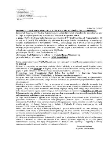 Komornik Sądowy przy Sądzie Rejonowym w Łobzie Krzysztof Musiałowski Kancelaria Komornicza w Łobzie 73-150 Łobez ul. Wybickiego 1 tel. 913973402 fax 913973585 e-mail: [email protected] http://www.lobez.komornik.org Km 549/15 Łobez, 16-11-2016 OBWIESZCZENIE O PIERWSZEJ LICYTACJI NIERUCHOMOŚCI kwSZ1L/00005841/8 Komornik Sądowy przy Sądzie Rejonowym w Łobzie Krzysztof Musiałowski na podstawie art. 953 kpc podaje do publicznej wiadomości, że w dniu 9 stycznia 2017r. o godz. 10:30 w budynku Sądu Rejonowego w Łobzie I Wydział Cywilny, ul. Niepodleglości 15 w sali nr 3 (pokój 32), odbędzie się pierwsza licytacja lokalu mieszkalnego stanowiącego odrębną nieruchomość o powierzchni 57,60m2, składającego się z dwóch pokoi na parterze, kuchni na parterze, przedpokoju na parterze, pokoju na poddaszu, korytarza na poddaszu, do którego przynależą: piwnica o powierzchni 13,90 m2, strych o powierzchni 14,40 m2 oraz boks w budynku gospodarczym o powierzchni: 16,80 m2, położonego: 73-150 Łobez, Świętoborzec 9/2, dla którego Sąd Rejonowy w Łobzie IV Wydział Ksiąg Wieczystych prowadzi księgę wieczystą o numerze SZ1L/00005841/8. Suma oszacowania wynosi 95 200,00zł, zaś cena wywołania jest równa 3/4 sumy oszacowania i wynosi: 71 400,00zł. Licytant przystępujący do przetargu powinien złożyć rękojmię w wysokości jednej dziesiątej sumy oszacowania, to jest 9 520,00zł. Rękojmię można uiścić w kasie kancelarii czynnej od poniedziałku do piątku w godz. od 9:00 do 16:00 lub wpłacić na rachunek bankowy komornika: Powszechna Kasa Oszczędności Bank Polski SA Oddział 1 w Drawsku Pomorskim 84102028470000110200662759 najpóźniej w dniu poprzedzającym przetarg. Rękojmia może być również złożona w książeczce oszczędnościowej zaopatrzonej w upoważnienie właściciela książeczki do wpłaty całego wkładu stosownie do prawomocnego postanowienia sądu o utracie rękojmi. Zgodnie z przepisem art.976 §1 kpc w przetargu nie mogą uczestniczyć: dłużnik, komornik, ich małżonkowie, dzieci, rodzice i rodzeństwo oraz osoby obecne na licytacji w charakterze urzędowym, licytant, który nie wykonał warunków poprzedniej licytacji, osoby które mogą nabyć nieruchomość tylko za zezwoleniem organu państwowego, a zezwolenia tego nie przedstawiły.Zgodnie z art 977 kpc Pełnomocnictwo do udziału w przetargu powinno być pełnomocnictwem szczególnym stwierdzone dokumentem z podpisem urzędowo poświadczonym W ciągu dwóch ostatnich tygodni przed licytacją wolno oglądać nieruchomość w dni powszednie w godzinach ustalonych z Komornikiem oraz przeglądać protokół opisu i oszacowania i operat szacunkowy. Na tydzień przed terminem licytacji akta egzekucyjne wraz z operatem szacunkowym będą znajdować się w Sądzie Rejonowym w Łobzie I Wydziale Cywilnym mieszczącym się pod adresem:73-150 Łobez, ul. Niepodległości 15. Prawa osób trzecich nie będą przeszkodą do licytacji i przysądzenia własności na rzecz nabywcy bez zastrzeżeń, jeżeli osoby te przed rozpoczęciem przetargu nie złożą dowodu, że wniosły powództwo o zwolnienie nieruchomości lub przedmiotów razem z nią zajętych od egzekucji i uzyskały w tym zakresie orzeczenie wstrzymujące egzekucję. Użytkowanie, służebności i prawa dożywotnika, jeżeli nie są ujawnione w księdze wieczystej lub przez złożenie dokumentu do zbioru dokumentów i nie zostaną zgłoszone najpóźniej na trzy dni przed rozpoczęciem licytacji, nie będą uwzględnione w dalszym toku egzekucji i wygasną z chwilą uprawomocnienia się postanowienia o przysądzeniu własności. Komornik Sądowy Krzysztof Musiałowski