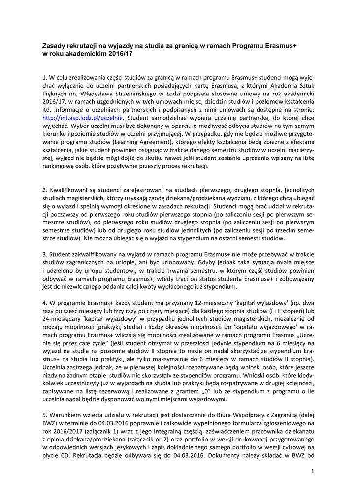 Zasady rekrutacji na wyjazdy na studia za granicą w ramach Programu Erasmus+ w roku akademickim 2016/17 1. W celu zrealizowania części studiów za granicą w ramach programu Erasmus+ studenci mogą wyjechać wyłącznie do uczelni partnerskich posiadających Kartę Erasmusa, z którymi Akademia Sztuk Pięknych im. Władysława Strzemińskiego w Łodzi podpisała stosowne umowy na rok akademicki 2016/17, w ramach uzgodnionych w tych umowach miejsc, dziedzin studiów i poziomów kształcenia itd. Informacje o uczelniach partnerskich i podpisanych z nimi umowach są dostępne na stronie: http://int.asp.lodz.pl/uczelnie. Student samodzielnie wybiera uczelnię partnerską, do której chce wyjechać. Wybór uczelni musi być dokonany w oparciu o możliwość odbycia studiów na tym samym kierunku i poziomie studiów w uczelni przyjmującej. W przypadku, gdy nie będzie możliwe przygotowanie programu studiów (Learning Agreement), którego efekty kształcenia będą zbieżne z efektami kształcenia, jakie student powinien osiągnąć w trakcie danego semestru studiów w uczelni macierzystej, wyjazd nie będzie mógł dojść do skutku nawet jeśli student zostanie uprzednio wpisany na listę rankingową osób, które pozytywnie przeszły proces rekrutacji. 2. Kwalifikowani są studenci zarejestrowani na studiach pierwszego, drugiego stopnia, jednolitych studiach magisterskich, którzy uzyskają zgodę dziekana/prodziekana wydziału, z którego chcą ubiegać się o wyjazd i spełnią wymogi określone w zasadach rekrutacji. Studenci mogą brać udział w rekrutacji począwszy od pierwszego roku studiów pierwszego stopnia (po zaliczeniu sesji po pierwszym semestrze studiów), od pierwszego roku studiów drugiego stopnia (po zaliczeniu sesji po pierwszym semestrze studiów) lub od drugiego roku studiów jednolitych (po zaliczeniu sesji po trzecim semestrze studiów). Nie można ubiegać się o wyjazd na stypendium na ostatni semestr studiów. 3. Student zakwalifikowany na wyjazd w ramach programu Erasmus+ nie może przebywać w trakcie studiów zagranicznych na urlopie, ani być urlopowany. Gdyby jednak taka sytuacja miała miejsce i udzielono by urlopu studentowi, w trakcie trwania semestru, w którym część studiów powinien odbywać w ramach programu Erasmus+, wtedy traci on status studenta Erasmusa+ i zobowiązany jest do niezwłocznego oddania całej kwoty wypłaconego już stypendium. 4. W programie Erasmus+ każdy student ma przyznany 12-miesięczny ‘kapitał wyjazdowy’ (np. dwa razy po sześć miesięcy lub trzy razy po cztery miesiące) dla każdego stopnia studiów (I i II stopień) lub 24-miesięczny ‘kapitał wyjazdowy’ w przypadku jednolitych studiów magisterskich, niezależnie od rodzaju mobilności (praktyki, studia) i liczby okresów mobilności. Do ‘kapitału wyjazdowego’ w ramach programu Erasmus+ wliczają się mobilności zrealizowane w ramach programu Erasmus „Uczenie się przez całe życie” (jeśli student otrzymał w przeszłości jedynie stypendium na 6 miesięcy na wyjazd na studia na poziomie studiów II stopnia to może on nadal skorzystać ze stypendium Erasmus+ na studia lub praktyki, ale tylko maksymalnie do 6 miesięcy w ramach studiów II stopnia). Uczelnia zastrzega jednak, że w pierwszej kolejności rozpatrywane będą wnioski osób, które jeszcze nigdy na żadnym etapie studiów nie skorzystały ze stypendiów programu. Wnioski osób, które kiedykolwiek uczestniczyły już w wyjazdach na studia lub praktyki będą rozpatrywane w drugiej kolejności, zapisywane na listę rezerwową i realizowane z grantem „0” lub ze stypendium z programu o ile uczelnia nadal będzie dysponować wolnymi miejscami wyjazdowymi. 5. Warunkiem wzięcia udziału w rekrutacji jest dostarczenie do Biura Współpracy z Zagranicą (dalej BWZ) w terminie do 04.03.2016 poprawnie i całkowicie wypełnionego formularza zgłoszeniowego na rok 2016/2017 (załącznik 1) wraz z jego integralną częścią: zaświadczeniem pracownika dziekanatu z opinią dziekana/prodziekana (załącznik nr 2) oraz portfolio w wersji drukowanej przygotowanego w odpowiednich wersjach językowych i zapis dokładnie tego samego portfolio w wersji cyfrowej na płycie CD. Rekrutacja będzie odbywała się do 04.03.2016. Dokumenty należy składać w BWZ od 1 29.02.2016 do 04.03.2016 w godzinach 9.00-11.00 i 13.00-14.00, we wszystkie dni pracujące poza środami. Lista rankingowa kandydatów będzie opublikowana na stronie internetowej BWZ (www.int.asp.lodz.pl) nie później niż do dnia 08.04.2016. Za prawidłowe i kompletne złożenie dokumentacji odpowiada student uczestniczący w rekrutacji i zobowiązany jest do sprawdzenia i upewnienia się, że składa prawidłowo przygotowaną dokumentację. Dokumenty przygotowane na niewłaściwych formularzach (innych niż te przygotowane dla rekrutacji na rok 2016/17) zostaną odrzucone ze względów formalnych i nie będą podlegały ocenie. Uczelnia zastrzega sobie prawo do wyznaczania kolejnych terminów rekrutacji, która każdorazowo prowadzona będzie w oparciu o te same zasady. 6. Kryteria oceny zgłoszeń kandydatów to: – poprawnie przygotowane wszystkie dokumenty wymagane do rekrutacji, czytelnie wypełnione wszystkie pola formularza, bez skreśleń i korekt uniemożliwiających jednoznaczne odczytanie zamieszczonych informacji; – średnia ocen za ostatni semestr bezpośrednio poprzedzający rekrutację do programu Erasmus+ (semestr studiów tego samego stopnia, na którym jest student w momencie udziału w rekrutacji); o udział w programie Erasmus+ mogą ubiegać się ci studenci, którzy zaliczyli sesję w pierwszym terminie; średnia ocen z sesji poprawkowej nie będzie brana pod uwagę i będzie dyskwalifikowała z wpisania na listę rankingową; – udokumentowana znajomość języka wymaganego przez uczelnię, do której student ubiega się o wyjazd; zgodnie z wytycznymi zawartymi w formularzu zgłoszeniowym (informacja o zna