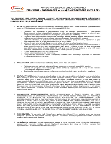 KOMERCYJNA LICENCJA OPROGRAMOWANIA FIRMWARE - BOOTLOADER w wersji 3.4 PROCESORA UNIV 3 CPU TEN DOKUMENT JEST UMOWĄ PRAWNĄ POMIĘDZY UŻYTKOWNIKIEM OPROGRAMOWANIA (UŻYTKOWNIK) A AUTOREM OPROGRAMOWANIA (AUTOR). POPRZEZ ZAKUP LICENCJI UŻYTKOWNIK PRZYZNAJE, ŻE PRZECZYTAŁ TĘ LICENCJĘ I ZGADZA SIĘ Z JEJ WARUNKAMI 1. LICENCJA. Umowa licencyjna dotyczy oprogramowania sprzętowego firmware wraz z kodami źródłowymi (Oprogramowanie) systemu HAPCAN będącego bootloader-em w wersji 3.4 procesora UNIV 3 CPU. a. b. c. d. e. f. g. h. 2. Użytkownik ma niewyłączne i nieprzenoszalne prawo do używania, modyfikowania i zainstalowania Oprogramowania w nieograniczonej liczbie procesorów, które zostaną wykorzystane wyłącznie w gotowych, pełni funkcjonalnych urządzeniach Użytkownika. Licencja nie ogranicza zakresu modyfikacji. Użytkownik może wyprodukować i dystrybuować z własnym znakiem firmowym dowolną liczbę urządzeń opartych na Oprogramowaniu. Licencja nie ogranicza w żaden sposób obszaru dystrybucji takich urządzeń. Użytkownik oświadcza, że przetestował zainstalowane w procesorze Oprogramowanie, zapoznał się z jego funkcjonowaniem oraz, że nie ma żadnych zastrzeżeń do jego działania. Użytkownik może wykonać kopię Oprogramowania tylko w celu stworzenia kopii bezpieczeństwa. Użytkownik ma prawo do zainstalowania w procesorach programów funkcyjnych firmware dostępnych bezpłatnie na stronach projektu hapcan.com, jako oprogramowanie „open source”. Programy te mogą być także modyfikowane przez Użytkownika. Zasady licencyjne (GNU GPL ver3) programów funkcyjnych dostępne są wraz z ich kodem źródłowym. Istnieje również możliwość kupienia licencji komercyjnych dla tych kodów. Licencja udzielona zostaje w momencie jej kupienia. Licencja udzielona zostaje na czas nieokreślony. Oprogramowanie dostarczone będzie Licencjobiorcy w formie kodu źródłowego napisanego w asemblerze w środowisku MPLAB firmy Microchip. OGRANICZENIA. Użytkownik nie może zlecić trzeciej stronie, ani nie może samodzielnie: a. b. c. Publikować, ujawniać, kopiować, udostępniać innym osobom oprogramowania w całości lub w części; Sprzedać, ani przepisać prawa licencyjnego, udzielić sublicencji, wypożyczyć lub w inny sposób przekazać Oprogramowanie w całości lub w części; Sprzedawać procesorów z zainstalowanym Oprogramowaniem inaczej niż w pełni funkcjonalnym urządzeniu. 3. PRAWA AUTORSKIE. Autor Oprogramowania oświadcza, że jest jedynym, samodzielnym twórcą Oprogramowania i z tego tytułu przysługują mu do niego wyłączne prawa autorskie, wynikające z ustawy o prawie autorskim i prawach pokrewnych. Wszystkie prawa, tytuły i udziały w programie należą do Autora. Dystrybutor deklaruje, że ma pełne prawo do rozpowszechniania Oprogramowania. Niniejsza umowa jest umową licencyjną, a nie umową sprzedaży. Użytkownik przyjmuje do wiadomości i akceptuje, że Oprogramowanie stanowi tajemnicę handlową i jest chronione prawem autorskim. Wszelkie naruszenia niniejszej licencji mogą spowodować nieodwracalne szkody Autorowi Oprogramowania, których zadośćuczynienie finansowe może być niewystarczające. Użytkownik zobowiązuje się do wdrożenia środków bezpieczeństwa w celu ochrony tych tajemnic handlowych i materiałów chronionych prawem autorskim. Wszelkie prawa nieudzielone Użytkownikowi są zastrzeżone dla Autora. 4. OGRANICZENIE ODPOWIEDZIALNOŚCI. AUTOR OPROGRAMOWANIA W ŻADNYM WYPADKU NIE PONOSI ODPOWIEDZIALNOŚCI ZA JAKIEKOLWIEK PRZYPADKOWE LUB UMYŚLNE SZKODY WYNIKAJĄCE LUB POZOSTAJĄCE W ZWIĄZKU Z UŻYTKOWANIEM LUB NIEUMIEJĘTNOŚCIĄ POSŁUGIWANIA SIĘ OPROGRAMOWANIEM. AUTOR OPROGRAMOWANIA NIE JEST W ŻADNYM WYPADKU ODPOWIEDZIALNY ZA JAKĄKOLWIEK INNĄ SZKODĘ (ŁĄCZNIE ZE SZKODAMI Z TYTUŁU UTRATY ZYSKÓW ZWIĄZANYCH Z PROWADZENIEM DZIAŁALNOŚCI UŻYTKOWNIKA LUB UTRATĄ INFORMACJI GOSPODARCZEJ) BĘDĄCĄ NASTĘPSTWEM UŻYWANIA ALBO NIEMOŻLIWOŚCI UŻYWANIA OPROGRAMOWANIA, NAWET JEŚLI AUTOR ZOSTAŁ ZAWIADOMIONY O MOŻLIWOŚCI WYSTĄPIENIA TAKICH SZKÓD. POWYŻSZE WYLICZENIE SZKÓD, ZA KTÓRE AUTOR NIE ODPOWIADA MA CHARAKTER PRZYKŁADOWY I NIE JEST WYCZERPUJĄCE. CAŁKOWITA ODPOWIEDZIALNOŚĆ AUTORA NA PODSTAWIE JAKIEGOKOLWIEK POSTANOWIENIA NINIEJSZEJ UMOWY JEST W KAŻDYM WYPADKU OGRANICZONA DO SUMY PIENIĘŻNEJ, KTÓRĄ UŻYTKOWNIK RZECZYWIŚCIE ZAPŁACIŁ ZA LICENCJĘ. 5. ROZDZIELNOŚĆ. W przypadku, kiedy którekolwiek z postanowień niniejszej Umowy zostanie uznane za nieważne, niezgodne z prawem lub niewykonalne, ważność, legalność i wykonalność pozostałych postanowień w żaden sposób nie zostaje przez to naruszona lub osłabiona. 6. WYGAŚNIĘCIE LICENCJI. Licencja automatycznie wygasa z chwilą naruszenia przez Użytkownika któregokolwiek z postanowień i warunków niniejszej Licencji. Użytkownik zobowiązany jest wtedy do trwałego usunięcia kopii Oprogramowania i wszelkich materiałów z nim związanych.