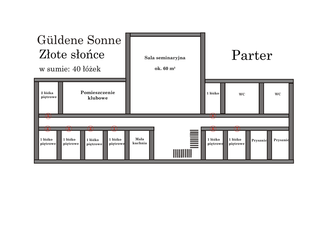 Güldene Sonne Z³ote s³oñce w sumie: 40 ³ó¿ek ok. 60 m² Pomieszczenie klubowe 2 ³ó¿ka piêtrowe 1 ³ó¿ko 1 ³ó¿ko piêtrowe WC WC 8 5 4 Parter Sala seminaryjna 3 1 ³ó¿ko piêtrowe 2 1 ³ó¿ko piêtrowe 1 1 ³ó¿ko piêtrowe 6 Ma³a kuchnia 1 ³ó¿ko piêtrowe 7 1 ³ó¿ko piêtrowe Prysznic Prysznic