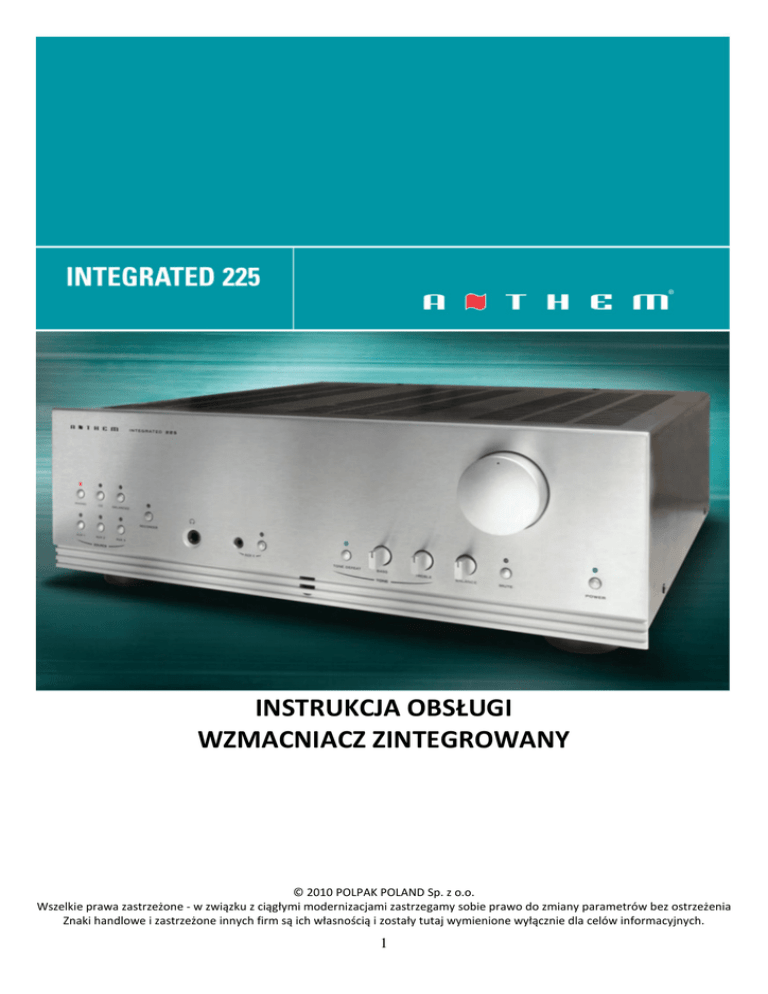 INSTRUKCJA OBSŁUGI WZMACNIACZ ZINTEGROWANY © 2010 POLPAK POLAND Sp. z o.o. Wszelkie prawa zastrzeżone - w związku z ciągłymi modernizacjami zastrzegamy sobie prawo do zmiany parametrów bez ostrzeżenia Znaki handlowe i zastrzeżone innych firm są ich własnością i zostały tutaj wymienione wyłącznie dla celów informacyjnych. 1 INSTRUKCJA BEZPIECZNEGO UŻYTKOWANIA URZĄDZENIA ZAPOBIEGANIE POŻAROM I PORAŻENIOM ELEKTRYCZNYM Ten symbol ostrzega, że wewnątrz urządzenia istnieje możliwość wystąpienia "niebezpiecznego napięcia" gdy jest podłączone do sieci zasilającej. Napięcie może być wystarczającej wysokości, aby stać się niebezpiecznym dla człowieka. UWAGA ABY ZREDUKOWAĆ MOŻLIWOŚC PORAŻENIA PRĄDEM ELEKTRYCZNYM, NIE ZDEJMUJ OBUDOWY. WEWNĄTRZ NIE MA ŻADNYCH ELEMENTÓW WYMAGAJĄCYCH OBSŁUGI UŻYTKOWNIKA. OBUDOWA MOŻE BYĆ ZDEJMOWANA WYŁĄCZNIE PRZEZ WYKWALIFIKOWANYCH PRACOWNIKÓW SERWISU. Ten symbol ostrzega, użytkownika o istotnych czynnościach obsługowych, jakie należy wykonywać, aby zapewnić bezawaryjną pracę urządzenia. Dokładny opis znajduje się w dołączonej literaturze. ŚRODKI BEZPIECZEŃSTWA I OSTROŻNOŚCI Uwagi na temat przewodu i gniazda zasilającego. Pozostaw miejsce dookoła urządzenia w celu prawidłowej wentylacji. Dla zapewnienia maksymalnego bezpieczeństwa, oryginalny przewód zasilający musi zostać podłączony do prawidłowo uziemionego gniazda Unikaj instalacji: w gorących, chłodnych, nasłonecznionych miejscach, instalacji elektrycznej. trzymaj urządzenie z daleka od źródeł ciepła. Przewód zasilający musi być wykonany z trzech żył (chyba, że załączono inny z urządzeniem) i zapewniać prawidłowe uziemienie urządzenia. Chroń urządzenie przed: wilgocią, wodą i kurzem. Nie stawiaj ciężkich przedmiotów na obudowie. Nieprawidłowe przewody zasilające są główną przyczyną uszkodzeń. Fakt, że urządzenie działa w sposób zadowalający nie świadczy o prawidłowym uziemieniu i bezpiecznej instalacji. Dla własnego bezpieczeństwa, jeżeli masz jakiekolwiek wątpliwości do prawidłowości podłączenia i uziemienia skontaktuj się z w tej sprawie ze specjalistą w dziedzinie instalacji elektrycznych. Nie zasłaniaj przewodów wentylacyjnych, gazetami, obrusami, zasłonami, itp. Unikaj otwartego ognia (np. zapalonych świec, itp.) w pobliżu urządzenia. Ogólnoeuropejskie zunifikowane napięcie zasilające. Wszystkie urządzenia dostosowane są do zasilania prądem zmiennym o napięciu 220-240V. Zachowaj odpowiednie procedury utylizacji starych baterii. Nie wolno dopuścić, aby cokolwiek kapało lub zostało wylane na urządzenie. Urządzenie jest podłączone do sieci zasilającej tak długo, jak przewód zasilający umieszczony jest w gnieździe, nawet, jeśli pewne jego funkcje są niedostępne. Nie stawiaj na urządzeniu pojemników z płynami (takich jak dzbanki, wazony, itp.). Aby całkowicie odłączyć urządzenie od sieci zasilającej, musisz wyjąć wtyczkę z gniazda sieciowego. Przed konfiguracją urządzenia, upewnij się, że gniazdo zasilające jest łatwo dostępne. Wyjmij przewód zasilający z gniazda, jeśli nie będziesz dłuższy czas korzystał z urządzenia. Nie pozwól na kontakt ze środkami owadobójczymi, takimi jak np. benzen. Nigdy nie rozkręcaj urządzenia lub modyfikuj go w dowolny sposób. WAŻNE: Produkt jest oznaczony symbolem jak na rysunku obok Ustawa z dnia 29 lipca 2005r. o zużytym sprzęcie elektrycznym i elektronicznym wdrażająca postanowienia dyrektywy Unii Europejskiej 2002/96/WE z dnia 27 stycznia 2003r. określa zasady postępowania ze zużytym sprzętem w sposób zapewniający ochronę zdrowia i życia ludzi oraz ochronę środowiska zgodnie z zasadą zrównoważonego rozwoju w celu ograniczenia ilości odpadów powstałych ze sprzętu oraz zapewnienia odpowiedniego poziomu zbierania, odzysku i recyklingu zużytego sprzętu. Symbol umieszczony na Twoim urządzeniu wskazuje na selektywne zbieranie zużytego sprzętu elektrycznego i elektronicznego. Nigdy nie wyrzucaj tego urządzenia do pojemników na śmieci. Istnieje odrębny system kolekcjonowania zużytych urządzeń elektronicznych, zgodnie z legislacją wymagającą właściwego postępowania, odzysku i ponownego wykorzystania. Prywatne gospodarstwa domowe mogą oddać zużyty sprzęt elektroniczny w desygnowanych punktach lub do sprzedawcy (przy zakupie nowego podobnego urządzenia). Postępując w ten sposób możesz być pewien, że oddany sprzęt zostanie prawidłowo wykorzystany, odzyskany i ponownie przetworzony zapobiegając potencjalnie negatywnym efektom oddziałującym na środowisko i ludzi. 2 WSTĘP Gratulujemy zakupu tego wzmacniacza. Produkty Anthem są zaprojektowane i wykonane z najwyższą starannością i pasją przez najlepszych inżynierów i projektantów audio. Dzięki zastosowaniu topowych układów i komponentów do budowy urządzeń, Anthem ustala nowe standardy jakościowe! WYPOSAŻENIE Pilot zdalnego sterowania, 2 baterie AA, Instrukcja obsługi PANEL PRZEDNI 1 – VOLUME Regulator poziomu głośności 2 – POWER Włącznik urządzenia / Przejście w stan spoczynku 3 – MUTE Wyciszenie dźwięku 4 – BALANCE Balans kanałów 5 – TREBLE Tony wysokie 6 – BASS Tony niskie 7 – TONE DEFEAT Ominięcie regulacji barw 8 – Okno odbiornika sygnałów pilota 9 – AUX4 Wejście Mini Jack i selektor 10 – Wyjście słuchawkowe 11 – Selektory źródeł PANEL TYLNI 1 – BALANCED INPUT Wejście audio zbalansowane (XLR) 2 – RS-232 CONTROL Interfejs złącza RS-232 (dla systemów sterowania) 3 – 12 V TRIGGER Wejście / Wyjście wyzwalacza 12V 4 – I.R. RECEIVER Wejście / Wyjście przekaźnika podczerwieni 5 – FUSE Gniazdo bezpiecznika 6 – Gniazdo przewodu zasilającego 3 7 – Terminale wyjścia dla głośnika Lewego 8 – Terminale wyjścia dla głośnika Prawego 9 – PRE OUT Regulowane wyjście przedwzmacniacza 10 – REC OUT Wyjście do nagrywani