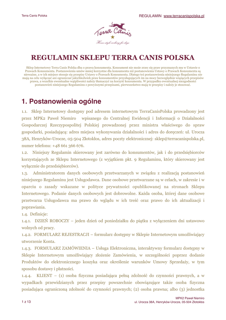 REGULAMIN www.terracanispolska.pl Terra Canis Polska REGULAMIN SKLEPU TERRA CANIS POLSKA Sklep Internetowy Terra Canis Polska dba o prawa konsumenta. Konsument nie może zrzec się praw przyznanych mu w Ustawie o Prawach Konsumenta. Postanowienia umów mniej korzystne dla konsumenta niż postanowienia Ustawy o Prawach Konsumenta są nieważne, a w ich miejsce stosuje się przepisy Ustawy o Prawach Konsumenta. Dlatego też postanowienia niniejszego Regulaminu nie mają na celu wyłączać ani ograniczać jakichkolwiek praw konsumentów przysługujących im na mocy bezwzględnie wiążących przepisów prawa, a wszelkie ewentualne wątpliwości należy tłumaczyć na korzyść konsumenta. W przypadku ewentualnej niezgodności postanowień niniejszego Regulaminu z powyższymi przepisami, pierwszeństwo mają te przepisy i należy je stosować. 1. Postanowienia ogólne 1.1. Sklep Internetowy dostępny pod adresem internetowym TerraCanisPolska prowadzony jest przez MPK2 Paweł Niemiro wpisanego do Centralnej Ewidencji i Informacji o Działalności Gospodarczej Rzeczypospolitej Polskiej prowadzonej przez ministra właściwego do spraw gospodarki, posiadającą: adres miejsca wykonywania działalności i adres do doręczeń: ul. Urocza 38A, Henryków-Urocze, 05-504 Złotokłos, adres poczty elektronicznej: [email protected], numer telefonu: +48 661 366 676. 1.2. Niniejszy Regulamin skierowany jest zarówno do konsumentów, jak i do przedsiębiorców korzystających ze Sklepu Internetowego (z wyjątkiem pkt. 9 Regulaminu, który skierowany jest wyłącznie do przedsiębiorców). 1.3. Administratorem danych osobowych przetwarzanych w związku z realizacją postanowień niniejszego Regulaminu jest Usługodawca. Dane osobowe przetwarzane są w celach, w zakresie i w oparciu o zasady wskazane w polityce prywatności opublikowanej na stronach Sklepu Internetowego. Podanie danych osobowych jest dobrowolne. Każda osoba, której dane osobowe przetwarza Usługodawca ma prawo do wglądu w ich treść oraz prawo do ich aktualizacji i poprawiania. 1.4. Definicje: 1.4.1. DZIEŃ ROBOCZY – jeden dzień od poniedziałku do piątku z wyłączeniem dni ustawowo wolnych od pracy. 1.4.2. FORMULARZ REJESTRACJI – formularz dostępny w Sklepie Internetowym umożliwiający utworzenie Konta. 1.4.3. FORMULARZ ZAMÓWIENIA – Usługa Elektroniczna, interaktywny formularz dostępny w Sklepie Internetowym umożliwiający złożenie Zamówienia, w szczególności poprzez dodanie Produktów do elektronicznego koszyka oraz określenie warunków Umowy Sprzedaży, w tym sposobu dostawy i płatności. 1.4.4. KLIENT – (1) osoba fizyczna posiadająca pełną zdolność do czynności prawnych, a w wypadkach przewidzianych przez przepisy powszechnie obowiązujące także osoba fizyczna posiadająca ograniczoną zdolność do czynności prawnych; (2) osoba prawna; albo (3) jednostka 1 z 13 MPK2 Paweł Niemiro ul. Urocza 38A, Henryków-Urocze, 05-504 Złotokłos REGULAMIN www.terracanispolska.pl Terra Canis Polska organizacyjna nieposiadająca osobowości prawnej, której ustawa przyznaje zdolność prawną; – która zawarła lub zamierza zawrzeć Umowę Sprzedaży ze Sprzedawcą. 1.4.5. KODEKS CYWILNY – ustawa kodeks cywilny z dnia 23 kwietnia 1964 r. (Dz.U. 1964 nr 16, poz. 93 ze zm.). 1.4.6. KONTO – Usługa Elektroniczna, oznaczony indywidualną nazwą (loginem) i hasłem podanym przez Usługobiorcę zbiór zasobów w systemie teleinformatycznym Usługodawcy, w którym gromadzone są dane podane przez Usługobiorcę oraz informacje o złożonych przez niego Zamówieniach w Sklepie Internetowym. 1.4.7. NEWSLETTER – Usługa Elektroniczna, elektroniczna usługa dystrybucyjna świadczona przez Usługodawcę za pośrednictwem poczty elektronicznej e-mail, która umożliwia wszystkim korzystającym z niej Usługobiorcom automatyczne otrzymywanie od Usługodawcy cyklicznych treści kolejnych edycji newslettera zawierającego informacje o Produktach, nowościach i promocjach w Sklepie Internetowym. 1.4.8. PRODUKT – dostępna w Sklepie Internetowym rzecz ruchoma będąca przedmiotem Umowy Sprzedaży między Klientem a Sprzedawcą. 1.4.9. REGULAMIN – niniejszy regulamin Sklepu Internetowego. 1.4.10. SKLEP INTERNETOWY – sklep internetowy Usługodawcy dostępny pod adresem internetowym: www.TerraCanisPolska.pl 1.4.11. SPRZEDAWCA; USŁUGODAWCA – Paweł Niemiro prowadzący działalność gospodarczą pod firmą MPK2 Paweł Niemiro wpisana do Centralnej Ewidencji i Informacji o Działalności Gospodarczej Rzeczypospolitej Polskiej prowadzonej przez ministra właściwego do spraw gospodarki, posiadająca: adres miejsca wykonywania działalności i adres do doręczeń:ul. Urocza 38A, Henryków-Urocze, 05-504 Złotokłos, adres poczty elektronicznej: [email protected], numer telefonu: +48 661 366 676. 1.4.12. UMOWA SPRZEDAŻY – umowa sprzedaży Produktu zawierana albo zawarta między Klientem a Sprzedawcą za pośrednictwem Sklepu Internetowego. 1.4.13. USŁUGA ELEKTRONICZNA – usługa świadczona drogą elektroniczną przez Usługodawcę na rzecz Usługobiorcy za pośrednictwem Sklepu Internetowego. 1.4.14. USŁUGOBIORCA – (1) osoba fizyczna posiadająca pełną zdolność do czynności prawnych, a w wypadkach przewidzianych przez przepisy powszechnie obowiązujące także osoba fizyczna posiadająca ograniczoną zdolność do czynności prawnych; (2) osoba prawna; albo (3) jednostka organizacyjna nieposiadająca osobowości prawnej, której ustawa przyznaje zdolność prawną; – korzystająca lub zamierzająca korzystać z Usługi Elektronicznej. 1.4.15. USTAWA O PRAWACH KONSUMENTA, USTAWA – ustawa z dnia 30 maja 2014 r. o prawach konsumenta (Dz.U. 2014 poz. 827 ze zm.) 1.4.16. ZAMÓWIENIE – oświadczenie woli Klienta składane za pomocą Formularza Zamówienia i zmierzające bezpośrednio do zawarcia Umowy Sprzedaży Produktu ze Sprzedawcą. 2 z 13 MPK2 Paweł Niemiro ul. Urocza 38A, Henryków-Urocze, 05-504 Złot