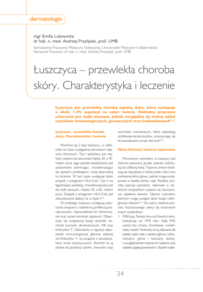 dermatologia mgr Emilia Lubowicka dr hab. n. med. Andrzej Przylipiak, prof. UMB Samodzielna Pracownia Medycyny Estetycznej, Uniwersytet Medyczny w Białymstoku Kierownik Pracowni: dr hab. n. med. Andrzej Przylipiak, prof. UMB Łuszczyca – przewlekła choroba skóry. Charakterystyka i leczenie Łuszczyca jest przewlekłą chorobą zapalną skóry, która występuje u około 1-3% populacji na całym świecie. Dokładna przyczyna schorzenia jest nadal nieznana, jednak uwzględnia się istotny udział czynników immunologicznych, genetycznych oraz środowiskowych[1-4]. Łuszczyca – przewlekła choroba skóry. Charakterystyka i leczenie Wyróżnia się 2 typy łuszczycy, w zależności od czasu wystąpienia pierwszych objawów klinicznych. Typ I spotykany jest częściej i pojawia się zazwyczaj między 20. a 40. rokiem życia. Jego sposób dziedziczenia jest autosomalny dominujący, charakteryzujący się cięższym przebiegiem i dużą opornością na leczenie. W tym typie występuje także związek z antygenem HLA-Cw6. Typ II ma łagodniejszy przebieg i charakterystyczny jest dla osób starszych, między 50. a 60. rokiem życia. Związek z antygenem HLA-Cw6 jest zdecydowanie słabszy niż w typie I[5,6]. W przebiegu łuszczycy występują zaburzenia związane z nadmierną proliferacją keratynocytów, nieprawidłowe ich różnicowanie oraz naciek komórek zapalnych. Obserwuje się zwiększoną liczbę neutrofili, komórek tucznych, dendrytycznych, NK oraz limfocytów T. Zaburzenia w regulacji odpowiedzi immunologicznej, głównie zależnej od limfocytów T, są związane z powstawaniem zmian łuszczycowych. Komórki te są zdolne do produkcji cytokin, chemokin oraz czynników wzrostowych, które pobudzają proliferację keratynocytów, przyczyniając się do powstawania zmian skórnych[3,5]. Obraz kliniczny i kryteria rozpoznania Pierwotnym wykwitem w łuszczycy jest różowo-czerwona grudka pokryta srebrzystą lub żółtawą łuską. Typowe zmiany lokalizują się najczęściej w okolicy kolan, łokci oraz owłosionej skóry głowy, jednak mogą występować w każdej okolicy ciała. Rzadziej choroba zajmuje paznokcie, natomiast w niektórych przypadkach pojawia się łuszczycowe zapalenie stawów. Oprócz wykwitów skórnych mogą wystąpić także świąd i dolegliwości bólowe[2,4]. Do oceny nasilenia procesu łuszczycowego zaleca się stosowanie trzech wskaźników: 1. PASI (ang. Psoriasis Area and Severity Index), funkcjonuje od 1970 roku. Skala PASI ocenia trzy zmiany chorobowe: rumień, łuskę i naciek. Parametry te są obliczane dla każdej części ciała z osobna (głowa, tułów, kończyny górne i kończyny dolne), z uwzględnieniem stopnia ich nasilenia oraz odsetka zajętej powierzchni. Stopień nasile- 34 nia określa się oddzielnie dla każdego parametru: 0 – w przypadku braku zmian chorobowych, 1 – lekki, 2 – średni, 3 – nasilony, 4 – bardzo nasilony. Powierzchnię określa się w skali 0 – 6 (0 w razie braku zmian chorobowych, 1 – zajęcia < 10%, 2 – 10-30%, 3 – 30-50%, 4 – 50-70%, 5 – 70-90% i 6 – 90%). Zakres skali waha się od 0 do 72. Im wyższy wskaźnik PASI, tym większy stopień ciężkości łuszczycy. 2. BSA (ang. Body Surface Area) – wskazuje odsetek powierzchni ciała zajętej zmianami łuszczycowymi. 3. DLQI (ang. Dermatology Life Quality Index) – wskaźnik jakości życia zależny od zmian skórnych[7,8]. Na podstawie wyników PASI, BSA i DLQI wyróżnia się dwa typy łuszczycy: łagodną oraz umiarkowaną do ciężkiej. Zgodnie z wytycznymi Brytyjskiego Towarzystwa Dermatologicznego za łuszczycę łagodną uznaje się wszystkie przypadki choroby, dla których PASI wynosi £ 10 punktów, BSA £ 10% (obiektywne nasilenie choroby) oraz DLQI £ 10 punktów (subiektywne nasilenie choroby). W postaci umiarkowanej i ciężkiej PASI wynosi > 10 pkt i/lub BSA > 10% (obiektywne nasilenie choroby) oraz DLQI > 10 punktów[9]. W leczeniu łuszczycy łagodnej terapią z wyboru jest stosowanie preparatów miejscowych, natomiast w przypadku łuszczycy umiarkowanej do ciężkiej należy dołączyć fototerapię bądź leczenie ogólne[7,8] (Ryc. 1). Leczenie łuszczycy W łuszczycy łagodnej stosuje się leki działające miejscowo. Wśród tych preparatów najszersze zastosowanie mają: cygnolina, glikokortykosteroidy miejscowe oraz pochodne witaminy D3[10]. Cygnolina jest lekiem stosowanym w postaci maści lub pasty. W terapii łuszczycy początkowo stosuje się małe stężenia leku, które, w zależności od reakcji skóry, stopniowo się zwiększa. Wadą cygnoliny są jej niekorzystne właściwości aplikacyjne. Barwi skórę i odzież, a także ma zapach, który nie odpowiada niektórym pacjentom[11]. fototerapia Ryc. 1. Klasyfikacja ciężkości łuszczycy. Classification of severity of psoriasis[7]. 36 W leczeniu łuszczycy coraz szersze zastosowanie wykazują pochodne witaminy D: takalcytol, kalcypotriol i maksakalcytol. Mechanizm działania preparatów związany jest z hamowaniem proliferacji keratynocytów, stymulacją prawidłowej keratynizacji oraz zmniejszeniem nacieku zapalnego. Wykazują one lepsze właściwości kosmetyczne niż cygnolina, dobrą skuteczność terapii oraz wysokie bezpieczeństwo. Terapia pochodnymi witaminy D jest bardziej kosztowna (w porównaniu z cygnoliną), a leki te mają późny początek działania (zwykle po 6-8 tygodniach)[12,13]. Ważną grupą leków stosowanych w leczeniu łuszczycy są także glikokortykosteroidy miejscowe, pochodne witaminy A (m.in. tazaroten) oraz dziegcie. Glikokortykosteroidy charakteryzują się szybkim działaniem oraz dobrymi właściwościami kosmetycznymi. Niestety długotrwałe stosowanie leków przyczynia się do powstania działań niepożądanych, m.in. zaniku skóry, teleangiektazji, rozstępów oraz odbarwienia i przebarwienia skóry[14]. Z miejscową steroidoterapią wiąże się zjawisko tachyfilaksji, czyli zmniejszenie się wrażliwości na lek w czas