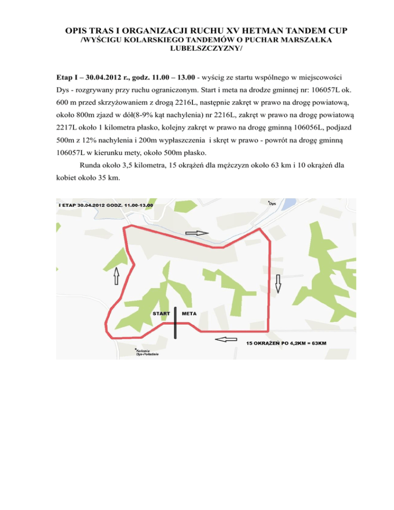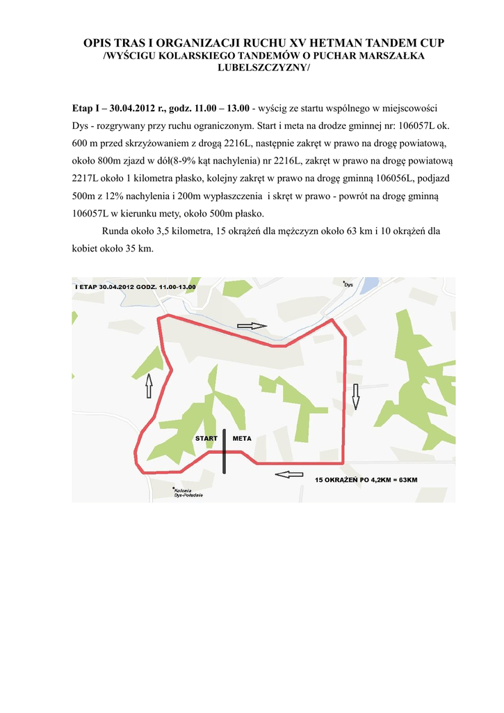 OPIS TRAS I ORGANIZACJI RUCHU XV HETMAN TANDEM CUP /WYŚCIGU KOLARSKIEGO TANDEMÓW O PUCHAR MARSZAŁKA LUBELSZCZYZNY/ Etap I – 30.04.2012 r., godz. 11.00 – 13.00 - wyścig ze startu wspólnego w miejscowości Dys - rozgrywany przy ruchu ograniczonym. Start i meta na drodze gminnej nr: 106057L ok. 600 m przed skrzyżowaniem z drogą 2216L, następnie zakręt w prawo na drogę powiatową, około 800m zjazd w dół(8-9% kąt nachylenia) nr 2216L, zakręt w prawo na drogę powiatową 2217L około 1 kilometra płasko, kolejny zakręt w prawo na drogę gminną 106056L, podjazd 500m z 12% nachylenia i 200m wypłaszczenia i skręt w prawo - powrót na drogę gminną 106057L w kierunku mety, około 500m płasko. Runda około 3,5 kilometra, 15 okrążeń dla mężczyzn około 63 km i 10 okrążeń dla kobiet około 35 km. Etap II – 30.04.2012r., godz. 16.30 – 18.30 - wyścig ze startu wspólnego - rozgrywany przy ruchu zamkniętym – kryterium uliczne o Puchar Prezydenta Miasta Lublina. Start - meta: na ul. Krakowskie Przedmieście przed Pocztą Główną od strony Placu Czechowicza, następnie ulicą Kapucyńską do Narutowicza, przez Okopową do Hempla, Kołłątaja do Krakowskiego Przedmieścia. Od ulicy Narutowicza przez Okopową, Hempla i Kołłątaja, aż do Krakowskiego Przedmieścia wyścig będzie odbywał się odgrodzoną płotkami prawą stroną jezdni. Runda około 1 km, 40 okrążeń dla mężczyzn i 30 okrążeń dla kobiet. Etap III - 01.05.2012r., godz. 11:00 - 15:00 - rozgrywany będzie na trasie Grabanów k. Białej Podlaskiej - start i meta koło domu spokojnej starości, po 2.4 km zakręt w prawo w stronę Wilczyna, przez Julków około 2,9 km aż do ostrego zakrętu w stronę Grabanowa – kolonia z powrotem do Grabanowa około 4,5 km. Cały etap jest płaski z minimalnym podjazdem (3%) w lesie na ostatnim odcinku. Runda około 10 km dla mężczyzn 9 okrążeń, około 90 km . Dla kobiet 6 okrążeń, około 60 km Etap IV - 02.05.2012r., godz. 10.30 - 11.15 - rozegrany będzie na trasie z Julkowa przez Wilczyn i Grabanów, gdzie będzie mata etapu. Czasówka ma około 5,3 km po płaskim terenie z jednym ostrym zakrętem 90 stopni w lewo. Etap V – 02.05.2012 r., godz. 16.30 – 18.00, - wyścig ze startu wspólnego - start - meta: Rokitno – przy parkingu koło kościoła, następnie drogą na Białą Podlaską - około 900 m – droga nr 1036, ostry zakręt prawo ( 130 stopni) na drogę nr: 100257 około 700 m, następnie zakręt w prawo na drogę nr: 1035 dojazd do mety 200 m. Mężczyźni 25 okrążeń ( łącznie około 50 km) a kobiety 20 okrążeń. Etap VI – 03.05.2012 r., godz. 11.05 – 13.15 - wyścig ze startu wspólnego, start honorowy – meta: Leśna Podlaska na wprost dawnej siedziby gminy. Start honorowy i przejazd na start „ostry” ok. 1200 m drogą nr: 1025 w okolice stacji benzynowej. Około 50 m po wjeździe na rundę –start „ostry” - drogę na Bukowice nr: 1022 około 2 km, następnie zakręt w prawo na Nosów droga nr: 100137 około 2,4 km, następnie przez wieś Nosów drogą nr: 1024 około 600 m do drogi na Leśną Podlaską nr: 1025 - 2,1 km powrót w okolice stacji paliw przy której meta okrążenia. Dla mężczyzn 11 okrążeń, runda około 6,8 km (łącznie 78 km) Dla kobiet 9 okrążeń (łącznie około 64 km)