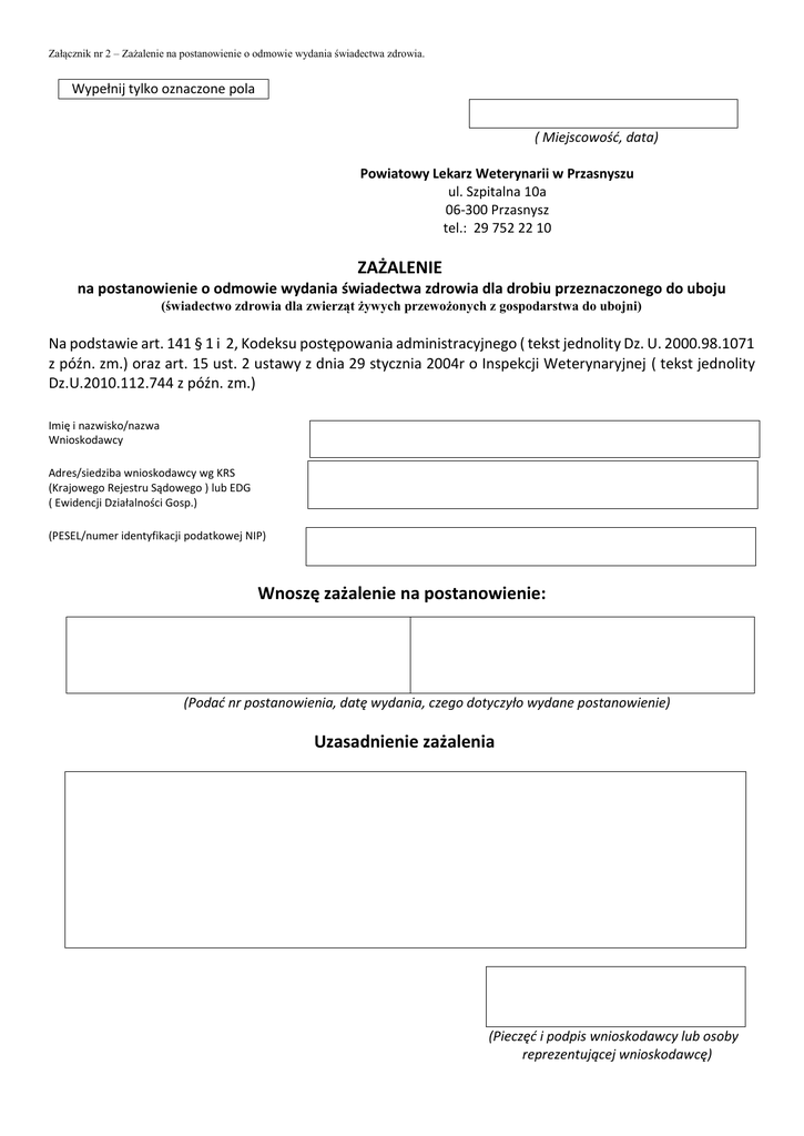 Załącznik nr 2 – Zażalenie na postanowienie o odmowie wydania świadectwa zdrowia. Wypełnij tylko oznaczone pola ( Miejscowość, data) Powiatowy Lekarz Weterynarii w Przasnyszu ul. Szpitalna 10a 06-300 Przasnysz tel.: 29 752 22 10 ZAŻALENIE na postanowienie o odmowie wydania świadectwa zdrowia dla drobiu przeznaczonego do uboju (świadectwo zdrowia dla zwierząt żywych przewożonych z gospodarstwa do ubojni) Na podstawie art. 141 § 1 i 2, Kodeksu postępowania administracyjnego ( tekst jednolity Dz. U. 2000.98.1071 z późn. zm.) oraz art. 15 ust. 2 ustawy z dnia 29 stycznia 2004r o Inspekcji Weterynaryjnej ( tekst jednolity Dz.U.2010.112.744 z późn. zm.) Imię i nazwisko/nazwa Wnioskodawcy Adres/siedziba wnioskodawcy wg KRS (Krajowego Rejestru Sądowego ) lub EDG ( Ewidencji Działalności Gosp.) (PESEL/numer identyfikacji podatkowej NIP) Wnoszę zażalenie na postanowienie: (Podać nr postanowienia, datę wydania, czego dotyczyło wydane postanowienie) Uzasadnienie zażalenia (Pieczęć i podpis wnioskodawcy lub osoby reprezentującej wnioskodawcę)