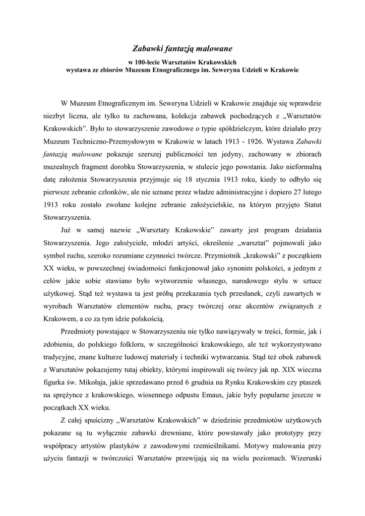 Zabawki fantazją malowane w 100-lecie Warsztatów Krakowskich wystawa ze zbiorów Muzeum Etnograficznego im. Seweryna Udzieli w Krakowie W Muzeum Etnograficznym im. Seweryna Udzieli w Krakowie znajduje się wprawdzie niezbyt liczna, ale tylko tu zachowana, kolekcja zabawek pochodzących z „Warsztatów Krakowskich”. Było to stowarzyszenie zawodowe o typie spółdzielczym, które działało przy Muzeum Techniczno-Przemysłowym w Krakowie w latach 1913 - 1926. Wystawa Zabawki fantazją malowane pokazuje szerszej publiczności ten jedyny, zachowany w zbiorach muzealnych fragment dorobku Stowarzyszenia, w stulecie jego powstania. Jako nieformalną datę założenia Stowarzyszenia przyjmuje się 18 stycznia 1913 roku, kiedy to odbyło się pierwsze zebranie członków, ale nie uznane przez władze administracyjne i dopiero 27 lutego 1913 roku zostało zwołane kolejne zebranie założycielskie, na którym przyjęto Statut Stowarzyszenia. Już w samej nazwie „Warsztaty Krakowskie” zawarty jest program działania Stowarzyszenia. Jego założyciele, młodzi artyści, określenie „warsztat” pojmowali jako symbol ruchu, szeroko rozumiane czynności twórcze. Przymiotnik „krakowski” z początkiem XX wieku, w powszechnej świadomości funkcjonował jako synonim polskości, a jednym z celów jakie sobie stawiano było wytworzenie własnego, narodowego stylu w sztuce użytkowej. Stąd też wystawa ta jest próbą przekazania tych przesłanek, czyli zawartych w wyrobach Warsztatów elementów ruchu, pracy twórczej oraz akcentów związanych z Krakowem, a co za tym idzie polskością. Przedmioty powstające w Stowarzyszeniu nie tylko nawiązywały w treści, formie, jak i zdobieniu, do polskiego folkloru, w szczególności krakowskiego, ale też wykorzystywano tradycyjne, znane kulturze ludowej materiały i techniki wytwarzania. Stąd też obok zabawek z Warsztatów pokazujemy tutaj obiekty, którymi inspirowali się twórcy jak np. XIX wieczna figurka św. Mikołaja, jakie sprzedawano przed 6 grudnia na Rynku Krakowskim czy ptaszek na sprężynce z krakowskiego, wiosennego odpustu Emaus, jakie były popularne jeszcze w początkach XX wieku. Z całej spuścizny „Warsztatów Krakowskich” w dziedzinie przedmiotów użytkowych pokazane są tu wyłącznie zabawki drewniane, które powstawały jako prototypy przy współpracy artystów plastyków z zawodowymi rzemieślnikami. Motywy malowania przy użyciu fantazji w twórczości Warsztatów przewijają się na wielu poziomach. Wizerunki postaci z legend krakowskich, jak smok wawelski czy Pan Twardowski „odmalowane” zostały w drewnie dzięki wyobraźni Zofii Stryjeńskiej (1891-1976). Antoni Buszek (1883-1954) artysta malarz, wprowadził w Warsztatach, rewolucyjną jak na owe czasy, metodę kształcenia artystycznego polegającą na zdobieniu gotowych wyrobów ornamentem wykonywanym zgodnie z własną inwencją przez dzieci i młodzież bez wcześniejszego przygotowania plastycznego. W jak różnych kierunkach może iść zdobienie tych samych wyrobów można zobaczyć na kilku przykładach figurek malowanych przez dzieci wg własnych pomysłów – pod kierunkiem J. Warchałowskiego. Jedną z najzdolniejszych uczennic „Warsztatów Krakowskich” była Józefa Kogut, która jeszcze przez wiele lat po zakończeniu działalności Stowarzyszenia malowała w fantazyjne wzory Lajkoniki, katarynki, smoki, węże, kogutki, które były sprzedawane w sklepach Cepelii do lat 70. XX wieku. W swojej pracy posługiwała się też wykonanym przez siebie wzornikiem zapełnionym fantastycznymi wzorami kwiatowymi, a także przedziwnymi, o bajkowych kształtach stworami: smokami, ślimakami, motylami. Mało kto zdaje sobie sprawę z tego, że smoki wawelskie o wijącym się, wężowym ciele, sprzedawane do dziś jako pamiątki w krakowskich Sukiennicach, wywodzą się z projektu Zofii Stryjeńskiej, a jedyny ich pierwowzór zachował się w zbiorach Muzeum Etnograficznego im. Seweryna Udzieli w Krakowie. Kilka figurek różnego autorstwa przedstawia historię smoka wawelskiego, a współczesne figurki ptaków pokazują trwałość wypracowanych w „Warsztatach Krakowskich” wzorów, inne zaś stawiają pytania: czy na pewno tutaj należy szukać ich źródła. Małgorzata Oleszkiewicz Grażyna Pyla