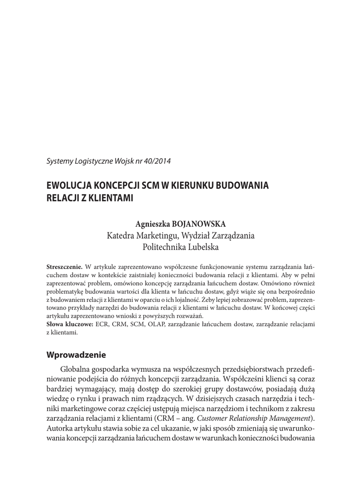 Systemy Logistyczne Wojsk nr 40/2014 EWOLUCJA KONCEPCJI SCM W KIERUNKU BUDOWANIA RELACJI Z KLIENTAMI Agnieszka BOJANOWSKA Katedra Marketingu, Wydział Zarządzania Politechnika Lubelska Streszczenie. W artykule zaprezentowano współczesne funkcjonowanie systemu zarządzania łańcuchem dostaw w kontekście zaistniałej konieczności budowania relacji z klientami. Aby w pełni zaprezentować problem, omówiono koncepcję zarządzania łańcuchem dostaw. Omówiono również problematykę budowania wartości dla klienta w łańcuchu dostaw, gdyż wiąże się ona bezpośrednio z budowaniem relacji z klientami w oparciu o ich lojalność. Żeby lepiej zobrazować problem, zaprezentowano przykłady narzędzi do budowania relacji z klientami w łańcuchu dostaw. W końcowej części artykułu zaprezentowano wnioski z powyższych rozważań. Słowa kluczowe: ECR, CRM, SCM, OLAP, zarządzanie łańcuchem dostaw, zarządzanie relacjami z klientami. Wprowadzenie Globalna gospodarka wymusza na współczesnych przedsiębiorstwach przedefiniowanie podejścia do różnych koncepcji zarządzania. Współcześni klienci są coraz bardziej wymagający, mają dostęp do szerokiej grupy dostawców, posiadają dużą wiedzę o rynku i prawach nim rządzących. W dzisiejszych czasach narzędzia i techniki marketingowe coraz częściej ustępują miejsca narzędziom i technikom z zakresu zarządzania relacjami z klientami (CRM – ang. Customer Relationship Management). Autorka artykułu stawia sobie za cel ukazanie, w jaki sposób zmieniają się uwarunkowania koncepcji zarządzania łańcuchem dostaw w warunkach konieczności budowania A. Bojanowska relacji z klientami na rynku. W tym kontekście istotne jest również to, w jaki sposób buduje się wartość dla klienta w łańcuchu dostaw oraz w jaki sposób wpływa się na lojalność klienta podczas całego procesu logistycznego w przedsiębiorstwie. 1. Koncepcja zarządzania łańcuchem dostaw Koncepcja zarządzania łańcuchem dostaw – SCM (ang. Supply Chain Management) pojawiła się pod koniec XX wieku. Nawiązywała ona do porterowskiego systemu budowania łańcucha wartości dodanej, obejmującego partnerów biznesowych przedsiębiorstwa w procesie dostarczania wartości dla klientów. W metodyce tej podkreślano potrzebę koordynacji i optymalizacji współdziałania wszystkich uczestników łańcucha w zakresie: zaopatrzenia, produkcji, transportu, magazynowania i dystrybucji, jednocześnie zwracając uwagę na koszty ponoszone w procesie powstawania wartości dodanej1. Koncepcja SCM obejmuje działania, które można zastosować od dostawcy do sprzedawcy – rysunek 1. Rys. 1. Łańcuch dostaw obejmujący granice korporacyjne Źródło: W. Hansen, F. Gillert, RFID for the Optimization of Business Processes, Struktury procesów biznesowych, rozdział 4, http://rfid-lab.pl/struktury-procesow-biznesowych/, pobrano 23 marca 2014 r. 1 A. Kwasek, Model zarządzania wykorzystujący CRM, Magazyn Biznesowy i Akademicki, Sztuka Zarządzania, Wyższa Szkoła Zarządzania, nr 46, marzec 2014. 30 Ewolucja koncepcji SCM w kierunku budowania relacji z klientami Mówi się, że łańcuch dostaw jest siecią przedsiębiorstw, a SCM stanowi implementację przekrojowych funkcjonalnie relacji z klientami i dostawcami w tej sieci2. Za główny cel zarządzania łańcuchem dostaw uważa się maksymalizację synergii pomiędzy elementami łańcucha dostaw w celu efektywniejszego zaoferowania konsumentowi finalnego produktu lub usługi poprzez redukcję kosztów i wzrost wartości dodanej3. Taką synergię można uzyskać, budując trwałe więzi z klientami. 2. Budowanie wartości dla klienta w łańcuchu dostaw Kategoria wartości jest kluczowym pojęciem w teorii zarządzania, ponieważ przetrwanie i długoterminowy sukces przedsiębiorstwa na rynku są determinowane stałym tworzeniem i dostarczaniem klientom właściwej (oczekiwanej) wartości4. Budowanie wartości dla klienta w łańcuchu dostaw jest ważne z punktu widzenia relacji klient – firma. Zwiększa lojalność klientów i zmniejsza ich fluktuację. W konsekwencji tego klient nawiązuje coraz bardziej trwałą więź z firmą. Taka więź może przynieść i firmie, i klientowi duże korzyści. Wszystko zależy od aktualnego poziomu relacji klient – firma. Każda firma powinna aktywnie kreować wartość dla klienta. Wśród ważnych procesów, które firma powinna rozwijać w celu kreowania tej wartości, wyróżnia się: ‒ rozwój marki, w tym rozwój nowych produktów, innowacje; ‒ rozwój usług konsumpcyjnych, w tym budowanie lojalności klienta; ‒ zarządzanie klientami – tworzenie relacji, najlepiej długoterminowych; ‒ rozwój współpracy z dostawcami – ulepszanie relacji w całym łańcuchu; ‒ doskonalenie zarządzania łańcuchem dostaw5. Uzupełnieniem powyższych procesów mogą być trzy warianty dostarczania klientom odpowiedniej wiązki wartości: ‒ doskonałość operacyjna, wyrażająca się w oferowaniu nabywcom produktów/usług po najatrakcyjniejszej cenie, wymagająca optymalizacji procesów z punktu widzenia kosztów, czasu, elastyczności, sprawności, wygody klienta oraz kształtowania efektywnego przebiegu procesów w całej sieci dostaw; ‒ przywództwo produktowe, polegające na koncentracji na innowacjach, projektowaniu nowych produktów i szybkim wprowadzaniu ich na rynek oraz kreowaniu elastycznych struktur organizacyjnych opartych na procesach; 2 3 4 5 Supply Chain Management Institute, http://scm-institute.org/, pobrano 12 kwietnia 2013 r. S. Kot, M. Starostka-Patyk, D. Krzywda, Zarządzanie łańcuchami dostaw, Wydawnictwo Politechniki Częstochowskiej, Częstochowa 2009, s. 16. T. Pokusa, Logistyczno-marketingowy system tworzenia wartości dla klienta – wybrane elementy, Zeszyty Naukowe Logistyka i Transport, Międzynarodowa Wyższa Szkoła Logistyki i Transportu we Wrocławiu, Wrocław 2006. P. Barczak, Kreowanie wartości w łańcuchach dost