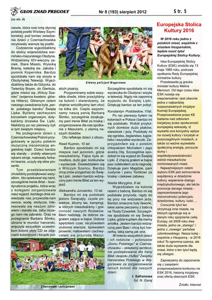 Nr 8 (193) sierpień 2012 Str. 5 (ze str. 4) rzewie, która nosi imię słynnej polskiej poetki Wisławy Szymborskiej; pod koniec zwiedzania dzieci z Czerniachowska recytowały wiersze tej poetki. Codziennie wyjeżdżaliśmy do stolicy województwa warmińsko-mazurskiego Olsztyna. Widzieliśmy XIV-wieczny zamek, Stare Miasto, Wysoką Bramę, katedrę św. Jakuba i pomnik Kopernika. Bardzo spodobała nam się wizyta w Olsztyńskiej Telewizji. Wyjeżdżaliśmy także do Giżycka, do Twierdzy Boyen, do Gierłoża, gdzie mieści się „Wilczy Szaniec” (wojenna kwatera główna Hitlera). Głównym celem naszego zwiedzania była „perła polskiego baroku” Święta Lipka. Byliśmy zachwyceni koncertem organowym, dotykaliśmy drzewka Św. Lipki. Niektórzy po raz pierwszy byli w tym świętym miejscu. Na pożegnanie dzieci z Czerniachowskiej Polonii przygotowały w języku polskim muzyczną inscenizację angielskiej bajki. Dzieci bardzo się starały – zrobiły własnymi rękami stroje, malowały farbami twarze, uczyły się słów piosenki. Tym przedstawieniem chcieliśmy podziękować wszystkim, kto opiekował się nami, szczególnie Irenie Biłat – koordynatorce projektu, która wraz z kolegami zorganizowa ła nasz wyjazd, każdego dnia odwiedzała nas, przywoziła nam owoce, wodę, słodycze, interesowała się naszym zdrowiem i starała się, żeby niczego nam nie zabrakło. Oraz na pożegnanie Barbara Ślimko, ubrana w mundur harcerski, wręczyła wszystkim uczestnikom kolonii płyty CD ze zdjęciami kolonijnymi i książki pol- Europejska Stolica Kultury 2016 W 2016 roku jedno z polskich miast, wspólnie z miastem hiszpańskim, będzie nosić tytuł Europejskiej Stolicy Kultury. G łó w n y p ol i c ja n t W ę go r z ew a skich pisarzy. Przypominamy sobie wszystkie chwile, które przeżyliśmy na kolonii i stwierdzamy, że chętnie wrócilibyśmy tam choć na kilka dni. Ciepło wspominamy naszą panią Barbarę Ślimko, szczególnie dziękujemy pani Irenie Biłat za troskę i zorganizowane dla nas spotkania z Mazurami, z ziemią naszych dziadów. Oto refleksje dzieci z obozu. Szczególnie spodobała mi się wycieczka do Olsztyna i wizyta w telewizji. Nigdy nie zapomnę wyjazdu do Świętej Lipki. Dziękuję bardzo za ten pobyt. Konstantyn Podobedow, 11lat. Po raz pierwszy byłem na koloniach w Polsce i bardzo mi się podobało. Wokół przytulnych domków dużo ptaków, wiewiórek i jeży. Podobały mi się ogniska, żeglarstwo, kąpielisko i wszystkie wycieczki. Zaprzyjaźniłem się z polskim chłopakiem Michałem i jego siostrą Olą. Szczególnie spodobał mi się wyjazd do Świętej Lipki. Z chęcią grałem w bajce psa i odebrałem za to nagrodę. Dziękuje pani Magdzie, pani Justynie i panu Tomkowi za troskę i ciekawe zabawy. Rawil Kuzmin, 10 lat: Bardzo spodobało mi się miejsce nad jeziorem, gdzie mieszkaliśmy. Fajna była atmosfera, dużo gier, konkursów i wycieczek. Dowiedziałem się o W ilczym Sza ńcu. Bardzo chcę znów przyjechać do Świętej Lipki. Jestem bardzo wdzięczny pani Irenie Biłat za ten wyNastia Murygina, 8 lat. jazd. Wyjeżdżałam na kolonie Aleksandra Jurczenko, 13 lat. razem z babcią. Bardzo mi się Bardzo mi się podobało podobała przyroda, nigdy do jezioro Święcajty, czyste po- tej pory nie widziałam jeża. wietrze, śliczny las, kampingi, Bardzo smaczne były faworki, w których mieszkaliśmy i goś- takie same pieczemy z babcią cinność naszych Rodaków. na Tłusty Czwartek. SzczególMam nadzieję, że dobrze za- nie spodobała mi się Święta grałam zająca w bajce. Dobrze Lipka, gdzie kupiłam dla mamy spędziłam czas: recytowałam aniołka. Jestem bardzo wdzięulubione wiersze, śpiewałam czną pani Basi i chcę być harpiosenki, malowałam i zachwy- cerką, taką samą jak ona. całam się przyrodą Mazur. W imieniu wszystkich dzieci i ich rodziców – polonusów „Domu Polskiego” w Czerniachowsku – składamy serdecznie podziękowania dla Ireny Biłat i zespołu „Hufiec” Związku Harcerstwa Polskiego w Węgorzewie za zorganizowanie letnich kolonii dla naszych dzieci. I. Safronowa fot. N. Garaj Z harcerzami i policjantami Idea Europejskiej Stolicy Kultury (ESK) zrodziła się 13 maja 1985 roku, podczas spotkania Rady Europejskiej ministrów kultury. Przedstawiła ją grecka minister kultury Melina Mercouri. Od tego czasu idea ESK rozwija się nieprzerwalnie i jest obecnie jedna z najbardziej rozpoznawalnych inicjatyw Komisji Europejskiej. Przeprowadzone przez KE badania nad odbiorem inicjatywy przez społeczność europejską wskazały, iż wywarła ona korzystny wpływ na rozwój kultury i turystyki w poszczególnych miastach, a także co ważne wyzwalała społeczną energię, poczucie dumy i współodpowiedzialności wśród mieszkańców nominowanych miast. Najważniejszym celem wyboru ESK jest wzmocnienie współpracy w dziedzinie kultury, wspieranie dialogu międzykulturowego, ale także promocja danego miasta zaprezentowanie jego różnorodności potencjału dziedzictwa, kultury, ludzi…. Corocznie tytuł ten otrzymują inne miasta, na których ogniskuje się w danym roku spojrzenie całej Europy, od 2009 roku dwa miasta, jedno ze „starego” i jedno z „nowego” państwa członkowskiego. Nasza kolej wspólnie z Hiszpanią - w 2016 roku! To ogromna szansa, ale także duże wyzwanie dla miast, które o ten tytuł będą się ubiegać. Zapraszamy do zapoznania się z zasadami przeprowadzenia konkursu na ESK 2016, historią inicjatywy oraz ofertą obecnych ESK. Źródło: Internet