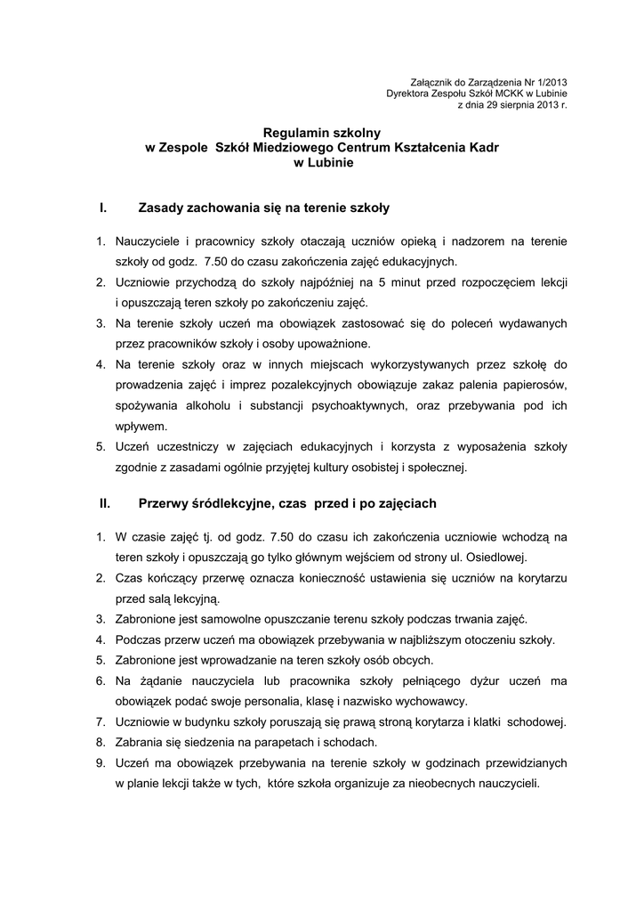 Załącznik do Zarządzenia Nr 1/2013 Dyrektora Zespołu Szkół MCKK w Lubinie z dnia 29 sierpnia 2013 r. Regulamin szkolny w Zespole Szkół Miedziowego Centrum Kształcenia Kadr w Lubinie I. Zasady zachowania się na terenie szkoły 1. Nauczyciele i pracownicy szkoły otaczają uczniów opieką i nadzorem na terenie szkoły od godz. 7.50 do czasu zakończenia zajęć edukacyjnych. 2. Uczniowie przychodzą do szkoły najpóźniej na 5 minut przed rozpoczęciem lekcji i opuszczają teren szkoły po zakończeniu zajęć. 3. Na terenie szkoły uczeń ma obowiązek zastosować się do poleceń wydawanych przez pracowników szkoły i osoby upoważnione. 4. Na terenie szkoły oraz w innych miejscach wykorzystywanych przez szkołę do prowadzenia zajęć i imprez pozalekcyjnych obowiązuje zakaz palenia papierosów, spożywania alkoholu i substancji psychoaktywnych, oraz przebywania pod ich wpływem. 5. Uczeń uczestniczy w zajęciach edukacyjnych i korzysta z wyposażenia szkoły zgodnie z zasadami ogólnie przyjętej kultury osobistej i społecznej. II. Przerwy śródlekcyjne, czas przed i po zajęciach 1. W czasie zajęć tj. od godz. 7.50 do czasu ich zakończenia uczniowie wchodzą na teren szkoły i opuszczają go tylko głównym wejściem od strony ul. Osiedlowej. 2. Czas kończący przerwę oznacza konieczność ustawienia się uczniów na korytarzu przed salą lekcyjną. 3. Zabronione jest samowolne opuszczanie terenu szkoły podczas trwania zajęć. 4. Podczas przerw uczeń ma obowiązek przebywania w najbliższym otoczeniu szkoły. 5. Zabronione jest wprowadzanie na teren szkoły osób obcych. 6. Na żądanie nauczyciela lub pracownika szkoły pełniącego dyżur uczeń ma obowiązek podać swoje personalia, klasę i nazwisko wychowawcy. 7. Uczniowie w budynku szkoły poruszają się prawą stroną korytarza i klatki schodowej. 8. Zabrania się siedzenia na parapetach i schodach. 9. Uczeń ma obowiązek przebywania na terenie szkoły w godzinach przewidzianych w planie lekcji także w tych, które szkoła organizuje za nieobecnych nauczycieli. III. Zajęcia edukacyjne 1. Do sali uczniowie mogą wejść za zgodą nauczyciela dopiero po opuszczeniu jej przez poprzednią grupę uczniów. 2. Zabronione jest przebywanie na zajęciach w kurtkach i nakryciach głowy. 3. Uczeń ma obowiązek sprawnego przygotowania się do zajęć. 4. Na opuszczanie rolet lub otwieranie okien musi wyrazić zgodę nauczyciel obecny w sali. 5. Za porządek w sali przed jej opuszczeniem odpowiedzialny jest dyżurny. 6. Zabrania się uczniom podczas lekcji spożywania jakichkolwiek posiłków, wyjątkowo dopuszcza się za zgodą nauczyciela picie wody podczas upałów. 7. Niedopuszczalne jest żucie gumy. 8. Podczas zajęć jest bezwzględny zakaz korzystania z telefonu komórkowego, który powinien być wyłączony. 9. Każdy uczeń osobiście odpowiada /także finansowo/ za zniszczenia i uszkodzenia sprzętu szkolnego oraz pomocy dydaktycznych znajdujących się w szkole na skutek celowego działania. 10. Opuszczenie sali spowodowane nagłym zdarzeniem lub potrzebą wymaga zgody nauczyciela prowadzącego lekcję. 11. Zwolnienie z planowych lekcji i musi mieć formę pisemną. 12. O odwołaniu lub skróceniu zajęć uczniowie i rodzice informowani są w miarę możliwości co najmniej 1 dzień przed ich terminem poprzez ogłoszenie na tablicy ogłoszeń i informację na stronie internetowej szkoły. 13. W przypadku nagłego zachorowania ucznia ma on obowiązek zgłoszenia się u pielęgniarki lub w sekretariacie w obecności innego ucznia. 14. Jeżeli stan zdrowia uniemożliwia uczniowi uczestniczenie w zajęciach pielęgniarka lub inny pracownik szkoły zawiadamia rodziców lub prawnych opiekunów i w porozumieniu z nimi decyduje o dalszym postępowaniu. 15. Uczniowie, którzy nie uczęszczają na zajęcia religii pozostają pod opieką pracownika szkoły i mają obowiązek do niego się zgłosić. IV. Zasady zachowania na imprezach szkolnych Akademie, apele, przedstawienia 1. Ich organizacją zajmują się: Dyrekcja , Samorząd Szkolny, Samorząd Klasowy lub nauczyciele. 2. W przypadku akademii wszystkich uczestników obowiązuje strój galowy. 3. Jeśli odgrywany jest hymn państwowy wszyscy uczestnicy mają obowiązek powstać, przyjąć właściwą postawę i śpiewać słowa hymnu w postawie zasadniczej. V. Zasady zachowania na wycieczkach szkolnych 1. Zasady te określa szczegółowo „Regulamin wycieczek szkolnych w Zespole Szkół MCKK w Lubinie”. Zasady korzystania z pomieszczeń i urządzeń szkolnych VI. 1. Uczniowie mają prawo do korzystania ze wszystkich pomieszczeń i urządzeń szkolnych w czasie lekcji, zajęć pozalekcyjnychi przerw wyłącznie pod opieką nauczyciela i tylko zgodnie z ich przeznaczeniem. 2. Uczniowie oczekujący na zajęcia mają obowiązek zachowania ciszy. 3. Każda klasa jest gospodarzem przypisanej sali lekcyjnej, dba i odpowiada za zgromadzony w niej sprzęt, porządek i wygląd estetyczny. 4. Cenne przedmioty i pieniądze uczniowie przynoszą do szkoły na własną odpowiedzialność. 5. Nauczyciele ustalają regulaminy bezpiecznego korzystania z pracowni przedmiotowych oraz zapoznają z nimi uczniów na pierwszych zajęciach. 6. Regulaminy zatwierdza Dyrektor szkoły. VII. Strój uczniowski i wygląd zewnętrzny 1. W szkole obowiązuje strój codzienny i galowy. 2. Strój codzienny powinien spełniać następujące wymogi : a) być czysty i funkcjonalny, b) zabrania się eksponowania na odzieży symboli narkomańskich , propagujących alkohol i używki , antypaństwowych i antynarodowych oraz o wymowie rasistowskiej, nazistowskiej i komunistycznej, c) zabrania się noszenia ekstrawaganckiej odzieży, fryzur i makijażu tj. nie licujących z powagą miejsca jakim jest szkoła oraz brakiem szacunku dla pracy i innych osób, d) zabrania się eksponowania odkrytych części ciała. 3. W czasie uroczystości szkolnych każdy uczeń zobowiązany jest nosić strój galo