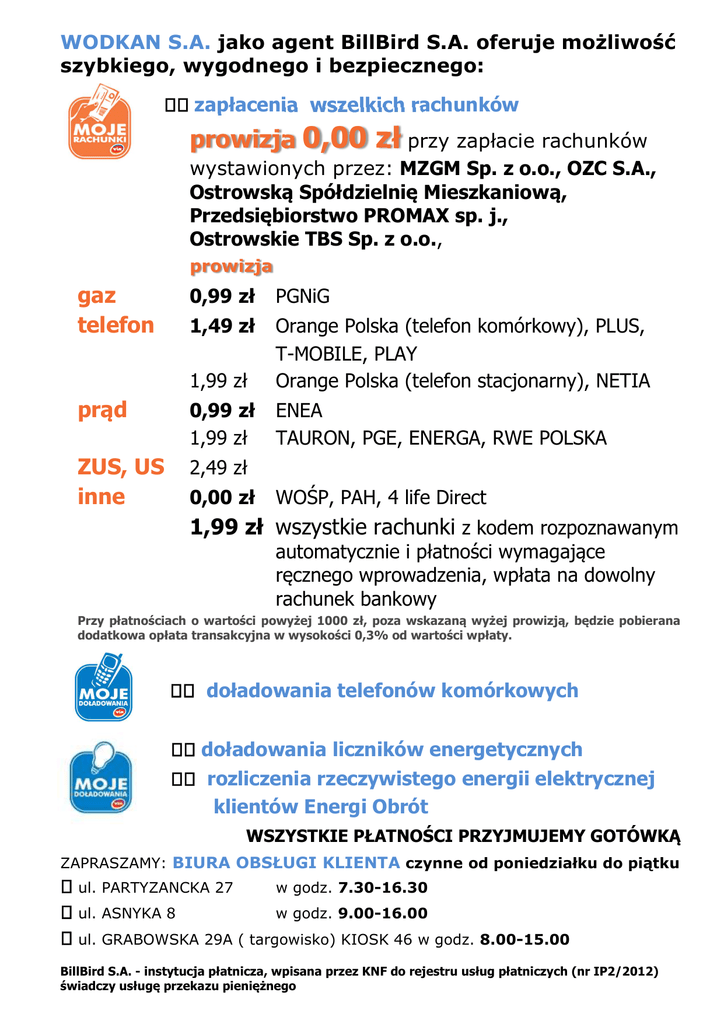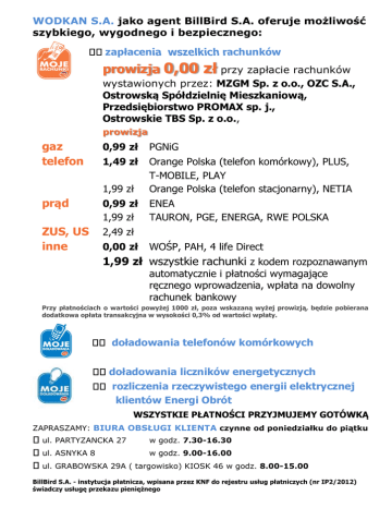 WODKAN S.A. jako agent BillBird S.A. oferuje możliwość szybkiego, wygodnego i bezpiecznego: zapłacenia wszelkich rachunków prowizja 0,00 zł przy zapłacie rachunków wystawionych przez: MZGM Sp. z o.o., OZC S.A., Ostrowską Spółdzielnię Mieszkaniową, Przedsiębiorstwo PROMAX sp. j., Ostrowskie TBS Sp. z o.o., prowizja gaz telefon 0,99 zł PGNiG 1,49 zł 1,99 zł Orange Polska (telefon komórkowy), PLUS, T-MOBILE, PLAY Orange Polska (telefon stacjonarny), NETIA prąd 0,99 zł 1,99 zł ENEA TAURON, PGE, ENERGA, RWE POLSKA ZUS, US inne 2,49 zł 0,00 zł WOŚP, PAH, 4 life Direct 1,99 zł wszystkie rachunki z kodem rozpoznawanym automatycznie i płatności wymagające ręcznego wprowadzenia, wpłata na dowolny rachunek bankowy Przy płatnościach o wartości powyżej 1000 zł, poza wskazaną wyżej prowizją, będzie pobierana dodatkowa opłata transakcyjna w wysokości 0,3% od wartości wpłaty. doładowania telefonów komórkowych doładowania liczników energetycznych rozliczenia rzeczywistego energii elektrycznej klientów Energi Obrót WSZYSTKIE PŁATNOŚCI PRZYJMUJEMY GOTÓWKĄ ZAPRASZAMY: BIURA OBSŁUGI KLIENTA czynne od poniedziałku do piątku ul. PARTYZANCKA 27 w godz. 7.30-16.30 ul. ASNYKA 8 w godz. 9.00-16.00 ul. GRABOWSKA 29A ( targowisko) KIOSK 46 w godz. 8.00-15.00 BillBird S.A. - instytucja płatnicza, wpisana przez KNF do rejestru usług płatniczych (nr IP2/2012) świadczy usługę przekazu pieniężnego