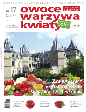AKTUALNOŚCI NR 17 1-15 września 2011 r. RYNEK WARZYWNICTWO SADOWNICTWO ROŚLINY OZDOBNE PRAWO owoce warzywa kwiaty DWUTYGODNIK OGRODNICZY cena 7 zł owoce warzywa kwiaty NR 17/2011 (w tym 5% VAT) ZAPRASZAMY na Dni Ogrodnika Gołuchów 10–11 września POMIDORY JESIENIĄ zalecenia UPRAWA TRUSKAWEK na rynnach ROŚLINY RABATOWE nawożenie owoce warzywa kwiaty spis treści NUMER 17/2011 5 AKTUALNOŚCI 8 RYNEK 8 RYNEK mgr Tomasz Smoleński 10 PANIKA CZY EKONOMIKA dr Grzegorz Klimek 11 CENY POMIDORÓW SPOD OSŁON dr Michał Trzęsowski 16 WARZYWNICTWO 16 POMIDORY JESIENIĄ W UPRAWIE PRZEDŁUŻONEJ dr Maria Wysocka-Owczarek 22 POMIDOROWE NOWOŚCI FIRMY ENZA ZADEN Adela Maziarz 24 STRATEGIA NAWADNIANIA POMIDORÓW dr Krzysztof Fatel 28 NAWADNIANIE WEDŁUG TOMATO ACADEMY Marta Szyperek 30 MIĘDZYNARODOWY DZIEŃ PAPRYKI Adela Maziarz 31 KOSZTY PRACY W PRODUKCJI POMIDORÓW Marta Szyperek 32 PODŁOŻE WYSUBLIMOWANE Agnieszka Majewska 34 UPRAWA OGÓRKÓW Z PODSADZANIEM dr Marta Repelewicz-Szybkowska 37 BIOLOGICZNIE Z ZASADAMI dr hab. Janusz Piątkowski 38 BROKUŁY – LEPIEJ ZAPOBIEGAĆ NIŻ STRACIĆ dr Irena Babik 41 CEBULA W 51 ODSŁONACH Jolanta Wilhelmi 42 OD TEORII DO PRAKTYKI Agnieszka Majewska 44 JAK CHRONIĆ KAPUSTĘ PRZED ZBIOREM? prof. dr hab. Józef Robak 48 SADOWNICTWO 48 WRZESIEŃ W SADZIE Piotr Gościło 51 TRUSKAWKI NA RYNNACH Henryk Czerwiński 54 JAKOŚĆ OWOCÓW dr Krzysztof P. Rutkowski, dr Anna Wawrzyńczak 58 Z BELGIJSKIEJ SZKÓŁKI Henryk Czerwiński 60 ROŚLINY OZDOBNE 60 W TECHNICZNEJ KRAINIE CZARÓW Agnieszka Majewska 64 DOŚWIETLANIE CHRYZANTEM prof. dr hab. Marek Jerzy, dr inż. Piotr Piszczek 66 „RABATOWE” NOWOŚCI Z OFERTY PLANTPOLU Danuta Pyza-Grzybowska 70 SYSTEMY NAWOŻENIA ROŚLIN RABATOWYCH dr Piotr Chohura 73 CZYTELNICY PYTAJĄ – EKSPERT ODPOWIADA dr Jadwiga Treder 73 KROKOSZ BARWIERSKI W KWIACIARSTWIE 74 MSZYCE – WIELOSTRONNA SZKODLIWOŚĆ dr inż. Janusz Mazurek OWOCE WARZYWA KWIATY 17 / 2011 OwoceWarzywaKwiaty.pl 3 ADRES REDAKCJI ul. Kopernika 34, IV piętro, pok. 407 00-336 Warszawa tel./fax 22 826 16 26 e-mail: [email protected] ZESPÓŁ REDAKCYJNY Aleksandra Jóźwicka redaktor naczelna, tel. wew. 126 [email protected] Danuta Pyza-Grzybowska z-ca redaktor naczelnej, tel. wew. 125 [email protected] Henryk Czerwiński – redaktor, tel. wew. 127 [email protected] Agnieszka Majewska – redaktor [email protected] tel. 609 161 516 Marta Szyperek – redaktor, tel. wew. 128 [email protected] DZIAŁ REKLAMY Anna Kurek - dyrektor tel. 22 828 17 00, 665 004 014 [email protected] Ewa Żurczak tel. 22 828 09 53 wew. 110, 691 980 020 [email protected] Malwina Szymańska tel. 22 828 09 53 wew. 141, 603 047 008 [email protected] KONSULTANCI Prof. Franciszek Adamicki, prof. Augustyn Mika, prof. Kazimierz Mynett, mgr Jan Świetlik, dr Michał Trzęsowski, dr Maria Wysocka-Owczarek WYDAWCA HORTPRESS Spółka z o.o. ul. Kopernika 34, 00-336 Warszawa [email protected], www.hortpress.com od redakcji Aleksandra Jóźwicka REDAKTOR NACZELNA „Pora na pomidora…” owoce warzywa kwiaty Tegoroczny sezon zapewne na długo pozostanie w pamięci producentów pomidorów i ogórków pod osłonami. Jeśli nawet poprawi się sprzedaż i wzrosną ceny zbytu pomidorów w okresie jesiennym, nie zmieni to faktu, że rok 2011 będzie pod względem ekonomicznym najgorszy spośród czterech minionych lat. Potwierdzają to wyniki analiz cen przeprowadzonych przez dr. Michała Trzęsowskiego (str. 11–14). Ich autor wskazuje na szczególnie duży wpływ na polski rynek sytuacji u naszych największych dostawców i odbiorców. Podkreśla również kolosalne znaczenie rynku wschodniego dla zagospodarowania polskich pomidorów. Po załamaniu sprzedaży spowodowanej zakażeniami bakterią E. coli w Niemczech, w naszym kraju podjęto działania w celu odbudowania zaufania do polskich warzyw. W ramach ogólnopolskiej kampanii społeczno-edukacyjnej przeprowadzana jest akcja „Pora na pomidora, czyli jak tu nie kochać polskich warzyw i owoców”. Środki na ten cel pochodzą z Funduszu Promocji Owoców i Warzyw. Niezależnie od efektów kampanii, Polacy nie będą w stanie spożyć wszystkich pomidorów u nas wyprodukowanych. W tej sytuacji konieczne staje się poszukiwanie nowych rynków zbytu oraz oferowanie produktów wysokiej jakości, opatrzonych etykietą z wyraźnie podaną nazwą producenta. KONTO: Bank Millenium S.A. 79 1160 2202 0000 0001 1709 0701 (podstawowe) 34 1160 2202 0000 0001 1709 0735 (prenumerata i książki) Redakcja zastrzega sobie prawo redagowania i skracania tekstów oraz zmiany tytułów. Za treść ogłoszeń i artykułów reklamowych redakcja nie odpowiada. Nakład: 9000 egzemplarzy Opracowanie graficzne i techniczne Beata Gałązka W tym numerze szczególnie polecamy artykuł dr Marii Wysockiej-Owczarek „Pomidory jesienią w uprawie przedłużonej”. Warto zadbać o rośliny w tym okresie, ponieważ zbiory pomidorów we wrześniu i w październiku stanowią około 20% plonu ogólnego. str. 16 Autorzy zdjęć na okładce: Stanisław Zabarski © Gleb Semenjuk - Fotolia.com © Gabi Günther - Fotolia.com © Mario - Fotolia.com Reklamy całostronicowe: str. 15, 19, 22, 23, 27, 47, 76, 78, 80 Reklamy półstronicowe: str. 17, 21 Ogłoszenia całostronicowe wydawcy: str. 2, 79 ZDJĘCIE: MARIA WYSOCKA-OWCZAREK Druk: LOTOS POLIGRAFIA Sp. z o.o. Warszawa, ul. Wał Miedzeszyński 98, tel. 22 517 30 21 JUBILEUSZ BEJO ZADEN POLAND W sierp niu br. mi nę ło 20 lat od utworzenia polskiego oddziału Bejo Zaden – renomowanej firmy hodowlano-nasiennej. Początki polskiej spółki sięgają roku 1981. Wtedy to holenderscy hodowcy nawiązali współpracę z braćmi Pytkowskimi – Karolem i Markiem, producentami warzyw polowych z okolic Ożaro wa Ma zo wiec kie go. Do sko na ła znajomość produkcji, języka angielskiego i otwartość przyniosły efekty. Na podwarszawskich polach testowano holenderskie odmiany, organizowano pokazy (na coraz większą skalę), wdrażano now