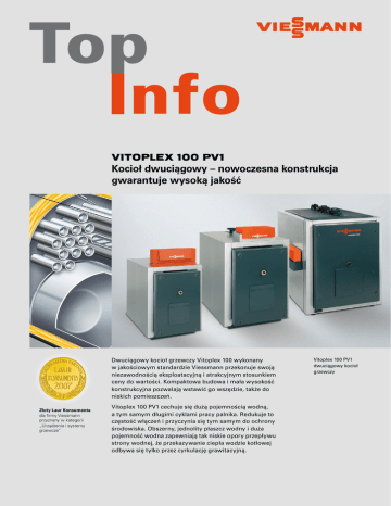 VITOPLEX 100 PV1 Kocioł dwuciągowy – nowoczesna konstrukcja gwarantuje wysoką jakość Dwuciągowy kocioł grzewczy Vitoplex 100 wykonany w jakościowym standardzie Viessmann przekonuje swoją niezawodnością eksploatacyjną i atrakcyjnym stosunkiem ceny do wartości. Kompaktowa budowa i mała wysokość konstrukcyjna pozwalają wstawić go wszędzie, także do niskich pomieszczeń. Złoty Laur Konsumenta dla firmy Viessmann przyznany w kategorii „Urządzenia i systemy grzewcze” Vitoplex 100 PV1 cechuje się dużą pojemnością wodną, a tym samym długimi cyklami pracy palnika. Redukuje to częstość włączeń i przyczynia się tym samym do ochrony środowiska. Obszerny, jednolity płaszcz wodny i duża pojemność wodna zapewniają tak niskie opory przepływu strony wodnej, że przekazywanie ciepła wodzie kotłowej odbywa się tylko przez cyrkulację grawitacyjną. Vitoplex 100 PV1 dwuciągowy kocioł grzewczy VITOPLEX 100 PV1 Niskotemperaturowy olejowy/gazowy kocioł grzewczy Znamionowa moc cieplna: 110 do 2 000 kW Viessmann sp. z o.o. ul. Karkonoska 65 53-015 Wrocław tel. 071/ 36 07 100 Infolinia: 0801 0801 24 www.viessmann.pl Kotły średniej i dużej mocy opracowano najnowocześniejszymi metodami. Poprzez zastosowanie obliczeń metodą elementów skończonych analizuje się rozkłady naprężeń, jak również optymalizuje się rozkład rur płomienicowych oraz rodzaj stosowanych połączeń spawanych Trwale wysoką jakość urządzeń gwarantują nowoczesne technologie wytwarzania. Vitoplex 100 621 do 2 000 kW Przegląd zalet: Standardowy olejowy/gazowy kocioł grzewczy 110 do 2 000 kW. Sprawność znormalizowana 92% (sprawność znormalizowaną można zwiększyć nawet o 10% przez przyłączenie ekonomizera kondenscyjnego Vitotrans 333 ze stali szlachetnej). Vitotrans 333 – ekonomizer kondensacyjny Vitoplex 100 110 do 620 kW Wysoka niezawodność i bezpieczeństwo eksploatacji dzięki zastosowaniu wysokogatunkowych materiałów i nowoczesnych technologii spawania. Bez wymogu minimalnego przepływu objętościowego wody grzewczej. Możliwość rozbudowania do instalacji wielokotłowej przy pomocy programu regulatorów Vitotronic. Łatwe wstawienie do kotłowni dzięki kompaktowej konstrukcji. Ekonomiczna i bezpieczna eksploatacja instalacji grzewczej dzięki cyfrowemu systemowi regulacyj nemu Vitotronic z możliwością komunikacji. Standardowe połączenie LON–BUS umożliwia całkowite włączenie do systemów zarządzania budynku. VITOPLEX 100 typ PV1 Znamionowa moc cieplna dolny zakres kW 110 151 górny zakres kW 150 200 Wymiary długość szerokość wysokość 201 250 251 310 311 400 401 500 501 620 621 780 781 951 1121 1351 1701 950 1120 1350 1700 2000 mm 1350 1490 1490 1670 1840 1840 1940 2115 2215 2465 2665 2850 3010 mm 800 800 880 880 950 950 1050 1460 1460 1555 1555 1660 1660 mm 1210 1210 1280 1280 1450 1450 1510 1690 1690 1920 1920 2020 2020 Ciężar z izolacją cieplną kg 415 460 525 580 790 845 1005 1490 1575 2260 2525 2920 3170 230 280 340 490 460 Pojemność wodna kotła litry 200 535 866 998 1296 1324 1665 1767 Twój Fachowy Doradca: Zmiany techniczne zastrzeżone T021 01 PL 04/2008 Obszerny płaszcz wodny i duża pojemność wodna zapewniają dobrą cyrkulację własną i bez pieczne odprowadzenie ciepła. Vitotronic – zdolny do komunikowania się cyfrowy system regulacji