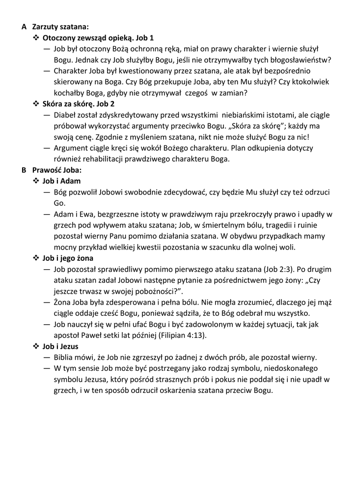 A Zarzuty szatana: Otoczony zewsząd opieką. Job 1 — Job był otoczony Bożą ochronną ręką, miał on prawy charakter i wiernie służył Bogu. Jednak czy Job służyłby Bogu, jeśli nie otrzymywałby tych błogosławieństw? — Charakter Joba był kwestionowany przez szatana, ale atak był bezpośrednio skierowany na Boga. Czy Bóg przekupuje Joba, aby ten Mu służył? Czy ktokolwiek kochałby Boga, gdyby nie otrzymywał czegoś w zamian? Skóra za skórę. Job 2 — Diabeł został zdyskredytowany przed wszystkimi niebiańskimi istotami, ale ciągle próbował wykorzystać argumenty przeciwko Bogu. „Skóra za skórę”; każdy ma swoją cenę. Zgodnie z myśleniem szatana, nikt nie może służyć Bogu za nic! — Argument ciągle kręci się wokół Bożego charakteru. Plan odkupienia dotyczy również rehabilitacji prawdziwego charakteru Boga. B Prawość Joba: Job i Adam — Bóg pozwolił Jobowi swobodnie zdecydować, czy będzie Mu służył czy też odrzuci Go. — Adam i Ewa, bezgrzeszne istoty w prawdziwym raju przekroczyły prawo i upadły w grzech pod wpływem ataku szatana; Job, w śmiertelnym bólu, tragedii i ruinie pozostał wierny Panu pomimo działania szatana. W obydwu przypadkach mamy mocny przykład wielkiej kwestii pozostania w szacunku dla wolnej woli. Job i jego żona — Job pozostał sprawiedliwy pomimo pierwszego ataku szatana (Job 2:3). Po drugim ataku szatan zadał Jobowi następne pytanie za pośrednictwem jego żony: „Czy jeszcze trwasz w swojej pobożności?”. — Żona Joba była zdesperowana i pełna bólu. Nie mogła zrozumieć, dlaczego jej mąż ciągle oddaje cześć Bogu, ponieważ sądziła, że to Bóg odebrał mu wszystko. — Job nauczył się w pełni ufać Bogu i być zadowolonym w każdej sytuacji, tak jak apostoł Paweł setki lat później (Filipian 4:13). Job i Jezus — Biblia mówi, że Job nie zgrzeszył po żadnej z dwóch prób, ale pozostał wierny. — W tym sensie Job może być postrzegany jako rodzaj symbolu, niedoskonałego symbolu Jezusa, który pośród strasznych prób i pokus nie poddał się i nie upadł w grzech, i w ten sposób odrzucił oskarżenia szatana przeciw Bogu.