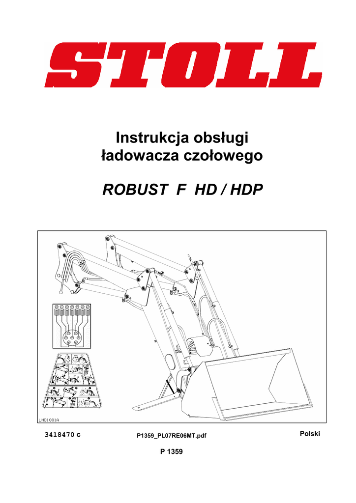 Instrukcja obsługi ładowacza czołowego ROBUST F HD / HDP 3418470 c P1359_PL07RE06MT.pdf P 1359 Polski Spis treści Przed uruchomieniem ........................................................................................................................... 4 Momenty dociągania śrub .................................................................................................................... 6 Ogólne wskazówki dotyczące bezpieczeństwa pracy i zapobiegania wypadkom ......................... 9 2.2 Naklejka - bezpieczeństwo (=> 2008)......................................................................................... 20 2.3 Naklejka - bezpieczeństwo (2008 =>)......................................................................................... 22 Dane techniczne .................................................................................................................................. 26 3.1 Dane techniczne ROBUST F HD / HDP ..................................................................................... 26 Opis....................................................................................................................................................... 27 5. Praktyczna praca ............................................................................................................................. 30 5.1 Obsługa ....................................................................................................................................... 30 5.1.1 Naklejka - Obsluga (=>2008)............................................................................................... 33 5.1.2 Naklejka - Obsluga (2008 =>)............................................................................................. 34 5.2 System hydrauliczny ................................................................................................................... 36 5.3 Montaż zespołu najazdowego..................................................................................................... 38 5.4 Demontaż zespołu wjazdowego ................................................................................................ 40 5.5 Mechaniczny zespół sterowania jedną dźwignią EHS (wyposażenie opcjonalne) ..................... 47 5.5.1 Rodzaj konstrukcji................................................................................................................ 47 5.5.2 Określenie kierunków pracy................................................................................................. 50 5.5.3 Określenie kierunków obsługi .............................................................................................. 51 5.5.4 Funkcje dodatkowe - joystick włącznik elektryczny ............................................................. 52 5.5.5 Obsługa - szybki ruch .......................................................................................................... 54 5.6 Narzędzie - rama szybkiej wymiany............................................................................................ 57 5.7 Hydrauliczna obsługa narzędzi z dołączanym zaworem przyspieszającym............................... 59 5.8 Schemat hydrauliki HD................................................................................................................ 62 5.8.1 HD (wersja podstawowa)..................................................................................................... 62 5.8.2 HD (wersja z pełnym wyposażeniem) ................................................................................. 64 5.9 Schemat połączeń elektryki HD .................................................................................................. 66 5.9.1 HD (wersja podstawowa)..................................................................................................... 66 5.9.2 HD - wersja z pełnym wyposażeniem z dwubiegunową wtyczką........................................ 67 5.9.3 HD - wersja z pełnym wyposażeniem z siedmiobiegunową wtyczką .................................. 69 5.10 Przełączenie - 3. obwód sterowania ......................................................................................... 70 5.11 Hydrauliczne równoległe prowadzenie narzędzi....................................................................... 72 5.11.1 Zalety hydraulicznego prowadzenia równoległego............................................................ 72 5.12 Blok sterowania dla prowadzenia równoległego ....................................................................... 79 5.13 Schemat hydrauliki HDP ........................................................................................................... 81 5.13.1 HDP (wersja podstawowa) ................................................................................................ 81 5.14 Wyposażenie elektryczne HDP................................................................................................. 83 5.14.1 HDP (standard – wersja podstawowa) .............................................................................. 83 5.14.2 HDP wersja z pełnym wyposażeniem z dwubiegunową wtyczką...................................... 84 5.14.3 HDP wersja z pełnym wyposażeniem z siedmiobiegunową wtyczką................................ 85 6. Balastowanie ciągnika przy pracy z ładowaczem czołowym...................................................... 86 2 7 Konserwacja i przeglądy.................................................................................................................. 87 8 Bezpieczeństwo pracy i zapobieganie wypadkom ....................................................................... 92 8.1 Jazda po drogach publicznych.................................................................................................... 92 8.2 Dopuszczalne obciążenia wideł do palet ..................................................................