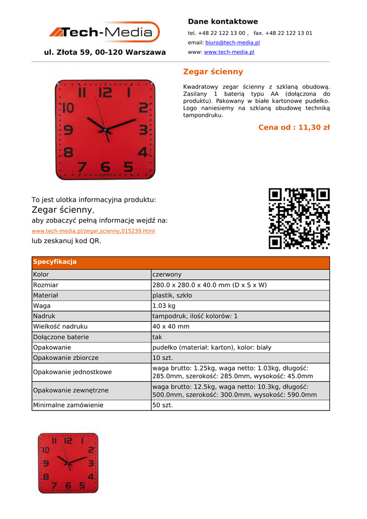 Dane kontaktowe tel. +48 22 122 13 00 , fax. +48 22 122 13 01 email: [email protected] ul. Złota 59, 00-120 Warszawa www: www.tech-media.pl Zegar ścienny Kwadratowy zegar ścienny z szklaną obudową. Zasilany 1 baterią typu AA (dołączona do produktu). Pakowany w białe kartonowe pudełko. Logo naniesiemy na szklaną obudowę techniką tampondruku. Cena od : 11,30 zł To jest ulotka informacyjna produktu: Zegar ścienny, aby zobaczyć pełną informację wejdź na: www.tech-media.pl/zegar,scienny,015239.html lub zeskanuj kod QR. Specyfikacja Kolor czerwony Rozmiar 280.0 x 280.0 x 40.0 mm (D x S x W) Materiał plastik, szkło Waga 1.03 kg Nadruk tampodruk, ilość kolorów: 1 Wielkość nadruku 40 x 40 mm Dołączone baterie tak Opakowanie pudełko (materiał: karton), kolor: biały Opakowanie zbiorcze 10 szt. Opakowanie jednostkowe waga brutto: 1.25kg, waga netto: 1.03kg, długość: 285.0mm, szerokość: 285.0mm, wysokość: 45.0mm Opakowanie zewnętrzne waga brutto: 12.5kg, waga netto: 10.3kg, długość: 500.0mm, szerokość: 300.0mm, wysokość: 590.0mm Minimalne zamówienie 50 szt.