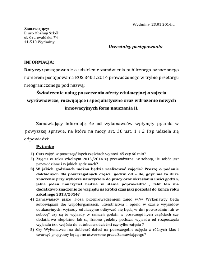Wydminy, 23.01.2014r.. Zamawiający: Biuro Obsługi Szkół ul. Grunwaldzka 74 11-510 Wydminy Uczestnicy postępowania INFORMACJA: Dotyczy: postępowanie o udzielenie zamówienia publicznego oznaczonego numerem postępowania BOS 340.1.2014 prowadzonego w trybie przetargu nieograniczonego pod nazwą: Świadczenie usług poszerzenia oferty edukacyjnej o zajęcia wyrównawcze, rozwijające i specjalistyczne oraz wdrożenie nowych innowacyjnych form nauczania II. Zamawiający informuje, że od wykonawców wpłynęły pytania w powyższej sprawie, na które na mocy art. 38 ust. 1 i 2 Pzp udziela się odpowiedzi: Pytania: 1) Czas zajęć w poszczególnych częściach wynosi 45 czy 60 min? 2) Zajęcia w roku szkolnym 2013/2014 są przewidziane w soboty, ile sobót jest przewidziane i w jakich godzinach? 3) W jakich godzinach można będzie realizować zajęcia? Proszę o podanie dokładnych dla poszczególnych części godzin od – do, gdyż ma to duże znaczenie przy wyborze nauczyciela do pracy oraz określaniu ilości godzin, jakie jeden nauczyciel będzie w stanie poprowadzić , fakt ten ma dodatkowo znaczenie ze względu na krótki czas jaki pozostał do końca roku szkolnego 2013/2014? 4) Zamawiający pisze „Poza przeprowadzeniem zajęć w/w Wykonawcy będą zobowiązani do: współorganizacji, uczestnictwa i opieki w czasie wyjazdów edukacyjnych; wyjazdy edukacyjne odbywać się będą w dni powszednie lub w sobotę” czy są to wyjazdy w ramach godzin w poszczególnych częściach czy dodatkowe niepłatne, jak są liczone godziny podczas wyjazdu od rozpoczęcia wyjazdu tzn. wejścia do autobusu z dziećmi czy tylko zajęcia ? 5) Czy Wykonawca ma dobierać dzieci na poszczególne zajęcia z różnych klas i tworzyć grupy, czy będą one utworzone przez Zamawiającego? 6) Czy Zamawiający dopuszcza zwiększenie liczby nauczycieli prowadzących zajęcia ponad ilość podaną w wykazie będącym załącznikiem do oferty, oczywiście przy spełnieniu warunków z SIWZ ? 7) Czy Zamawiający zapewnia materiały biurowe, oraz bezpłatny dostęp do urządzeń biurowych np. dostęp do kserokopiarki, kamery do nagrywania filmów ; potrzebne do realizacji zajęć np. papier ksero potrzebne np. do prowadzenia gazetki szkolnej ? 8) Czy od razu po rozpoczęciu zajęć będą dostępne pomoce dydaktyczne, o których jest zapis w SIWZ np. w części 31 tablica multimedialna z oprogramowaniem, kamera, drukarka, aparat fotograficzny, zestawy doświadczalne, gry edukacyjne. oraz inne materiały w pozostałych częściach? 9) Czy obowiązki Wykonawcy np. tworzenie gazetki, zamieszczanie na stronie www, zorganizowanie wystawy (wiersze, baśnie) oraz inne są wliczane do godzin jakie obejmuje dana część czy są to prace jakie ma wykonać Wykonawca dodatkowo ? 10)Czy instruktor pływania ma jechać z dziećmi na basen jako opiekun czy tylko prowadzić zajęcia na basenie? 11)Opiekun w/w zajęć czy ma opiekować się dziećmi podczas ich dojazdu na basen , a jeżeli tak to co w sytuacji jeżeli od momentu wyjazdu do momentu powrotu minie więcej niż 2 godziny przewidziane w SIWZ gdyż prawdopodobnie jest to za mało czasu na dojazd, zajęcia oraz powrót z basenu ? 12)Czemu Zamawiający dyskryminuje nauczycieli młodych nie posiadających stopnia awansu nauczyciela kontraktowego oraz 3 letniego stażu przecież takie osoby mają również pełne uprawnienia do prowadzenia zajęć po ukończeniu studiów w danym kierunku? 13) W punkcie 4 SIWZ Zamawiający pisze „Zakres zamówienia obejmuje: 71 części” dalej, że „dopuszcza możliwość składania ofert częściowych na jedną lub większą liczbę wymienionych w niniejszej specyfikacji części zamówienia od 3 do 73” a zamówienie składa się z 72 części od 2 do 73 ? 14)Czy Wykonawca musi do każdej części przedstawić inną osobę czy jedna osoba może być wpisana do kilku części ( w niektórych ilość godzin do przepracowania jest bardzo mała np. 30 godzin lub duża np. 1020 godzin ) czy w przeciwnym razie Wykonawca zobowiązany jest zapewnić min. 72 osoby ? 15)Proszę o zmianę zapisu w projekcie umowy w par. 10 pkt 2.5 „jeżeli zmiana osoby wykonującej zamówienie stanie się konieczna z jakichkolwiek innych przyczyn niezależnych od Wykonawcy (np. rezygnacji); zmiana jest możliwa jedynie na nowe osoby o kwalifikacjach i doświadczeniu nie niższych niż zaproponowane przez Wykonawcę w Ofercie” na „ osoby spełniające warunki z SIWZ” gdyż może być niemożliwym spełnienie tego warunku umowy z przyczyn niezależnych od Wykonawcy. Odpowiedzi: Ad.1) Godzina zajęć rozwijających uzdolnienia i dydaktyczno- wyrównawczych trwa 45 min., a godzina zajęć specjalistycznych (korekcyjno- kompensacyjnych, logopedycznych) trwa 60 min., basen przewidziany jest na 35 min. Ad.2)Przewidziana jest praca w jedną sobotę w miesiącu w godzinach 8-13. W przypadku zajęć na basenie przewiduje się pracę średnio w 2 soboty w miesiącu. Ad.3) Ze względu na przedłużający się proces rekrutacji, Zamawiający nie jest w stanie podać dokładnych godzin w jakich będą odbywać się poszczególne zajęcia. Jednocześnie informuję, iż ze wstępnych ustaleń realizacja zajęć pozalekcyjnych będzie odbywać się w następujących przedziałach czasowych : Lp 1. 2. 3. 4. 5. 6. Zajęcia w klasach/ rodzaj zajęć Klasy I-III Klasy IV-VI Gimnazjum Doradztwo zawodowe grupowe Indywidualne zajęcia z logopedii, korekcyjnokompens., doradztwo zawod. Zajęcia na basenie Godziny od -do 12-14 (od poniedz. do piatku)+ sobota 12-15 (od poniedz. do piatku)+ sobota 13-16 (od poniedz. do piatku)+ sobota W każdej klasie III, 13-14 W uzgodnieniu z uczniami objętymi pomocą W soboty Liczba godzin do realizacji jest rzeczywiście duża, więc składając ofertę trzeba wziąć pod uwagę realizację zajęć w wyżej podanych godzinach każdego dnia od poniedziałku do piątku. Oferent składając ofertę musi przewidzieć czy podejmuje się pracy