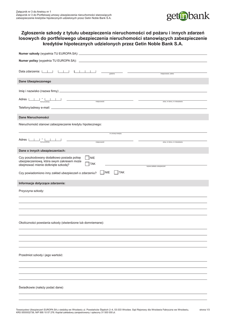 Załącznik nr 3 do Aneksu nr 1 Załącznik nr 3 do Portfelowej umowy ubezpieczenia nieruchomości stanowiących zabezpieczenie kredytów hipotecznych udzielonych przez Getin Noble Bank S.A. Zgłoszenie szkody z tytułu ubezpieczenia nieruchomości od pożaru i innych zdarzeń losowych do portfelowego ubezpieczenia nieruchomości stanowiących zabezpieczenie kredytów hipotecznych udzielonych przez Getin Noble Bank S.A. Numer szkody (wypełnia TU EUROPA SA): Numer polisy (wypełnia TU EUROPA SA): Data zdarzenia: godzina miejscowość, adres Dane Ubezpieczonego Imię i nazwisko (nazwa firmy) Adres miejscowość kod pocztowy ulica, nr domu, nr mieszkania Telefony/adresy e-mail: Dane Nieruchomości Nieruchomość stanowi zabezpieczenie kredytu hipotecznego: nr umowy kredytu Adres kod pocztowy miejscowość ulica, nr domu, nr mieszkania Dane o innych ubezpieczeniach: Czy poszkodowany dodatkowo posiada polisę ubezpieczeniową, która swym zakresem może obejmować mienie dotknięte szkodą? NIE TAK Czy powiadomiono inny zakład ubezpieczeń o zdarzeniu? nazwa zakładu ubezpieczeń NIE TAK Informacje dotyczące zdarzenia: Przyczyna szkody: Okoliczności powstania szkody (stwierdzone lub domniemane): Przedmiot szkody i jego wartość: Świadkowie (należy podać dane) Towarzystwo Ubezpieczeń EUROPA SA z siedzibą we Wrocławiu ul. Powstańców Śląskich 2–4, 53-333 Wrocław. Sąd Rejonowy dla Wrocławia Fabryczna we Wrocławiu, KRS 0000002736, NIP 895 10 07 276. Kapitał zakładowy zarejestrowany i opłacony 31 500 000 zł. strona 1/3 Załącznik nr 3 do Aneksu nr 1 Załącznik nr 3 do Portfelowej umowy ubezpieczenia nieruchomości stanowiących zabezpieczenie kredytów hipotecznych udzielonych przez Getin Noble Bank S.A. O szkodzie powiadomiono: Policję Straż Pożarną Administrację budynku Inne Oświadczenia: 1. Oświadczam, że informacje zamieszczone w niniejszym druku podałam/em zgodnie z prawdą i moją najlepszą wiedzą. Potwierdzam, że zostałam/em poinformowana/ny, iż w przypadku niewłaściwego / niepełnego wypełnienia druku, może wystąpić konieczność uzupełnienia informacji w nim zawartych. 2. Oświadczam, że z tytułu zaistniałej szkody nie otrzymałam/em odszkodowania z innego zakładu ubezpieczeń i nie ubiegam się o odszkodowanie w innym zakładzie lub innej jednostce TU EUROPA SA. 3. Zobowiązuję się do zwrotu otrzymanego odszkodowania, w terminie 7 dni od daty wezwania przez TU EUROPA SA, jeżeli zostaną ujawnione inne okoliczności niż przyjęto za podstawę do ustalenia stanu faktycznego i wypłaty odszkodowania. 4. Wyrażam zgodę na przetwarzanie moich danych osobowych przez Towarzystwo Ubezpieczeń EUROPA Spółka Akcyjna z siedzibą we Wrocławiu, adres ul. Powstańców Śląskich 2-4 w związku z objęciem mnie ochroną ubezpieczeniową na podstawie Warunków portfelowego ubezpieczenia nieruchomości stanowiących zabezpieczenie kredytów hipotecznych udzielonych przez Getin Noble Bank S.A. oraz świadczeniem tej ochrony. Ponadto zgadzam się na przekazanie moich danych firmie reasekuracyjnej, jeżeli będzie to wymagane w związku z warunkami reasekuracji ryzyk ubezpieczeniowych i podmiotom realizującym należne mi świadczenia wynikające z Warunków portfelowego ubezpieczenia nieruchomości stanowiących zabezpieczenie kredytów hipotecznych udzielonych przez Getin Noble Bank S.A. 5. Klauzula dla osób fizycznych: Zgodnie z art. 23 ust. 1 ustawy z dnia 29.08.1997 r. o ochronie danych osobowych (Dz.U. Nr 133/97 poz. 883) Towarzystwo Ubezpieczeń EUROPA SA z siedzibą we Wrocławiu przy ul. Powstańców Śląskich 2-4 informuje, że jest administratorem Pani/a danych osobowych, które będą przez nas przetwarzane w celu realizacji zadań statutowych. Jednocześnie informujemy, że służy Pani/u prawo do wglądu do swoich danych osobowych i prawo ich poprawiania, a przetwarzanie danych w celach innych niż działalność statutowa TU EUROPA SA wymaga Pani/a uprzedniej zgody. Do zawiadomienia załączam: imię i nazwisko seria i numer dokumentu tożsamości miesjcowość data podpis data pieczęć i podpis osoby przyjmującej zawiadomienie *) właściwe zaznaczyć; W przypadku braku informacji, wpisać „NIE WIEM” W razie zajścia zdarzenia uprawniającego do skorzystania ze świadczeń Home Assistance wynikających z udzielonej ochrony ubezpieczeniowej Ubezpieczony powinien zawiadomić telefoniczne Centrum Pomocy pod czynnym całą dobę numerem: (+48 22) 563 11 58, a w razie awarii tego numeru, numer awaryjny (+48 22) 383 21 58; fax. (+48 22) 522 25 45. Towarzystwo Ubezpieczeń EUROPA SA z siedzibą we Wrocławiu ul. Powstańców Śląskich 2–4, 53-333 Wrocław. Sąd Rejonowy dla Wrocławia Fabryczna we Wrocławiu, KRS 0000002736, NIP 895 10 07 276. Kapitał zakładowy zarejestrowany i opłacony 31 500 000 zł. strona 2/3 Załącznik nr 3 do Aneksu nr 1 Załącznik nr 3 do Portfelowej umowy ubezpieczenia nieruchomości stanowiących zabezpieczenie kredytów hipotecznych udzielonych przez Getin Noble Bank S.A. Wykaz jednostek organizacyjnych Departamentu Obsługi Produktów TU EUROPA SA upoważnionych do obsługi klientów zgłaszających szkody ubezpieczeniowe. Lp. Nazwa jednostki Adres Telefony/fax 1 Departament Obsługi Produktów TU EUROPA SA – Centrala we Wrocławiu 53-333 Wrocław ul. Powstańców Śląskich 2–4 Tel. (71) 33-41-855, 33-41-856 609 67-87-18 609 67-87-36 Fax (71) 33-41-869 2 Biuro Regionalne we Wrocławiu 53-333 Wrocław ul. Powstańców Śląskich 2–4 Tel. (71) 33-41-859 do 866, Fax (71) 33-41-867 609 67-87-46, 609 67-89-25 609 67-92-60, 697 97-26-34 3 Biuro Regionalne w Katowicach 40-085 Katowice, ul. Mickiewicza 29 p.1072 Tel./Fax (32) 25-36-849 609 67-87-25 4 Biuro Regionalne w Krakowie 31-503 Kraków, ul. Lubicz 25 Tel./Fax (12) 61-97-824 609 67-87-24 5 Biuro Regionalne w Łodzi 90-319 Łódź, ul. Wigury 21 Tel./Fax (42) 637-05-01 609 67-87-26 6 Biuro Regionalne w Warszawie 02-001 Warszawa, Al. Jerozolims