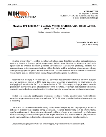 MDH System Strona 1 MDH-SYSTEM ul. Bajkowa 5, Lublin tel./fax.81-444-62-85 lub kom.693-865-235 e mail: [email protected] Monitor TFT LCD 21,5", 2 wejścia VIDEO, S-VIDEO, VGA, HDMI, AUDIO, pilot, VMT-22PVM Produkt z kategorii: Monitory przemysłowe Cena: 8001.00 zł z VAT (6504.88 zł netto) Monitor przemysłowy - solidna metalowa obudowa oraz dodatkowa pleksa zabezpieczająca matrycę. Monitor dostępu publicznego (ang. Public View Monitor) - idealny w punktach sprzedaży do witania klientów poprzez wyświetlanie aktualnych promocji, reklam lub przypominając o aktywnym monitoringu wideo. Posiada solidną metalową obudowę oraz pleksę zabezpieczającą ekran przed aktami wandalizmu. Dodatkowo w monitorze można zamontować wewnętrzną kamerę obserwującą osoby stojące aktualnie przed monitorem. Podświetlenie matrycy w technologii LED powoduje realistyczne oddawanie kolorów, zużycie energii mniejsze nawet o 40% oraz znacznie mniejszą awaryjność w porównaniu do tradycyjnych monitorów LCD z podświetleniem CCFL. Na uwagę zasługuje zamocowanie przycisków sterujących poza obszarem roboczym monitora. Tego typu rozwiązanie umożliwia włożenie go do obudowy, zapobiegającej osobom trzecim manipulowanie nastawami monitora. Model ten, posiada praktycznie wszystkie rodzaje wejść, umożliwiając wyświetlenie dowolnych sygnałów stosowanych w technice CCTV. Monitor posiada idealnie zlicowany ekran z obudową. Umożliwia to zastosowanie dodatkowej szyby wandaloodpornej bez negatywnego zjawiska refleksów świetlnych pomiędzy szybą a ekranem. Monitor dedykowany jest do wyświetlania spotów reklamowych z komputera w miejscach publicznych np. w poczekalniach itp. Ciekawym rozwiązaniem jest zamocowanie głośników z tyłu obudowy. Nie przeszkadza to przy odsłuchu audio z rejestratora a jednocześnie nie zmniejsza obszaru przedniego panelu monitora. Urządzenie jest przystosowane do pracy ciągłej, w pomieszczeniach zamkniętych. MDH System Strona 2 Przekątna matrycy: 21.5 " Rozdzielczość nominalna: 1920 x 1080 px Proporcje ekranu: 16 : 9 Typ matrycy: Kolorowa matryca TFT-LCD Podświetlenie matrycy: W technologii LED Obsługa standardów: PAL/NTSC Kontrast: 1000 : 1 Jasność: 300 cd/m2 Kąty widzenia: 160 ° w poziomie 170 ° w pionie Czas reakcji: 4 ms Wbudowane głośniki: 2 x 3 W • Gniazda Composite Video (BNC): 2x wej, 2x wyj • 1x VGA • 1x HDMI Gniazda podłączeniowe: • 1x S-VIDEO • Wej. audio: (Jack) • 2x wyj. audio: 2x Cinch L/R Rodzaj obudowy: Metal Standard mocowania monitora: VESA 100 Zasilanie: 24 V DC / 1.5 A (brak zasilacza w zestawie) Pobór mocy: max. 35 W (praca) Sterowanie monitorem: OSD - za pomocą pilota lub przyciskami na obudowie • Filtr grzebieniowy 3D • Redukcja szumów 3D Wybrane funkcje: • Funkcje PIP oraz POP - obraz w obrazie oraz obraz na obrazie • Automatyczna regulacja obrazu Temperatura pracy: -20 °C ... 60 °C Waga: 5 kg Wymiary: 504 x 351 x 77 mm Obsługiwane języki: angielski, chiński, francuski, hiszpański, niemiecki, portugalski, rosyjski, włoski MDH System Strona 3 Widok z boku (widoczne przyciski sterujące): MDH System Strona 4 Widok od strony mocowania: Złącza monitora: Miejsce na kamerę obserwującą obszar przed monitorem: MDH System Strona 5 Wymiary uchwytu do mocowania kamery wewnętrznej monitora: W zestawie: Zapraszamy do naszego sklepu internetowego www.mdh-system.pl Dokument wygenerowany 2017-03-03 o godzinie 12:47