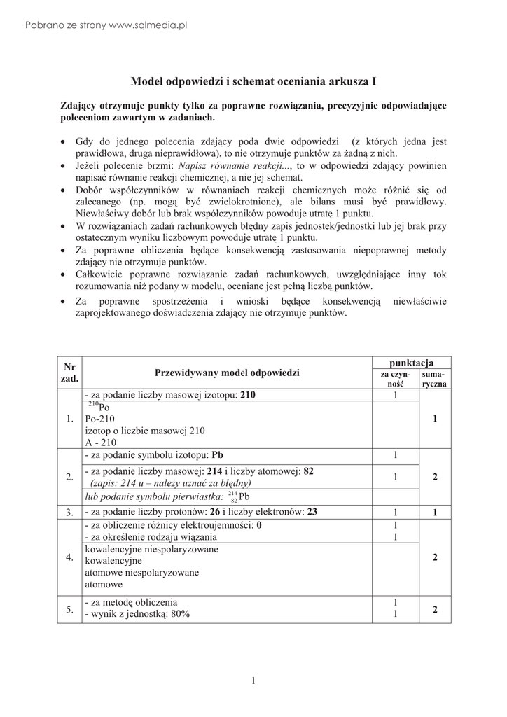 Pobrano ze strony www.sqlmedia.pl Model odpowiedzi i schemat oceniania arkusza I Zdający otrzymuje punkty tylko za poprawne rozwiązania, precyzyjnie odpowiadające poleceniom zawartym w zadaniach. x Gdy do jednego polecenia zdający poda dwie odpowiedzi (z których jedna jest prawidáowa, druga nieprawidáowa), to nie otrzymuje punktów za Īadną z nich. x JeĪeli polecenie brzmi: Napisz równanie reakcji..., to w odpowiedzi zdający powinien napisaü równanie reakcji chemicznej, a nie jej schemat. x Dobór wspóáczynników w równaniach reakcji chemicznych moĪe róĪniü siĊ od zalecanego (np. mogą byü zwielokrotnione), ale bilans musi byü prawidáowy. NiewáaĞciwy dobór lub brak wspóáczynników powoduje utratĊ 1 punktu. x W rozwiązaniach zadaĔ rachunkowych báĊdny zapis jednostek/jednostki lub jej brak przy ostatecznym wyniku liczbowym powoduje utratĊ 1 punktu. x Za poprawne obliczenia bĊdące konsekwencją zastosowania niepoprawnej metody zdający nie otrzymuje punktów. x Caákowicie poprawne rozwiązanie zadaĔ rachunkowych, uwzglĊdniające inny tok rozumowania niĪ podany w modelu, oceniane jest peáną liczbą punktów. x Za poprawne spostrzeĪenia i wnioski bĊdące konsekwencją niewáaĞciwie zaprojektowanego doĞwiadczenia zdający nie otrzymuje punktów. Nr zad. 1. 2. 3. 4. 5. punktacja Przewidywany model odpowiedzi - za podanie liczby masowej izotopu: 210 210 Po Po-210 izotop o liczbie masowej 210 A - 210 - za podanie symbolu izotopu: Pb za czynnoĞü sumaryczna 1 1 1 - za podanie liczby masowej: 214 i liczby atomowej: 82 (zapis: 214 u – naleĪy uznaü za báĊdny) lub podanie symbolu pierwiastka: 214 82 Pb - za podanie liczby protonów: 26 i liczby elektronów: 23 - za obliczenie róĪnicy elektroujemnoĞci: 0 - za okreĞlenie rodzaju wiązania kowalencyjne niespolaryzowane kowalencyjne atomowe niespolaryzowane atomowe 1 2 1 1 1 1 - za metodĊ obliczenia - wynik z jednostką: 80% 1 1 1 2 2 Pobrano ze strony www.sqlmedia.pl 6. metoda: 1. obliczenie masy molowej bromku wapnia: M = 200g/mol (lub masy cząsteczkowej 200 u) 2. obliczenie zawartoĞci procentowej bromu 160g 100% %Br 200g wynik: 80% metoda: 1.ustalenie stosunku masowego mBr: mCa = 4:1 2. obliczenie zawartoĞci procentowej bromu 4 %Br 100% 5 wynik: 80% - za uzupeánienie zdaĔ I: KCl II: nienasycony III: ogrzaü IV: ocháodziü 4 uzup.– 2 p 3, 2 uzup. 1 p 1, 0 uzup.– 0 p 2 - za sporządzenie wykresu rozpuszczalnoĞü, g / 100g wody 50 40 37 7. 30 3 20 273 293 313 333 353 temperatura, K 313 oznaczenie osi (opis osi i jednostek) szkic wykresu (naniesienie punktów i poáączenie ich linią) - za oszacowanie wartoĞci rozpuszczalnoĞci: okoáo 37g/100g wody lub 37g (moĪna uznaü za poprawne kaĪde oszacowanie wynikające z wykonanego wykresu i dokáadnoĞci przyjĊtej skali) 2 1 1 1 Pobrano ze strony www.sqlmedia.pl 8. 9. a) -za podanie wzoru odczynnika np. AgNO3 lub CH3COOAg lub AgCH3COO lub Pb(NO3)2 lub (CH3COO)2Pb lub Pb(CH3COO)2 b) - za napisanie równania reakcji w formie jonowej skróconej Ag+ + Cl– ĺ AgCl lub Pb2+ + 2Cl- ĺ PbCl2 (moĪna uznaü zapis peány jonowy z wykreĞlonymi jonami powtarzającymi siĊ po obu stronach równania) - za wskazanie kolejnoĞci wydzielania w pierwszej kolejnoĞci piasek nastĊpnie chlorek sodu - za podanie zastosowanych metod sączenie lub sedymentacja i dekantacja lub dekantacja odparowanie wody lub krystalizacja chlorku sodu - za podanie numeru doĞwiadczenia i wskazanie czynnika I, stĊĪenie kwasu - za przedstawienie bilansu elektronowego O20 + 4e– ĺ 2O–II x3 2N–III – 6e– ĺ N20 x2, –III 0 – lub 2N ĺ N2 + 6e x2, O20 + 4e– ĺ 2O–II x3 11. lub N–III ĺ N0+ 3e– x2, O0 + 2e– ĺ O–II x3 –III – 0 O0 + 2e– ĺ O–II x3 lub N – 3e ĺ N x2, - za dobranie wspóáczynników: 4NH3 + 3O2 ĺ 2N2 + 6H2O 10. - za wskazanie 12. utleniacz: S, reduktor: Zn - za wybór dwóch metod i zapisanie odpowiednich równaĔ reakcji metoda I: H2S + 2KOH o K2S + 2H2O 13. metoda II: H2S + K2O o K2S + H2O metoda III: H2S + 2K o K2S + H2 - za podanie numerów probówek II i IV - za wskazanie numeru probówki 15. II 14. 16. 17. 18. 19. 20. - za uzupeánienie pH < 7 - za uzupeánienie brakujących reagentów i wspóáczynników stechiometrycznych 4Al + 3O2o 2Al2O3 2K + 2H2O o 2KOH + H2 SO3 + H2O o H2SO4 - za wybór i zakwalifikowanie do odpowiednich grup 1. kwasy beztlenowe: HCl, H2S, HBr 2. mocne kwasy tlenowe: HNO3, H2SO4 3. wodorotlenki rozpuszczalne w wodzie: KOH, Ba(OH)2 - za odp. D - za odp. D 3 1 1 2 1 2x1 3 1 1 1 2 1 1 1 2x1 2 1 1 1 1 1 1 3 x1 3 3x1 3 1 1 1 1 Pobrano ze strony www.sqlmedia.pl - za równanie fermentacji alkoholowej droĪdĪe 2C2H5OH + 2CO2 C6H12O6 - za równanie rozkáadu wapienia 21. T CaCO3 o CaO + CO2 1 2 1 zapisy okreĞlające warunki zachodzenia reakcji nie są wymagane 22. - za odp. A - za metodĊ obliczenia - za wynik z jednostką: V = 336 dm3 metoda: 1.ustalenie stosunku molowego nO2 : nCO2 [6 : 4 lub 3 : 2 lub 1,5: 1 lub 1,5] 2. obliczenie liczby moli tlenu n = 15 moli 23. wynik 3. obliczenie objĊtoĞci tlenu: V = 336 dm3 metoda: 1. interpretacja równania: 6 22,4 dm3O2- 4 mole CO2 X dm3 O2 – 10 moli CO2 wynik: 2. obliczenie objĊtoĞci tlenu: V = 336 dm3 - za narysowanie wzoru póástrukturalnego - za podanie nazwy systematycznej CH2=CHCH2CH3 but-1-en (1-buten) CH3CH=CHCH3 but-2-en (2-buten) CH3CH=CH2 CH3 1 1 1 1 2 1 1 2-metylopropen (metylopropen) 24. CH2 CH2 CH2 CH2 CH2 CH2 cyklobutan lub 2 CH3 CH CH3 lub metylocyklopropoan uwaga: naleĪy przyznaü punkt za poprawnie uáoĪoną nazwĊ systematyczną w przypadku, jeĞli zdający uáoĪy poprawnie wzór innego wĊglowodoru: np. CH3-CH2-CH(CH3)-CH3 (wzór 0 pkt) 2-metylobutan (nazwa 1 pkt) uwaga: wyjątkowo, jeĞli zdający uáoĪy poprawnie wzór strukturalny zamiast póástrukturalnego – naleĪy przyznaü 1 pkt - za równania reakcji 1: CH3CH2CHO + H2 ĺ CH3CH2CH2OH 2: CH3CH2CHO + Ag2O ĺ CH3CH2COOH + 2Ag 1 1 H SO stĊĪ 25. 3: CH3CH2CH2OH + CH3CH2COOH 2 4