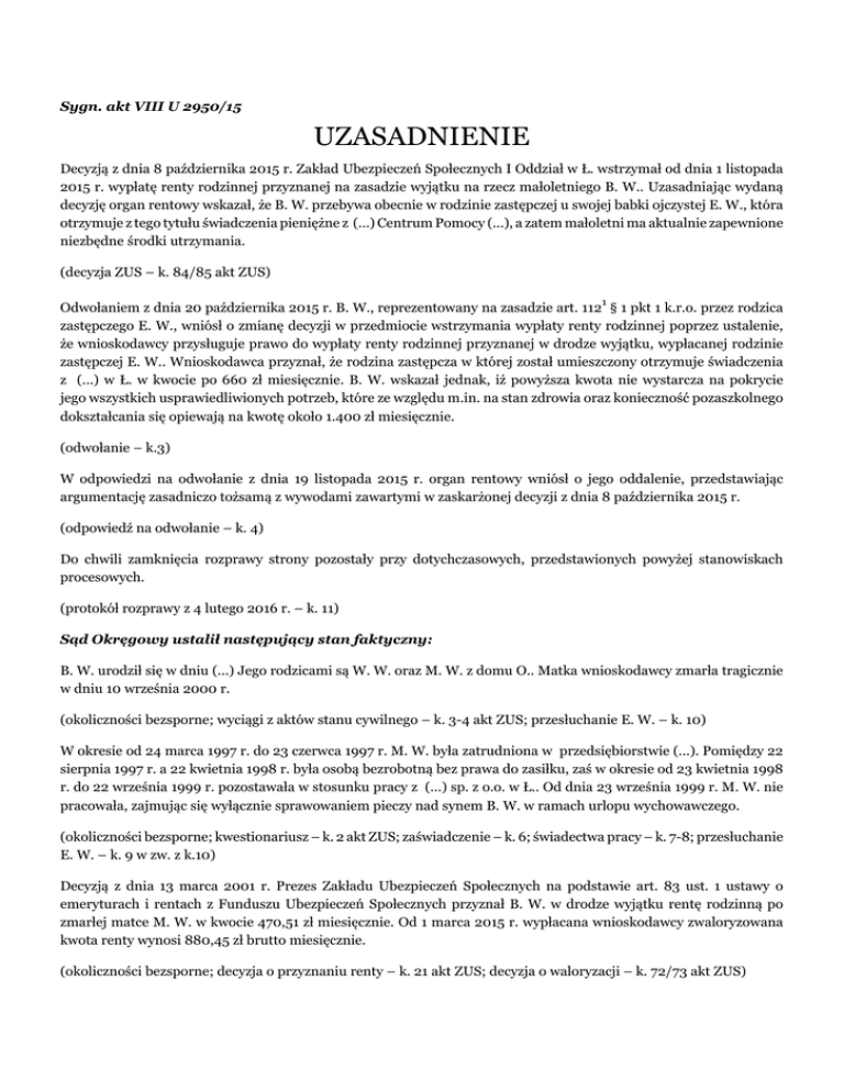 Sygn. akt VIII U 2950/15 UZASADNIENIE Decyzją z dnia 8 października 2015 r. Zakład Ubezpieczeń Społecznych I Oddział w Ł. wstrzymał od dnia 1 listopada 2015 r. wypłatę renty rodzinnej przyznanej na zasadzie wyjątku na rzecz małoletniego B. W.. Uzasadniając wydaną decyzję organ rentowy wskazał, że B. W. przebywa obecnie w rodzinie zastępczej u swojej babki ojczystej E. W., która otrzymuje z tego tytułu świadczenia pieniężne z (...) Centrum Pomocy (...), a zatem małoletni ma aktualnie zapewnione niezbędne środki utrzymania. (decyzja ZUS – k. 84/85 akt ZUS) Odwołaniem z dnia 20 października 2015 r. B. W., reprezentowany na zasadzie art. 1121 § 1 pkt 1 k.r.o. przez rodzica zastępczego E. W., wniósł o zmianę decyzji w przedmiocie wstrzymania wypłaty renty rodzinnej poprzez ustalenie, że wnioskodawcy przysługuje prawo do wypłaty renty rodzinnej przyznanej w drodze wyjątku, wypłacanej rodzinie zastępczej E. W.. Wnioskodawca przyznał, że rodzina zastępcza w której został umieszczony otrzymuje świadczenia z (...) w Ł. w kwocie po 660 zł miesięcznie. B. W. wskazał jednak, iż powyższa kwota nie wystarcza na pokrycie jego wszystkich usprawiedliwionych potrzeb, które ze względu m.in. na stan zdrowia oraz konieczność pozaszkolnego dokształcania się opiewają na kwotę około 1.400 zł miesięcznie. (odwołanie – k.3) W odpowiedzi na odwołanie z dnia 19 listopada 2015 r. organ rentowy wniósł o jego oddalenie, przedstawiając argumentację zasadniczo tożsamą z wywodami zawartymi w zaskarżonej decyzji z dnia 8 października 2015 r. (odpowiedź na odwołanie – k. 4) Do chwili zamknięcia rozprawy strony pozostały przy dotychczasowych, przedstawionych powyżej stanowiskach procesowych. (protokół rozprawy z 4 lutego 2016 r. – k. 11) Sąd Okręgowy ustalił następujący stan faktyczny: B. W. urodził się w dniu (...) Jego rodzicami są W. W. oraz M. W. z domu O.. Matka wnioskodawcy zmarła tragicznie w dniu 10 września 2000 r. (okoliczności bezsporne; wyciągi z aktów stanu cywilnego – k. 3-4 akt ZUS; przesłuchanie E. W. – k. 10) W okresie od 24 marca 1997 r. do 23 czerwca 1997 r. M. W. była zatrudniona w przedsiębiorstwie (...). Pomiędzy 22 sierpnia 1997 r. a 22 kwietnia 1998 r. była osobą bezrobotną bez prawa do zasiłku, zaś w okresie od 23 kwietnia 1998 r. do 22 września 1999 r. pozostawała w stosunku pracy z (...) sp. z o.o. w Ł.. Od dnia 23 września 1999 r. M. W. nie pracowała, zajmując się wyłącznie sprawowaniem pieczy nad synem B. W. w ramach urlopu wychowawczego. (okoliczności bezsporne; kwestionariusz – k. 2 akt ZUS; zaświadczenie – k. 6; świadectwa pracy – k. 7-8; przesłuchanie E. W. – k. 9 w zw. z k.10) Decyzją z dnia 13 marca 2001 r. Prezes Zakładu Ubezpieczeń Społecznych na podstawie art. 83 ust. 1 ustawy o emeryturach i rentach z Funduszu Ubezpieczeń Społecznych przyznał B. W. w drodze wyjątku rentę rodzinną po zmarłej matce M. W. w kwocie 470,51 zł miesięcznie. Od 1 marca 2015 r. wypłacana wnioskodawcy zwaloryzowana kwota renty wynosi 880,45 zł brutto miesięcznie. (okoliczności bezsporne; decyzja o przyznaniu renty – k. 21 akt ZUS; decyzja o waloryzacji – k. 72/73 akt ZUS) Postanowieniem Sądu Rejonowego w Łowiczu z dnia 24 września 2004 r. wydanym w sprawie o sygn. akt III Nsm 91/04 władza rodzicielska W. W. nad małoletnim B. W. została ograniczona poprzez umieszczenie małoletniego w rodzinie zastępczej u dziadków ojczystych – E. W. i S. W.. (okoliczność bezsporna; postanowienie – k. 34 akt ZUS) Ojciec małoletniego W. W. ma obecnie 42 lata, cierpi na schorzenia bioder oraz na astmę, stara się pracować dorywczo. Ustalono wobec niego obowiązek alimentacyjny na rzecz B. W. w kwocie po 50 zł miesięcznie. (okoliczności bezsporne; przesłuchanie E. W. – k. 9 w zw. z k. 10) Od początku roku 2015 E. i S. W. pobierają z (...) Centrum Pomocy (...) w Ł. świadczenie pieniężne na pokrycie kosztów utrzymania B. W. w rodzinnej pieczy zastępczej. W okresie od 1 do 30 września 2015 r. pobrane przez rodziców zastępczych świadczenie opiewało na kwotę 660 zł. (okoliczność przyznana; zaświadczenie – k. 82/83 akt ZUS; odwołanie – k. 2; przesłuchanie wnioskodawczyni – k. ) W roku szkolnym 2015/2016 małoletni B. W. uczęszcza do III klasy Gimnazjum w Ł.. Wnioskodawca ma duże problemy w nauce, powtarzał pierwszą klasę gimnazjum. B. W. jest uzdolniony plastycznie, w przyszłości zamierza ukończyć zasadniczą szkołę zawodową o profilu stolarskim. Od września 2016 r. w związku z edukacją szkolną wnioskodawca będzie musiał dojeżdżać do Ł. albo do S.. (okoliczności bezsporne; zaświadczenie – k. 68/69 akt ZUS; przesłuchanie E. W. – k. 10) B. W. leczy się neurologicznie z powodu mikrouszkodzeń ośrodkowego układu nerwowego, był z tego powodu hospitalizowany w okresie od 18 do 21 października 2011 r. Wnioskodawca cierpi także na schorzenia gastrologiczne (larwa trzewna wędrująca, glistnica), pozostaje pod opieką poradni okulistycznej, choruje na toksokarozę. (dokumentacja medyczna – k. 8; przesłuchanie E. W. – k. 10) Koszty związane z niezbędnymi dojazdami B. W. oraz jego specjalistycznym leczeniem wynoszą 600 zł miesięcznie, z czego na same lekarstwa wydatkowana jest kwota 200 zł. Korepetycje, na które uczęszcza B. W. stanowią wydatek około 200 zł miesięcznie. (przesłuchanie E. W. – k. 10; paragony oraz bilety – k. 8; faktura za lekarstwa – k.8) Pozostałe, comiesięczne koszty utrzymania wnioskodawcy czynione przez rodziców zastępczych zamykają się w następujących kwotach: a) obiady w stołówce szkolnej – 60 zł; b) wyżywienie w domu – 150 zł; c) odzież – 50 zł ; d) książki i pomoce szkolne – 84 zł; e) opał – 100 zł; f) wizyty u internisty i stomatologa oraz leki na infekcje sezonowe – 40 zł; g) uczestnictwo w zajęciach plastycznych – 50 zł. (okol