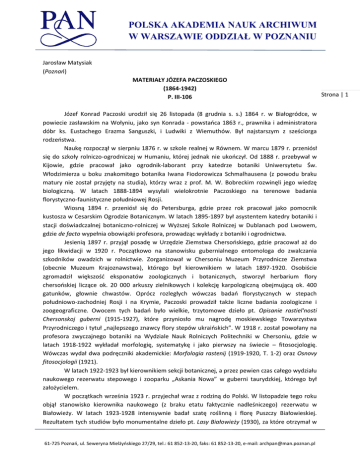 POLSKA AKADEMIA NAUK ARCHIWUM W WARSZAWIE ODDZIAŁ W POZNANIU Jarosław Matysiak (Poznań) MATERIAŁY JÓZEFA PACZOSKIEGO (1864-1942) P. III-106 Józef Konrad Paczoski urodził się 26 listopada (8 grudnia s. s.) 1864 r. w Białogródce, w powiecie zasławskim na Wołyniu, jako syn Konrada - powstańca 1863 r., prawnika i administratora dóbr ks. Eustachego Erazma Sanguszki, i Ludwiki z Wiemuthów. Był najstarszym z sześciorga rodzeństwa. Naukę rozpoczął w sierpniu 1876 r. w szkole realnej w Równem. W marcu 1879 r. przeniósł się do szkoły rolniczo-ogrodniczej w Humaniu, której jednak nie ukończył. Od 1888 r. przebywał w Kijowie, gdzie pracował jako ogrodnik-laborant przy katedrze botaniki Uniwersytetu Św. Włodzimierza u boku znakomitego botanika Iwana Fiodorowicza Schmalhausena (z powodu braku matury nie został przyjęty na studia), którzy wraz z prof. M. W. Bobreckim rozwinęli jego wiedzę biologiczną. W latach 1888-1894 wysyłali wielokrotnie Paczoskiego na terenowe badania florystyczno-faunistyczne południowej Rosji. Wiosną 1894 r. przeniósł się do Petersburga, gdzie przez rok pracował jako pomocnik kustosza w Cesarskim Ogrodzie Botanicznym. W latach 1895-1897 był asystentem katedry botaniki i stacji doświadczalnej botaniczno-rolniczej w Wyższej Szkole Rolniczej w Dublanach pod Lwowem, gdzie de facto wypełnia obowiązki profesora, prowadząc wykłady z botaniki i ogrodnictwa. Jesienią 1897 r. przyjął posadę w Urzędzie Ziemstwa Chersońskiego, gdzie pracował aż do jego likwidacji w 1920 r. Początkowo na stanowisku gubernialnego entomologa do zwalczania szkodników owadzich w rolnictwie. Zorganizował w Chersoniu Muzeum Przyrodnicze Ziemstwa (obecnie Muzeum Krajoznawstwa), którego był kierownikiem w latach 1897-1920. Osobiście zgromadził większość eksponatów zoologicznych i botanicznych, stworzył herbarium flory chersońskiej liczące ok. 20 000 arkuszy zielnikowych i kolekcję karpologiczną obejmującą ok. 400 gatunków, głownie chwastów. Oprócz rozległych wówczas badań florystycznych w stepach południowo-zachodniej Rosji i na Krymie, Paczoski prowadził także liczne badania zoologiczne i zoogeograficzne. Owocem tych badań było wielkie, trzytomowe dzieło pt. Opisanie rastiel'nosti Chersonskoj guberni (1915-1927), które przyniosło mu nagrodę moskiewskiego Towarzystwa Przyrodniczego i tytuł „najlepszego znawcy flory stepów ukraińskich”. W 1918 r. został powołany na profesora zwyczajnego botaniki na Wydziale Nauk Rolniczych Politechniki w Chersoniu, gdzie w latach 1918-1922 wykładał morfologię, systematykę i jako pierwszy na świecie – fitosocjologię. Wówczas wydał dwa podręczniki akademickie: Morfologia rastenij (1919-1920, T. 1-2) oraz Osnovy fitosocjologii (1921). W latach 1922-1923 był kierownikiem sekcji botanicznej, a przez pewien czas całego wydziału naukowego rezerwatu stepowego i zooparku „Askania Nowa” w guberni taurydzkiej, którego był założycielem. W początkach września 1923 r. przyjechał wraz z rodziną do Polski. W listopadzie tego roku objął stanowisko kierownika naukowego (z braku etatu faktycznie nadleśniczego) rezerwatu w Białowieży. W latach 1923-1928 intensywnie badał szatę roślinną i florę Puszczy Białowieskiej. Rezultatem tych studiów było monumentalne dzieło pt. Lasy Białowieży (1930), za które otrzymał w 61-725 Poznań, ul. Seweryna Mielżyńskiego 27/29, tel.: 61 852-13-20, faks: 61 852-13-20, e-mail: [email protected] Strona | 1 POLSKA AKADEMIA NAUK ARCHIWUM W WARSZAWIE ODDZIAŁ W POZNANIU 1935 r. nagrodę Kasy im. Mianowskiego. W Białowieży stworzył również zaczątek Muzeum Puszczy, którym przez pewien czas kierował. W marcu 1925 r. został powołany na Katedrę Systematyki i Geografii Roślin Wydziału Matematyczno-Przyrodniczego Uniwersytetu Poznańskiego (UP) jako profesor zwyczajny oraz na kierownika Zakładu Systematyki i Geografii Roślin działającego w ramach tejże Katedry. Na Uniwersytecie kierował także, w latach 1928-1931, Zakładem Botaniki Systematycznej oraz był Strona | 2 konsultantem naukowym Ogrodu Botanicznego w Poznaniu. W lipcu 1931 r. Ministerstwo Wyznań Religijnych i Oświecenia Publicznego za podpisanie tzw. protestu brzeskiego przeniosło Paczoskiego w stan spoczynku (korzystając z przekroczenia przez niego granicy wieku - miał wtedy 66 lat), a sama Katedra została zlikwidowana. Jednak dzięki staraniom m. in. prof. Adama Wodziczki został powołany na stanowisko adiunkta w Zakładzie Botaniki Ogólnej, gdzie powierzono mu wykłady zlecone i ćwiczenia z systematyki i geografii roślin, które prowadził aż do przejścia na emeryturę w 1938 r. Po zamknięciu Katedry kupił w 1932 r. gospodarstwo rolne w Sierosławiu koło Poznania, przekształcił je w placówkę sadowniczą, w której prowadził obserwację nad ekologią drzew owocowych i szkodami mrozowymi. Po wybuchu II wojny światowej, hitlerowcy wywłaszczyli Paczoskiego i przyłączyli sad jako placówkę doświadczalną do niemieckiego uniwersytetu w Poznaniu, nakazując mu dalsze prowadzenie obserwacji szkód mrozowych. Józef Paczoski autorem przeszło 300 prac z dziedziny botaniki, zoologii, ochrony roślin oraz zagadnień uwzględniających szersze środowisko przyrodnicze z wkraczaniem w geologię, klimatologię i agrotechnikę. Był twórcą nowej gałęzi nauki – fitosocjologii. W pracy wydanej w 1896 r. w języku polskim pt. Życie gromadne roślin po raz pierwszy użył terminu „fitosocjologia” na określenie nowej nauki. Również jako pierwszy na świecie rozpoczął wykłady z nowej dziedziny nauki i wydał pierwszy podręcznik fitosocjologii (1921). Był jednym z najlepszych znawców flory płd.-wsch. Europy. Wysunął teorię pantopizmu (Wstęp do filogenii 1929). Zajmował się też kompleksami leśnymi w Polsce, m. in. Puszczą Białowieską. Owocem tych badań była wspomniana już wyżej praca Lasy Białowieży (1930). Jako z