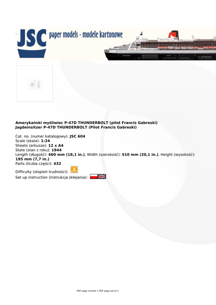 Amerykański myśliwiec P-47D THUNDERBOLT (pilot Francis Gabreski) Jagdeinsitzer P-47D THUNDERBOLT (Pilot Francis Gabreski) Cat. no. (numer katalogowy): JSC 604 Scale (skala): 1:24 Sheets (arkusze): 12 x A4 State (stan z roku): 1944 Length (długość): 460 mm (18,1 in.), Width (szerokość): 510 mm (20,1 in.), Height (wysokość): 195 mm (7,7 in.) Parts (liczba części): 432 Difficulty (stopień trudności): Set up instruction (instrukcja sklejania): PDF page number 1 PDF page out of 1
