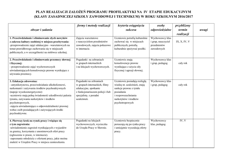 PLAN REALIZACJI ZAŁOŻEŃ PROGRAMU PROFILAKTYKI NA IV ETAPIE EDUKACYJNYM (KLASY ZASADNICZEJ SZKOŁY ZAWODOWEJ I TECHNIKUM) W ROKU SZKOLNYM 2016/2017 formy i metody realizacji obszar i zadania kryteria osiągnięcia sukcesu osoby odpowiedzialne przybliżony termin realizacji 1. Przeciwdziałanie i eliminowanie złych nawyków z zakresu kultury osobistej w miejscu przebywania: -przeprowadzenie zajęć edukacyjno –warsztatowych na temat prawidłowego zachowania się w miejscach publicznych, a w szczególności na stołówce szkolnej. Zajęcia warsztatowe z nauczycielem przedmiotów zawodowych, zajęcia pokazowe w internacie. Uczniowie potrafią kulturalnie zachować się w miejscach publicznych; potrafią kulturalnie spożywać posiłki. Wychowawcy klas i grup, nauczyciel przedmiotów zawodowych 2. Przeciwdziałanie i eliminowanie przemocy słownej i fizycznej: - przeprowadzenie zajęć wychowawczych uświadamiających konsekwencje prawne wynikające z używania przemocy. Pogadanki na zebraniach w grupach internackich i na lekcjach wychowawczych. Uczniowie znają konsekwencje prawne wynikające z użycia siły fizycznej i agresji słownej. Wychowawcy klas i grup, pedagog cały rok 3. Edukacja zdrowotna: - antynikotynowa, przeciwdziałanie alkoholizmowi, narkomanii i zażywaniu środków psychoaktywnych (napoje wysokoenergetyczne): -uczniowie mają pełną świadomość szkodliwości palenia tytoniu, zażywania narkotyków i środków psychotropowych, -zajęcia uświadamiające o odpowiedzialności prawnej wobec osób posiadających i zażywających środki psychoaktywne. Pogadanki na zebraniach w grupach internackich, filmy edukacyjne, spotkanie z funkcjonariuszem policji i/lub specjalistą z poradni uzależnień. Uczniowie posiadają rozległą wiedzę nt. uzależnień, znają sankcje prawne z tytułu posiadania i rozpowszechniania narkotyków i środków psychotropowych Wychowawcy klas i grup, pedagog cały rok 4. Pierwszy krok na rynek pracy i wiążące się z tym zagrożenia: -uświadomienie zagrożeń wynikających z wyjazdów za granicę, korzystania z anonimowych ofert pracy (ogłoszenia w prasie, w internecie). -zapoznanie młodzieży z ofertami pracy, jakie można znaleźć w Urzędzie Pracy w miejscu zamieszkania. Pogadanki na lekcjach wychowawczych, wycieczka do Urzędu Pracy w Sławnie. Uczniowie bezpiecznie poruszają się po rynku pracy i umiejętnie wyszukują oferty pracy. Wychowawcy klas, pedagog IX, X, IV, V IV, V uwagi 5. Bezpieczne wkraczanie w dorosłość: -zapoznanie wychowanków z aspektami życia seksualnego i metodami zapobiegania ciąży. Pogadanki na lekcjach wychowawczych, filmy edukacyjne, Uczniowie znają zagrożenia wynikające z decyzji podjęcia współżycia seksualnego. Wychowankowie znają metody zapobiegania ciąży. 6. Aktywne formy spędzania czasu: -ukazywanie pozytywnego wpływu ruchu i aktywności fizycznej dla zdrowia człowieka, -uświadomienie młodzieży, że ruch jest sposobem na dobre samopoczucie. Pogadanki na lekcjach wychowawczych, udział w szkolnych i pozaszkolnych zajęciach sportowych. Uczniowie rozwijają swoją sprawność fizyczną, umieją planować swój wolny czas. 7. Profilaktyka prozdrowotna, choroby cywilizacyjne a w tym: cukrzyca, otyłość, anoreksja, bulimia: -uświadomienie młodzieży jakie zagrożenia związane są złym stylem życia i niezdrowym odżywianiem. Pogadanki na lekcjach wychowawczych, filmy edukacyjne, zajęcia pozalekcyjne – warsztaty Akademia Zdrowego Żywienia Uczniowie kształtują zdrowe nawyki żywieniowe i promują zdrowy styl życia. Wychowawcy klas i grup, nauczyciel przedmiotów zawodowych, 8. Rozpoznanie środowiska rodzinnego ucznia, wychowanka oraz ujednolicenie oddziaływań wychowawczych na linii dom –szkoła. Dogłębne rozpoznanie najbliższego środowiska ucznia, domu rodzinnego. Prowadzenie zeszytów kontaktowych, rozmowy telefoniczne z rodzicami, zebrania i spotkania indywidualne z rodzicami, wizyty w domach rodzinnych. Wychowawcy klas, grup i pedagog znają środowisko rodzinne ucznia. Wychowawcy klas i grup, pedagog Wychowawcy klas i grup, psycholog, nauczyciel wychowania do życia w rodzinie Wychowawcy klas i grup, nauczyciel wychowania fizycznego, cały rok cały rok cały rok cały rok wg potrzeb