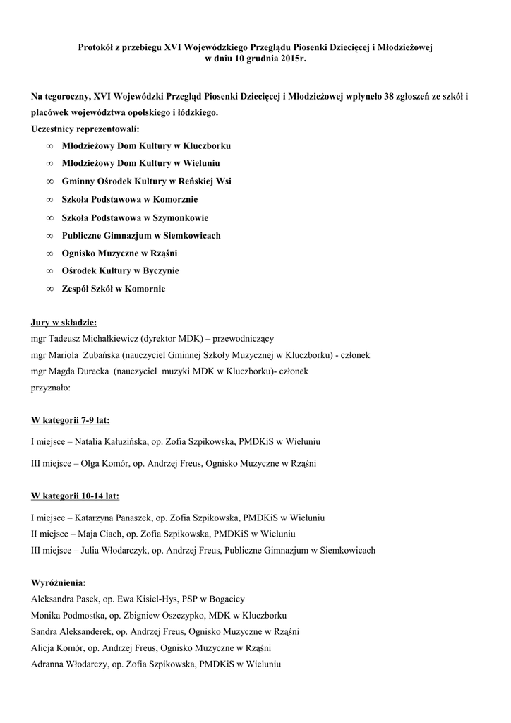 Protokół z przebiegu XVI Wojewódzkiego Przeglądu Piosenki Dziecięcej i Młodzieżowej w dniu 10 grudnia 2015r. Na tegoroczny, XVI Wojewódzki Przegląd Piosenki Dziecięcej i Młodzieżowej wpłyneło 38 zgłoszeń ze szkół i placówek województwa opolskiego i łódzkiego. Uczestnicy reprezentowali: • Młodzieżowy Dom Kultury w Kluczborku • Młodzieżowy Dom Kultury w Wieluniu • Gminny Ośrodek Kultury w Reńskiej Wsi • Szkoła Podstawowa w Komorznie • Szkoła Podstawowa w Szymonkowie • Publiczne Gimnazjum w Siemkowicach • Ognisko Muzyczne w Rząśni • Ośrodek Kultury w Byczynie • Zespół Szkół w Komornie Jury w składzie: mgr Tadeusz Michałkiewicz (dyrektor MDK) – przewodniczący mgr Mariola Zubańska (nauczyciel Gminnej Szkoły Muzycznej w Kluczborku) - członek mgr Magda Durecka (nauczyciel muzyki MDK w Kluczborku)- członek przyznało: W kategorii 7-9 lat: I miejsce – Natalia Kałuzińska, op. Zofia Szpikowska, PMDKiS w Wieluniu III miejsce – Olga Komór, op. Andrzej Freus, Ognisko Muzyczne w Rząśni W kategorii 10-14 lat: I miejsce – Katarzyna Panaszek, op. Zofia Szpikowska, PMDKiS w Wieluniu II miejsce – Maja Ciach, op. Zofia Szpikowska, PMDKiS w Wieluniu III miejsce – Julia Włodarczyk, op. Andrzej Freus, Publiczne Gimnazjum w Siemkowicach Wyróżnienia: Aleksandra Pasek, op. Ewa Kisiel-Hys, PSP w Bogacicy Monika Podmostka, op. Zbigniew Oszczypko, MDK w Kluczborku Sandra Aleksanderek, op. Andrzej Freus, Ognisko Muzyczne w Rząśni Alicja Komór, op. Andrzej Freus, Ognisko Muzyczne w Rząśni Adranna Włodarczy, op. Zofia Szpikowska, PMDKiS w Wieluniu W kategorii 15-18 lat: I miejsce – Domika Łagocka, op. Zbigniew Oszczypko, MDK w Kluczborku II miejsce – Kinga Adamska, op. Krzysztof Kulik, OK w Byczynie Wyróżnienia: Wiktoria Piekarczyk, op. Krzysztof Kulik, OK w Byczynie Jakub Wawrzyniak, op. Zofia Szpikowska, PMDKiS w Wieluniu Magdalena Pawlik, op. Krzysztof Kulik, OK w Byczynie Podpisy Jury: 1. .................................. 2. .................................. 3. ..................................