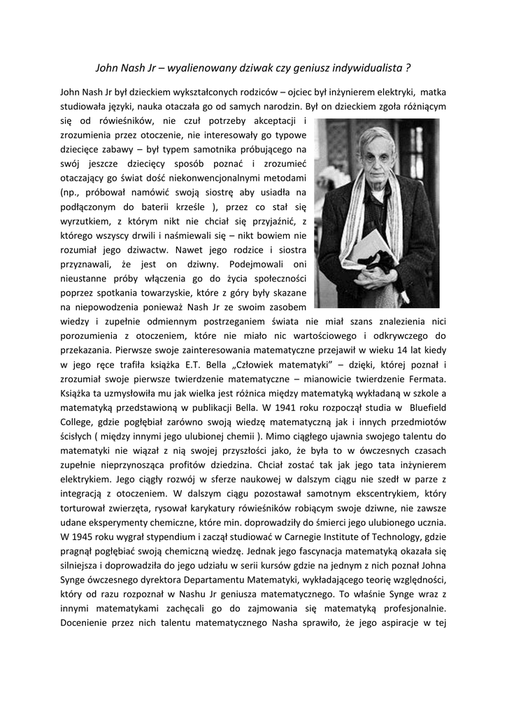 John Nash Jr – wyalienowany dziwak czy geniusz indywidualista ? John Nash Jr był dzieckiem wykształconych rodziców – ojciec był inżynierem elektryki, matka studiowała języki, nauka otaczała go od samych narodzin. Był on dzieckiem zgoła różniącym się od rówieśników, nie czuł potrzeby akceptacji i zrozumienia przez otoczenie, nie interesowały go typowe dziecięce zabawy – był typem samotnika próbującego na swój jeszcze dziecięcy sposób poznać i zrozumieć otaczający go świat dość niekonwencjonalnymi metodami (np., próbował namówić swoją siostrę aby usiadła na podłączonym do baterii krześle ), przez co stał się wyrzutkiem, z którym nikt nie chciał się przyjaźnić, z którego wszyscy drwili i naśmiewali się – nikt bowiem nie rozumiał jego dziwactw. Nawet jego rodzice i siostra przyznawali, że jest on dziwny. Podejmowali oni nieustanne próby włączenia go do życia społeczności poprzez spotkania towarzyskie, które z góry były skazane na niepowodzenia ponieważ Nash Jr ze swoim zasobem wiedzy i zupełnie odmiennym postrzeganiem świata nie miał szans znalezienia nici porozumienia z otoczeniem, które nie miało nic wartościowego i odkrywczego do przekazania. Pierwsze swoje zainteresowania matematyczne przejawił w wieku 14 lat kiedy w jego ręce trafiła książka E.T. Bella „Człowiek matematyki” – dzięki, której poznał i zrozumiał swoje pierwsze twierdzenie matematyczne – mianowicie twierdzenie Fermata. Książka ta uzmysłowiła mu jak wielka jest różnica między matematyką wykładaną w szkole a matematyką przedstawioną w publikacji Bella. W 1941 roku rozpoczął studia w Bluefield College, gdzie pogłębiał zarówno swoją wiedzę matematyczną jak i innych przedmiotów ścisłych ( między innymi jego ulubionej chemii ). Mimo ciągłego ujawnia swojego talentu do matematyki nie wiązał z nią swojej przyszłości jako, że była to w ówczesnych czasach zupełnie nieprzynosząca profitów dziedzina. Chciał zostać tak jak jego tata inżynierem elektrykiem. Jego ciągły rozwój w sferze naukowej w dalszym ciągu nie szedł w parze z integracją z otoczeniem. W dalszym ciągu pozostawał samotnym ekscentrykiem, który torturował zwierzęta, rysował karykatury rówieśników robiącym swoje dziwne, nie zawsze udane eksperymenty chemiczne, które min. doprowadziły do śmierci jego ulubionego ucznia. W 1945 roku wygrał stypendium i zaczął studiować w Carnegie Institute of Technology, gdzie pragnął pogłębiać swoją chemiczną wiedzę. Jednak jego fascynacja matematyką okazała się silniejsza i doprowadziła do jego udziału w serii kursów gdzie na jednym z nich poznał Johna Synge ówczesnego dyrektora Departamentu Matematyki, wykładającego teorię względności, który od razu rozpoznał w Nashu Jr geniusza matematycznego. To właśnie Synge wraz z innymi matematykami zachęcali go do zajmowania się matematyką profesjonalnie. Docenienie przez nich talentu matematycznego Nasha sprawiło, że jego aspiracje w tej dziedzinie szybko wzrosły w związku z czym porażka w konkursie Williama Lowella Putnama była dla niego rzeczą niezrozumiałą i nie do przyjęcia. Podczas, gdy profesorowie widzieli w nim geniusz to pozostali studenci mieli go za osobą niezdarną i opóźnioną. Pomimo wyśmiewania go przez rówieśników był silny psychicznie co zaowocowało otrzymaniem BA i MA w matematyce w 1948r. Kolejnym dowodem jego wysokiej inteligencji było przyjęcie go na kierunek matematyki w Harwardzie, Princeton, Chicago i Mishigan. Odrzucił Harward na korzyść Princeton ze względu na lepsze warunki jakie mu zaproponowano. Podczas tych studiów jego zainteresowania zmierzyły w kierunku topologii, geometrii algebraicznej, teorii gier i logiki. Przygotowując się do swojego doktoratu w 1949 r. napisał pracę, która 45 lat później przyniosła mu nagrodę Nobla w dziedzinie ekonomii tworząc matematyczne podstawy teorii gier. W 1950 roku obronił doktorat pracą pt.: „Niekooperatywne gry” oraz rozpoczął pracę jako konsultant w RAND Corporation gdzie teorię gier zastosowano do zimnej wojny . Nash wiedział, że musi się pokazać w innych dziedzinach ponieważ jego dotychczasowe publikacje wydawały się nieistotne. Miał jednak problemy w środowisku czystych matematyków, którzy uznali go za zbyt chaotycznego. Efektem tego były trudności w wydawaniu jego prac. W 1952 r. Nash opublikował "Złożoność prawdziwej algebry" w "Kronikach matematyki". Kwintesencją tej pracy jest to, że dwie prawdziwe algebraiczne złożoności są ekwiwalentne tylko wtedy, gdy są homomorficzne. Praca ta została doceniona w środowisku akademickim ale nie zmieniła stosunku innych matematyków, którym przeszkadzało jego agresywne i dziecinne zachowanie. Od 1952 roku Nash uczył w Massachussets Institute of Technology, ale jego sposób nauczania był niezwykły (i niepopularny wśród studentów), a jego metody egzaminowania niekonwencjonalne. Jego ciągłe badania nad geometrią Reinmanna przyniosły efekt w postaci publikacji w 1954 roku, w której poruszał problem przestrzeni Euklidesowych, metryk, złożoności Reinmanna i innych oraz publikacji w 1956 roku, która zawierała jego słynną teorię głębokiego zamieszania funkcji. Jego znakomite wyniki stały się przyczyną kłótni o Medal Fieldsa w 1958 roku, ponieważ komitet przyznający nagrodę uznał, iż skoro została opublikowana tylko część jego prac to reszta nie istnieje mimo zapewnień autora. Sądzono, że matematyk dostanie powyższą nagrodę w 1962 roku ale nim to nastąpiło jego karierę przekreśliło załamanie nerwowe spowodowane trudnością w komunikacji z otoczeniem. Mimo jego trudnego charakteru i problemami z kontaktami międzyludzkimi Nash poznaje Eleanor Stier – nieśmiałą dziewczynę bojącą się mężczyzn, zakochuje się w niej a owocem ich nieformalnego związku jest ich syn John Dawid Stier. W p