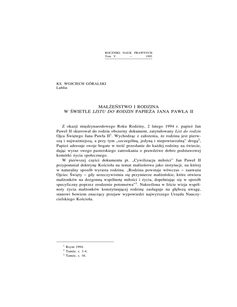 ROCZNIKI NAUK PRAWNYCH Tom V − 1995 KS. WOJCIECH GÓRALSKI Lublin MAŁŻEŃSTWO I RODZINA W ŚWIETLE LISTU DO RODZIN PAPIEŻA JANA PAWŁA II Z okazji mie˛dzynarodowego Roku Rodziny, 2 lutego 1994 r. papież Jan Paweł II skierował do rodzin obszerny dokument, zatytułowany List do rodzin Ojca Świe˛tego Jana Pawła II1. Wychodzac ˛ z założenia, że rodzina jest pierwsza˛ i najważniejsza, ˛ a przy tym „szczególna, ˛ jedyna˛ i niepowtarzalna” ˛ droga˛2, Papież adresuje swoje bogate w treść przesłanie do każdej rodziny na świecie, dajac ˛ wyraz swego pasterskiego zatroskania o prawdziwe dobro podstawowej komórki życia społecznego. W pierwszej cze˛ści dokumentu pt. „Cywilizacja miłości” Jan Paweł II przypomniał doktryne˛ Kościoła na temat małżeństwa jako instytucji, na której w naturalny sposób wyrasta rodzina. „Rodzina powstaje wówczas − zauważa Ojciec Świe˛ty − gdy urzeczywistnia sie˛ przymierze małżeńskie, które otwiera małżonków na dozgonna˛ wspólnote˛ miłości i życia, dopełniajac ˛ sie˛ w sposób specyficzny poprzez zrodzenie potomstwa”3. Nakreślona w liście wizja wspólnoty życia małżonków konstytuujacej ˛ rodzine˛ zasługuje na głe˛bsza˛ uwage˛, stanowi bowiem znaczacy ˛ przejaw wypowiedzi najwyższego Urze˛du Nauczycielskiego Kościoła. 1 2 3 Rzym 1994. Tamże, s. 3-4. Tamże, s. 16. 50 KS. WOJCIECH GÓRALSKI I. WSPÓLNOTA MAŁŻEŃSKA FUNDAMENTEM RODZINY Nawiazuj ˛ ac ˛ do nauki Soboru Watykańskiego II4, Ojciec Świe˛ty przypomina, że rodzina bierze poczatek ˛ ze wspólnoty małżeńskiej − przymierza, w którym me˛żczyzna i kobieta wzajemnie sie˛ sobie oddaja˛ i przyjmuja. ˛ Komunia małżonków − odzwierciedlajaca ˛ ich relacje mie˛dzyosobowe − daje poczatek ˛ wspólnocie, jaka˛ jest właśnie rodzina. Cała wspólnota rodzinna jest dogłe˛bnie przeniknie˛ta tym, co stanowi sama˛ istote˛ komunii małżonków. Ich „komunijna” jedność znajduje swoje dopełnienie wraz z zaistnieniem potomstwa, które powinno umocnić przymierze małżeńskie i ubogacić komunie˛ rodziców. Rodzicielstwo samo w sobie stanowi potwierdzenie miłości, pozwalajac ˛ odkrywać jej pierwotna˛ głe˛bie˛. Małżeństwo sakramentalne, które jest przymierzem osób w miłości, powinno być ugruntowane i chronione przez miłość Boża. ˛ Zwrócenie sie˛ do niej wymaga modlitwy, która w Roku Rodziny powinna − zdaniem Papieża − skupić sie˛ „na tym właśnie punkcie krytycznym i decydujacym, ˛ jaki stwarza przejście od małżeńskiej miłości do rodzenia i rodzicielstwa”5. II. JEDNOŚĆ MAŁŻONKÓW I GENEALOGIA OSOBY LUDZKIEJ Rozważajac ˛ sprawe˛ jedności małżonków Ojciec Świe˛ty podkreśla najpierw znaczenie świadomego i wolnego wyboru, który daje poczatek ˛ przymierzu małżeńskiemu. Wszak osoba ludzka jest istota˛ rozumna˛ i wolna, ˛ w czym konstytucja Soboru Watykańskiego II Gaudium et spes dostrzega jej podobieństwo do Boga6. Zdolność me˛żczyzny i kobiety do życia w prawdzie i miłości, odzwierciedlajaca ˛ osobowa˛ konstytucje˛ człowieka, pozwala im łaczyć ˛ sie˛ w małżeństwie w „jedno ciało”. Stanowi to o dojrzałości właściwej osobom ludzkim, stworzonym na obraz i podobieństwo Boga. Jedność małżonków trwa w dzieciach; jedność bowiem nie „zamyka” małżonków i nie jest dla nich samych: „jest otwarta w kierunku nowego życia i nowej osoby”7. Przekazywanie przez rodziców życia oznacza życiodajne współdziałanie ze Stwórca, ˛ co stanowi przyczynianie sie˛ do przekazywania obrazu i podobieństwa Boga. 4 Por. Konstytucja duszpasterska o Kościele w świecie współczesnym „Gaudium et spes”, nr 48 (dalej cyt. KDK). 5 List do rodzin, s. 17. 6 KDK 24. 7 List do rodzin, s. 17. MAŁŻEŃSTWO I RODZINA A LIST DO RODZIN 51 Mówiac ˛ z kolei o genealogii osoby, Papież przypomina, że z rodzina˛ wiaże ˛ sie˛ genealogia każdego człowieka. Przychodzac ˛ na świat, człowiek przynosi ze soba˛ szczególny obraz i podobieństwo Boga. Można wie˛c powiedzieć, że w ludzkim rodzicielstwie jest obecny sam Bóg. Sprawia On, że genealogia osoby ludzkiej ma swój wymiar wieczny, który ostatecznie odsłonił Chrystus „rzucajac ˛ światło Ewangelii na ludzkie życie i umieranie, a przez to również − na znaczenie ludzkiej rodziny”8. W genealogii osoby ludzkiej doniosłe jest to, że głe˛boko jest w nia˛ wpisany Bóg i jego wola. Wola Boża sprawia, że człowiek jest dany sobie samemu, a zarazem rodzinie i społeczeństwu; równocześnie „Bóg zadaje tego człowieka rodzinie i społeczeństwu”9. Zatrzymujac ˛ sie˛ nad ostatecznym przeznaczeniem człowieka, Jan Paweł II stawia kluczowe pytanie: czy nie sprzeciwia sie˛ ono stwierdzeniu, które padło wcześniej, iż Bóg chce człowieka dla niego samego? Odwołujac ˛ sie˛ do słynnego zdania św. Augustyna: „niespokojne jest serce nasze, dopóki nie spocznie w Tobie”, Papież zauważa, iż pomie˛dzy jedna˛ a druga˛ forma˛ życia nie ma przeciwieństwa, lecz zachodzi głe˛ boka spójność. III. RODZINA A DOBRO WSPÓLNE Przechodzac ˛ do omawiania dobra wspólnego i rodziny Ojciec Świe˛ty podkreśla role˛ i znaczenie słów przysie˛gi małżeńskiej, która wskazuje na dobro wspólne małżonków: miłość, wierność i uczciwość małżeńska, ˛ a także na dozgonność zwiazku ˛ małżeńskiego. To dobro jest nim równocześnie dla obojga, a nadto ma stać sie˛ dobrem ich dzieci. Ślubujac ˛ je sobie wzajemnie, małżonkowie staja˛ sie˛ szafarzami sakramentu małżeństwa w Kościele. Słowa przysie˛gi małżeńskiej wskazuja˛ nie tylko na dobro wspólne małżonków, lecz także na dobro wspólne przyszłej rodziny. Wyrazem tego jest m.in. pytanie o gotowość przyje˛cia i chrześcijańskiego wychowania dzieci, kierowane do zawierajacych ˛ małżeństwo. Pytanie to pozostaje w ścisłej relacji ze ślubowaniem