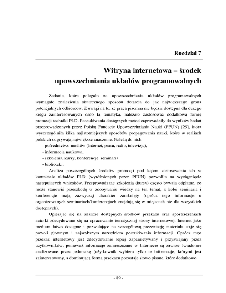 Rozdział 7 Witryna internetowa – środek upowszechniania układów programowalnych Zadanie, które polegało na upowszechnieniu układów programowalnych wymagało znalezienia skutecznego sposobu dotarcia do jak największego grona potencjalnych odbiorców. Z uwagi na to, Ŝe praca pisemna nie będzie dostępna dla duŜego kręgu zainteresowanych osób tą tematyką, naleŜało zastosować dodatkową formę promocji techniki PLD. Poszukiwania dostępnych metod zaprowadziły do wyników badań przeprowadzonych przez Polską Fundację Upowszechniania Nauki (PFUN) [29], która wyszczególniła kilka najistotniejszych sposobów propagowania nauki, które w realiach polskich odgrywają największe znaczenie. NaleŜą do nich: - pośrednictwo mediów (Internet, prasa, radio, telewizja), - informacja naukowa, - szkolenia, kursy, konferencje, seminaria, - biblioteki. Analiza poszczególnych środków promocji pod kątem zastosowania ich w kontekście układów PLD (wyróŜnionych przez PFUN) pozwoliła na wyciągnięcie następujących wniosków. Przeprowadzane szkolenia (kursy) często bywają odpłatne, co moŜe stanowić przeszkodę w zdobywaniu wiedzy na ten temat, z kolei seminaria i konferencje mają zazwyczaj charakter zamknięty (oprócz tego informacje o organizowanych seminariach/konferencjach znajdują się w miejscach nie dla wszystkich dostępnych). Opierając się na analizie dostępnych środków przekazu oraz spostrzeŜeniach autorki zdecydowano się na opracowanie tematycznej strony internetowej. Internet jako medium łatwo dostępne i pozwalające na szczegółową prezentację materiału staje się powoli głównym i najszybszym narzędziem poszukiwania informacji. Oprócz tego przekaz internetowy jest zdecydowanie lepiej zapamiętywany i przyswajany przez uŜytkowników, poniewaŜ informacje zamieszczane w Internecie są zawsze świadomie analizowane przez jednostkę (uŜytkownik wybiera tylko te informacje, którymi jest zainteresowany, a dominującą formą przekazu pozostaje słowo pisane, które dodatkowo - 89 - Rozdział 7 Witryna internetowa – środek upowszechniania… skłania do pełnego zaangaŜowania uŜytkownika). Jest to dodatkowy powód, dla którego zdecydowano się na ten rodzaj promowania układów PLD. 7.1. Projektowanie strony internetowej W początkowej fazie tworzenia strony skorzystano z porad zawartych w ksiąŜce J. Cohen [19]. Cohen wyróŜniła w niej następujące punkty, które naleŜy uwzględnić przy projektowaniu strony. Są to: nazwa, misja i cele, docelowi odbiorcy, prognoza ruchu, sposób zarabiania, zestaw funkcji, plan marketingu, zespół, terminarz i budŜet, załoŜenia. Według wspomnianej Autorki są to niezmiernie waŜne elementy, poniewaŜ w duŜej mierze przyczyniają się do tego czy strona odniesie sukces. Ze względu na to, Ŝe stworzona witryna nie ma charakteru zarobkowego, a jedynie rozpowszechniający jedną z dziedzin nauki, w dalszym opisie zrezygnowano z takich punktów jak: prognoza ruchu, sposób zarabiania, plan marketingu, terminarz i budŜet. Nazwa W wyborze nazwy tematycznej strony internetowej kierowano się przede wszystkim prostotą i intuicją. Jednym z załoŜeń była równieŜ długość nazwy. Mając na uwadze jej lepsze zapamiętanie nazwa miała być stosunkowo krótka. Na nazwę witryny składają się dwa człony. Pierwszy z nich to „PLD” – skrót od angielskiej nazwy programowalnych układów cyfrowych (Programmable Logic Devices). Sugestią twórców oprogramowania MediaWiki jest, aby strony internetowe, które wykorzystują ich oprogramowanie (tak jest w tym przypadku) miały w głównej nazwie strony człon: „wiki”. Ostatecznie tematyczna strona przyjęła ostatecznie nazwę: ‘PLD wiki” i znajduje się pod adresem: pld.zpt.tele.pw.edu.pl Misja i cele Misją strony jest propagowanie idei techniki PLD. Cel ten zamierzano osiągnąć poprzez zrealizowanie następujących punktów: - stworzenie vademecum podstawowej wiedzy z zakresu techniki PLD, - umoŜliwienie wymiany myśli dzięki funkcjonującemu forum dyskusyjnemu, - informowanie o nowościach w świecie układów PLD i zbliŜających się waŜnych wydarzeniach (np. seminariach, konferencjach), - stworzenie przewodnika po ciekawych materiałach w Internecie oraz nowych pozycjach w literaturze; - umoŜliwienie publikacji ciekawych projektów (promowanie pracy studentów). Docelowi odbiorcy Powstanie witryny internetowej jest najprostszym sposobem, a zarazem najbardziej skutecznym by upowszechnić technikę PLD szerokiemu gronu odbiorców. Odbiorcą - 90 - Rozdział 7 Witryna internetowa – środek upowszechniania… strony jest w zasadzie kaŜda osoba zainteresowana najnowocześniejszą elektroniką cyfrową, która dostrzega znaczenie układów programowalnych, ma wiedzę i chcę je pogłębić bądź jest w tej materii początkująca. Z myślą o takich osobach powstał przewodnik po stronie. Zestaw funkcji We wstępnym etapie przygotowań witryny internetowej naleŜało przygotować zestaw funkcji, który nie tylko usprawni korzystanie ze strony, ale takŜe wspomoŜe cel, jakim było rozpowszechnianie techniki PLD. Działająca obecnie strona (stan na 09/2007) zawiera następujące funkcje: Działy (Kategorie artykułów). Na stronie znajduje się wykaz działów, do których przynaleŜą wszystkie artykuły (i definicje). Funkcja ta pozwala na szybkie zapoznanie się ze strukturą i tematyką strony. Jest to równieŜ pomocne, biorąc pod uwagę perspektywę rozwoju strony. Taki system pozwala w prosty sposób łączyć pokrewne definicje ze sobą, a takŜe dodawać nowe artykuły w ramach danego działu zachowując przy tym porządek i wcześniej zaprojektowaną strukturę. Wyszukiwarka. Wraz ze wzrostem liczby artykułów i definicji na stronie, wyszukiwanie haseł będzie stanowiło niezastąpiony element przyjaznej strony tematycznej. Forum dyskusyjne. Jest to jedna z najwaŜniejszych funkcji strony. Dyskusja na temat uk