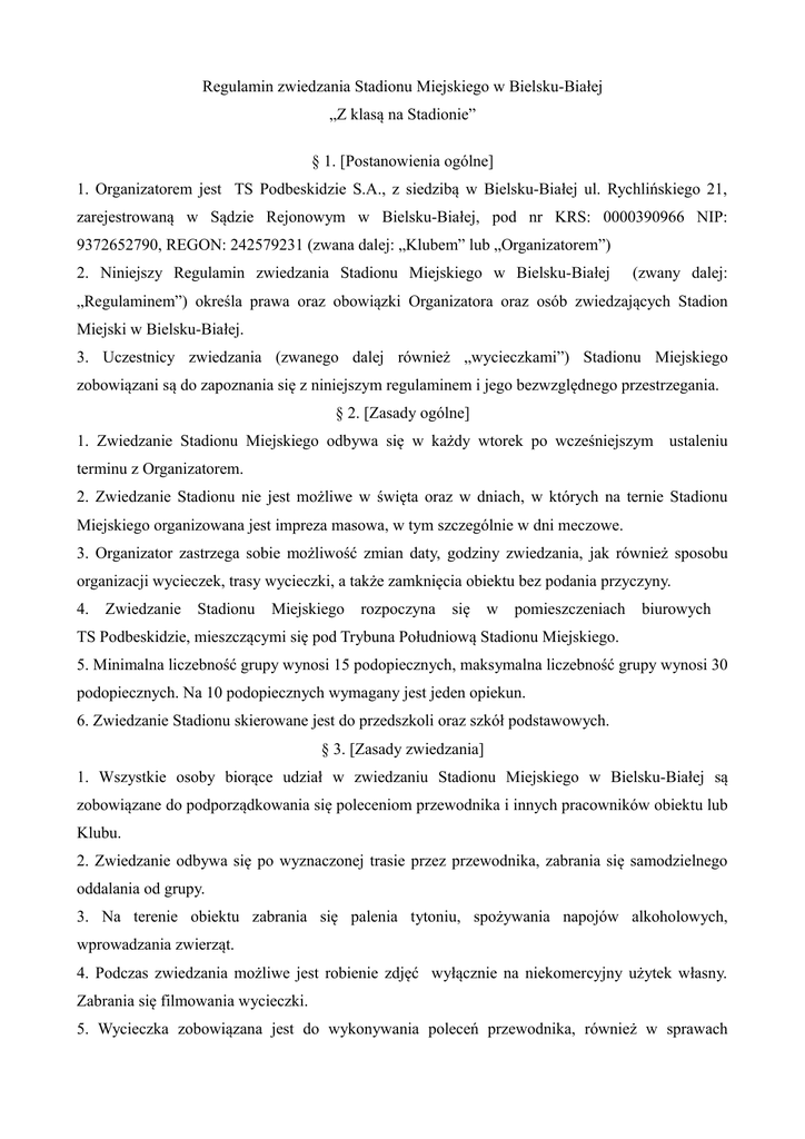 Regulamin zwiedzania Stadionu Miejskiego w Bielsku-Białej „Z klasą na Stadionie” § 1. [Postanowienia ogólne] 1. Organizatorem jest TS Podbeskidzie S.A., z siedzibą w Bielsku-Białej ul. Rychlińskiego 21, zarejestrowaną w Sądzie Rejonowym w Bielsku-Białej, pod nr KRS: 0000390966 NIP: 9372652790, REGON: 242579231 (zwana dalej: „Klubem” lub „Organizatorem”) 2. Niniejszy Regulamin zwiedzania Stadionu Miejskiego w Bielsku-Białej (zwany dalej: „Regulaminem”) określa prawa oraz obowiązki Organizatora oraz osób zwiedzających Stadion Miejski w Bielsku-Białej. 3. Uczestnicy zwiedzania (zwanego dalej również „wycieczkami”) Stadionu Miejskiego zobowiązani są do zapoznania się z niniejszym regulaminem i jego bezwzględnego przestrzegania. § 2. [Zasady ogólne] 1. Zwiedzanie Stadionu Miejskiego odbywa się w każdy wtorek po wcześniejszym ustaleniu terminu z Organizatorem. 2. Zwiedzanie Stadionu nie jest możliwe w święta oraz w dniach, w których na ternie Stadionu Miejskiego organizowana jest impreza masowa, w tym szczególnie w dni meczowe. 3. Organizator zastrzega sobie możliwość zmian daty, godziny zwiedzania, jak również sposobu organizacji wycieczek, trasy wycieczki, a także zamknięcia obiektu bez podania przyczyny. 4. Zwiedzanie Stadionu Miejskiego rozpoczyna się w pomieszczeniach biurowych TS Podbeskidzie, mieszczącymi się pod Trybuna Południową Stadionu Miejskiego. 5. Minimalna liczebność grupy wynosi 15 podopiecznych, maksymalna liczebność grupy wynosi 30 podopiecznych. Na 10 podopiecznych wymagany jest jeden opiekun. 6. Zwiedzanie Stadionu skierowane jest do przedszkoli oraz szkół podstawowych. § 3. [Zasady zwiedzania] 1. Wszystkie osoby biorące udział w zwiedzaniu Stadionu Miejskiego w Bielsku-Białej są zobowiązane do podporządkowania się poleceniom przewodnika i innych pracowników obiektu lub Klubu. 2. Zwiedzanie odbywa się po wyznaczonej trasie przez przewodnika, zabrania się samodzielnego oddalania od grupy. 3. Na terenie obiektu zabrania się palenia tytoniu, spożywania napojów alkoholowych, wprowadzania zwierząt. 4. Podczas zwiedzania możliwe jest robienie zdjęć wyłącznie na niekomercyjny użytek własny. Zabrania się filmowania wycieczki. 5. Wycieczka zobowiązana jest do wykonywania poleceń przewodnika, również w sprawach nieobjętych niniejszym regulaminem, dotyczących bezpieczeństwa zwiedzania. 6. Niedostosowanie się do niniejszego regulaminu skutkować może usunięciem wycieczki. 7. Zabrania się wchodzenia na murawę (płytę główną boiska) Stadionu Miejskiego. § 4. [Zasady rezerwacji] 1. Zwiedzanie Stadionu Miejskiego jest bezpłatne. 2. Dokonanie zgłoszenia oznacza akceptację niniejszego Regulaminu. 3. Zasady rezerwacji wycieczki: a) zapisy na wycieczki odbywają się pod numerem telefonicznym 537 401 103 lub mailowo: [email protected]. Osoba kontaktowa: Paulina Liszka, b) termin wycieczki ustalany jest indywidualnie, decyduje kolejność zgłoszeń, c) w celu dokonania rezerwacji należy podać: liczbę uczestników wycieczki oraz liczbę opiekunów, osobę kontaktową oraz telefon, d) w przypadku zgłoszenia mailowego osoba kontaktowa potwierdzi rezerwację do 24 godzin (z wyłączeniem sobót, niedziel i dni ustawowo wolnych od pracy), e) na dzień przed planowaną wycieczką należy wysłać na emaila [email protected] zgodę na udostępnianie wizerunku (załącznik nr.1).