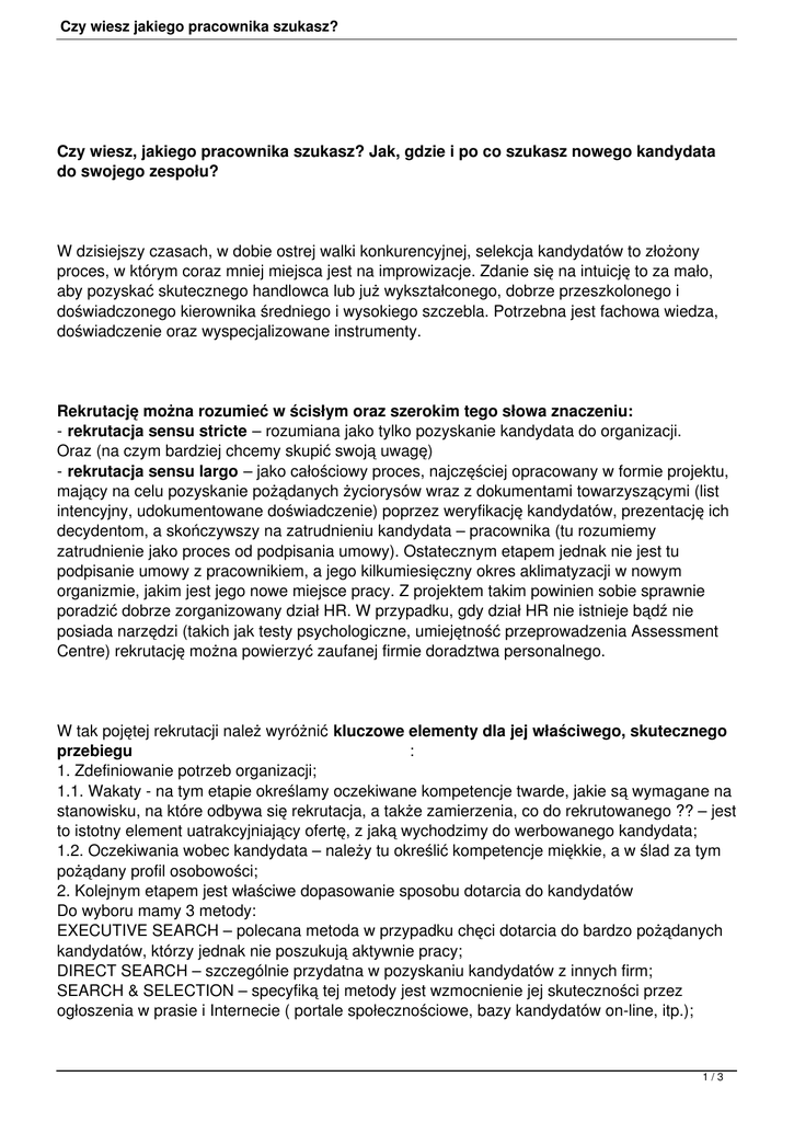 Czy wiesz jakiego pracownika szukasz? Czy wiesz, jakiego pracownika szukasz? Jak, gdzie i po co szukasz nowego kandydata do swojego zespołu? W dzisiejszy czasach, w dobie ostrej walki konkurencyjnej, selekcja kandydatów to złożony proces, w którym coraz mniej miejsca jest na improwizacje. Zdanie się na intuicję to za mało, aby pozyskać skutecznego handlowca lub już wykształconego, dobrze przeszkolonego i doświadczonego kierownika średniego i wysokiego szczebla. Potrzebna jest fachowa wiedza, doświadczenie oraz wyspecjalizowane instrumenty. Rekrutację można rozumieć w ścisłym oraz szerokim tego słowa znaczeniu: - rekrutacja sensu stricte – rozumiana jako tylko pozyskanie kandydata do organizacji. Oraz (na czym bardziej chcemy skupić swoją uwagę) - rekrutacja sensu largo – jako całościowy proces, najczęściej opracowany w formie projektu, mający na celu pozyskanie pożądanych życiorysów wraz z dokumentami towarzyszącymi (list intencyjny, udokumentowane doświadczenie) poprzez weryfikację kandydatów, prezentację ich decydentom, a skończywszy na zatrudnieniu kandydata – pracownika (tu rozumiemy zatrudnienie jako proces od podpisania umowy). Ostatecznym etapem jednak nie jest tu podpisanie umowy z pracownikiem, a jego kilkumiesięczny okres aklimatyzacji w nowym organizmie, jakim jest jego nowe miejsce pracy. Z projektem takim powinien sobie sprawnie poradzić dobrze zorganizowany dział HR. W przypadku, gdy dział HR nie istnieje bądź nie posiada narzędzi (takich jak testy psychologiczne, umiejętność przeprowadzenia Assessment Centre) rekrutację można powierzyć zaufanej firmie doradztwa personalnego. W tak pojętej rekrutacji należ wyróżnić kluczowe elementy dla jej właściwego, skutecznego przebiegu : 1. Zdefiniowanie potrzeb organizacji; 1.1. Wakaty - na tym etapie określamy oczekiwane kompetencje twarde, jakie są wymagane na stanowisku, na które odbywa się rekrutacja, a także zamierzenia, co do rekrutowanego ?? – jest to istotny element uatrakcyjniający ofertę, z jaką wychodzimy do werbowanego kandydata; 1.2. Oczekiwania wobec kandydata – należy tu określić kompetencje miękkie, a w ślad za tym pożądany profil osobowości; 2. Kolejnym etapem jest właściwe dopasowanie sposobu dotarcia do kandydatów Do wyboru mamy 3 metody: EXECUTIVE SEARCH – polecana metoda w przypadku chęci dotarcia do bardzo pożądanych kandydatów, którzy jednak nie poszukują aktywnie pracy; DIRECT SEARCH – szczególnie przydatna w pozyskaniu kandydatów z innych firm; SEARCH & SELECTION – specyfiką tej metody jest wzmocnienie jej skuteczności przez ogłoszenia w prasie i Internecie ( portale społecznościowe, bazy kandydatów on-line, itp.); 1/3 Czy wiesz jakiego pracownika szukasz? 3. Identyfikacja najlepszych kandydatów; 4. Weryfikacja kompetencji; 5. Opracowanie raportu; 6. Omówienie raportów i dokumentacji; 7. Spotkania z kandydatami; 8. Podpisanie umowy o współpracy w formie kontraktu menedżerskiego, umowy o pracę, umowy zlecenie; 9. Proces aklimatyzacji pracownika w nowym miejscu pracy. Skoncentrujmy teraz uwagę na badaniu potrzeb organizacji. Już na rozmowie wstępnej z osobą bądź osobami, które będą brały udział w procesie rekrutacji należy dokładnie zbadać oczekiwania tych osób. Jeśli pracownik wchodzi do ścisłego niewielkiego grona współpracowników warto poddać analizie również otoczenie, w którym będzie pracował. Spójny i sprawnie funkcjonujący zespół, a o takim mówimy w przypadku zatrudniania nowego kandydata, to głos istotny oraz kapitał, o jaki warto zadbać. Jeśli zespół boryka się z problemami, należy je najpierw rozwiązać. Nowicjusz powinien pojawić się w chwili, jeśli przynajmniej na płaszczyźnie personalnej wszystko jest dobrze ułożone. Dołączając do otoczenia, nowe ogniwo warto mieć na uwadze również głos zespół. Każda z osób biorąca udział w rekrutacji to tak samo istotny głos przy podejmowaniu decyzji o zatrudnieniu, bądź decyzji odmownej (nie nawiązanie współpracy). Różne osoby; współdecydenci to różne spojrzenia a tym samym różne oczekiwania wobec przyszłego pracownika. Inne jednak, nie koniecznie sprzeczne, będą oczekiwania bezpośredniego przełożonego czy osób, z którymi nasz kandydat będzie ściśle pracował w ramach organizacji. Każde „za” i „przeciw” należy traktować jako wartość samą w sobie. Tak szerokie spojrzenie może znacznie usprawnić rekrutację. Każda osoba to różnorodny pryzmat oczekiwań rzucony na tą samą sprawę. Cały czas należy mieć na uwadze cele biznesowe przedsiębiorstwa. Specjaliści, którzy oferują swoje usługi i mogą pochwalić się doświadczeniem wskazują na wyraźne zalety rekrutacji prowadzonej przez firmę zewnętrzną. Nie twierdzę, iż rekrutacja przez pracownika działu personalnego musi zakończyć się niepowodzeniem. Istnieją jednak (jak wskazuje praktyka) istotne elementy, które dają się wyraźnie uchwycić – przemawiające na korzyć rekrutacji przez wyspecjalizowanego dostawcę usług doradztwa personalnego. Rozpoczynając rekrutację musimy dokładnie wiedzieć, kogo i gdzie szukamy (o tym pisałem wcześniej). Dokładnie i wyjątkowo bezstronnie, a zarazem z zachowaniem poufności ekspert dokona analizy potrzeby Klienta tj. Pracodawcy. Organizacja już na etapie badania potrzeb pozyskuje dodatkowo świeżą wiedzę, wolną od utartych firmowych złych praktyk. 2/3 Czy wiesz jakiego pracownika szukasz? Znajomość najlepszych praktyk rekrutacyjnych, zdobyta przy prowadzeniu wielu projektów dla różnych branż, to nieoceniony kapitał konsultanta. Niezależny ekspert nie będzie ulegał psychologicznym pułapkom związanym z oceną kandydata. Wskazane jest w związku z tym, aby taki proces prowadził psycholog z doświadczeniem; również w biznesie. W końcowym etapie Klient otrzyma dokumentacje przedstawiającą kilka solidnie wysortowanych 