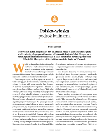 PROJEKT EDUKACYJNY Polsko-włoska podróż kulinarna Ewa Sakowicz We wrześniu 2011 r. Zespół Szkół nr 6 im. Macieja Rataja w Ełku dołączył do grona szkół realizujących program Comenius – Partnerskie Projekty Szkół. Naszym partnerem była szkoła Istituto Professionale di Stato per i Servizi per l’Enogastronomia, l’Ospitalità Alberghiera e i Servizi Commerciali z Asyżu we Włoszech. W ybór tytułu projektu – Polsko-włoska podróż kulinarna – był dość oczywisty z racji tego, iż uczestniczące w nim organizacje to szkoły zawodowe kształcące w zakresie gastronomii i hotelarstwa. Głównym tematem projektu było zapoznanie z kuchniami narodowymi obu krajów. Pomimo ogromu pracy, realizacja projektu okazała się bardzo rozwijającym doświadczeniem, poza tym była świetną zabawą. Uczniowie mieli mnóstwo zadań do wykonania. Po pierwsze, musieli zaplanować współpracę i działania, co nauczyło ich odpowiedzialności za własne decyzje. Wiele zadań dotyczyło gotowania, dlatego obie szkoły musiały opracować menu, czyli wybrać najbardziej charakterystyczne dania, które miały być przygotowane i zaprezentowane przez uczniów. Kolejnym krokiem było napisanie i przetłumaczenie na język angielski przepisów kulinarnych. Na tym etapie okazało się, że minikurs języka włoskiego, w którym uczestniczyli polscy uczniowie, był im pomocny. Bez wątpienia działanie to rozwinęło umiejętności językowe uczestników, ponieważ musieli sprawdzać znaczenie wielu słów i, chcąc nie chcąc, uczyli się ich. Te same umiejętności były ćwiczone także podczas codziennej komunikacji. Uczniowie i nauczyciele wymieniali się listami zarówno przed wyjazdem w celu poznania się, jak i później, pracując nad produktami końcowymi projektu. Podczas wymiany posługiwali się głównie językiem angielskim, 3/2014 ale uczyli się też podstawowych zwrotów w języku partnera. To z pewnością pozwoliło uczestnikom przełamać bariery komunikacyjne. Inne działania dotyczyły tworzenia prezentacji multimedialnych: jednej dotyczącej programu i projektu dla społeczności szkolnej i lokalnej, drugiej – o własnym kraju i regionie dla partnerów, i w końcu – tej podsumowującej pracę nad projektem. Uczniowie założyli również internetową stronę projektu, którą na bieżąco aktualizowali napisanymi przez siebie tekstami, oraz tworzyli galerie zdjęć. Opisane działania pozwoliły uczniom ćwiczyć i doskonalić umiejętności informacyjno-komunikacyjne. Podczas wymiany uczestnicy mieli szansę poznać nową kulturę. Polscy uczniowie zorganizowali w swojej szkole dzień włoski, a Włosi przygotowali u siebie dzień polski. Wymagało to poznania różnych aspektów obcej kultury, takich jak: kuchnia, sztuka, muzyka i walory turystyczne. Uczniowie Zespołu Szkół nr 6 w Ełku podzielili ten dzień na część rozrywkową i oficjalną. Aby zaprosić gości, sami przygotowali zaproszenia dla władz lokalnych, dyrektorów innych szkół, mediów oraz społeczności szkolnej. Jednym z punktów tego wydarzenia była prezentacja multimedialna przygotowana przez uczniów na temat programu, projektu oraz kraju naszych partnerów. Następnie, po wysłuchaniu trzech melodii, w części rozrywkowej, goście musieli odgadnąć, które z nagrań jest hymnem Włoch. Odbył się też wieża Babel [ 115 ] PROJEKT EDUKACYJNY quiz wiedzy o tym kraju oraz mini playback show największych szlagierów muzyki włoskiej, który włączył gości do wspólnej zabawy. Po części rozrywkowej nadszedł najbardziej oczekiwany moment: degustacja dań kuchni włoskiej przygotowanych przez naszych partnerów. Na stołach królowały makarony (bigoli w sosie z kaczki, orecchiette z brokułami, trofie z pesto) oraz takie rarytasy, jak risotto po mediolańsku, lasagne z regionu Marche, słodkie pierogi z Sardynii, zupa warzywna z fasolą, wołowina w winie i oczywiście najbardziej tradycyjne: pizza i zuppa inglese, tiramisu i pana cotta. Wymiana uczniowska W czasie wyjazdu uczniowie uczestniczyli w zajęciach zawodowych, głównie gastronomicznych, podczas których przygotowywali wspólnie dania kuchni włoskiej, zapoznając się wcześniej z przepisami przygotowanymi w języku angielskim. Poznali również obowiązujący we Włoszech system edukacji oraz porównali metody nauczania. Jednym z punktów wymiany było zaprezentowanie walorów turystycznych regionów Polski i Włoch. I tak, Włosi pojechali do Olsztyna, Malborka, Stańczyk oraz Wigier. Natomiast polscy uczniowie mieli okazję poznać zabytki i ciekawe miejsca Rzymu oraz Perugii. Poza pięknymi widokami była to ciekawa lekcja historii. Nasi partnerzy odbyli również wycieczki edukacyjne, m.in. byli w zakładzie produkcyjno-usługowym „Karmelek”, gdzie poznali metodę produkcji pieczywa, oraz w miejscowości Żytkiejmy, gdzie mogli samodzielnie przygotować od początku do końca regionalne przysmaki, takie jak kartacze czy sękacz. Natomiast uczniowie naszej szkoły zwiedzili fabrykę oryginalnego sera parmigiano-reggiano w Modenie, fabrykę czekolady Nestlé w Perugii oraz gospodarstwo produkujące ocet balsamiczny i gospodarstwo wytwarzające oliwę. Ciekawym punktem była wizyta w jednym z najbardziej prestiżowych obiektów w Perugii, w pięciogwiazdkowym hotelu Brufani, który powstał na ruinach etruskich budowli sprzed 3 tys. lat. Nieodzowną częścią wymiany uczniów były zajęcia integracyjne. Uczniowie ZS nr 6 w Ełku zaprosili swoich partnerów na ognisko z pieczeniem kiełbasek i śpiewami przy dźwiękach gitary, na mecze siatkówki i piłki nożnej oraz wspólne spacery wzdłuż promenady biegnącej nad pięknym Jeziorem Ełckim. Rozwijali w ten sposób umiejętności interpersonalne. Zadaniem uczniów był też kontakt z mediami. Udzielali wywiadów rozgłośniom Bayer FM i Radio 5 oraz telewizji [ 116 ] regionalnej (TVP) w Olsztynie, co służyło rozpowszechnianiu wiedzy o projekcie i 