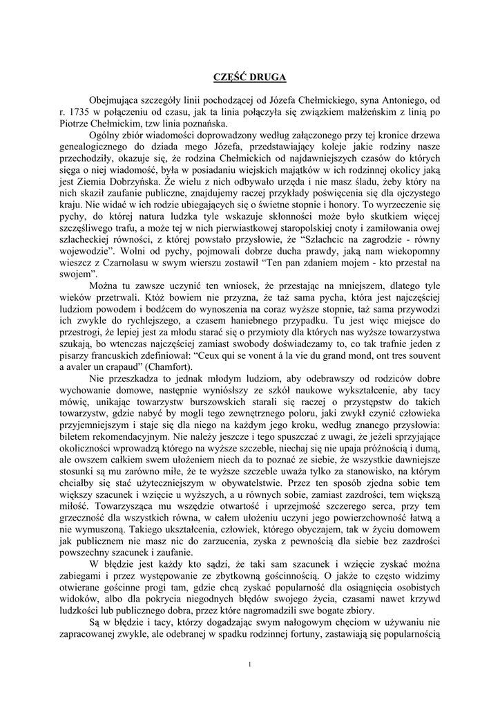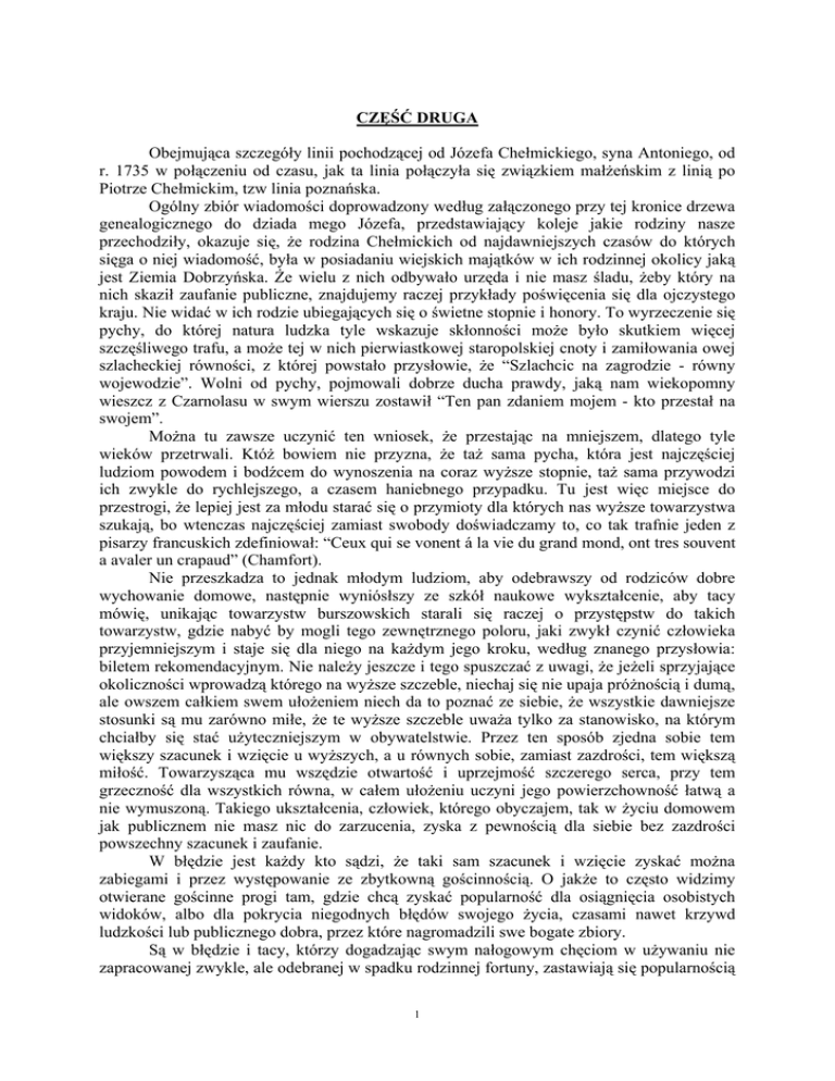CZĘŚĆ DRUGA Obejmująca szczegóły linii pochodzącej od Józefa Chełmickiego, syna Antoniego, od r. 1735 w połączeniu od czasu, jak ta linia połączyła się związkiem małżeńskim z linią po Piotrze Chełmickim, tzw linia poznańska. Ogólny zbiór wiadomości doprowadzony według załączonego przy tej kronice drzewa genealogicznego do dziada mego Józefa, przedstawiający koleje jakie rodziny nasze przechodziły, okazuje się, że rodzina Chełmickich od najdawniejszych czasów do których sięga o niej wiadomość, była w posiadaniu wiejskich majątków w ich rodzinnej okolicy jaką jest Ziemia Dobrzyńska. Że wielu z nich odbywało urzęda i nie masz śladu, żeby który na nich skaził zaufanie publiczne, znajdujemy raczej przykłady poświęcenia się dla ojczystego kraju. Nie widać w ich rodzie ubiegających się o świetne stopnie i honory. To wyrzeczenie się pychy, do której natura ludzka tyle wskazuje skłonności może było skutkiem więcej szczęśliwego trafu, a może tej w nich pierwiastkowej staropolskiej cnoty i zamiłowania owej szlacheckiej równości, z której powstało przysłowie, że “Szlachcic na zagrodzie - równy wojewodzie”. Wolni od pychy, pojmowali dobrze ducha prawdy, jaką nam wiekopomny wieszcz z Czarnolasu w swym wierszu zostawił “Ten pan zdaniem mojem - kto przestał na swojem”. Można tu zawsze uczynić ten wniosek, że przestając na mniejszem, dlatego tyle wieków przetrwali. Któż bowiem nie przyzna, że taż sama pycha, która jest najczęściej ludziom powodem i bodźcem do wynoszenia na coraz wyższe stopnie, taż sama przywodzi ich zwykle do rychlejszego, a czasem haniebnego przypadku. Tu jest więc miejsce do przestrogi, że lepiej jest za młodu starać się o przymioty dla których nas wyższe towarzystwa szukają, bo wtenczas najczęściej zamiast swobody doświadczamy to, co tak trafnie jeden z pisarzy francuskich zdefiniował: “Ceux qui se vonent á la vie du grand mond, ont tres souvent a avaler un crapaud” (Chamfort). Nie przeszkadza to jednak młodym ludziom, aby odebrawszy od rodziców dobre wychowanie domowe, następnie wyniósłszy ze szkół naukowe wykształcenie, aby tacy mówię, unikając towarzystw burszowskich starali się raczej o przystępstw do takich towarzystw, gdzie nabyć by mogli tego zewnętrznego poloru, jaki zwykł czynić człowieka przyjemniejszym i staje się dla niego na każdym jego kroku, według znanego przysłowia: biletem rekomendacyjnym. Nie należy jeszcze i tego spuszczać z uwagi, że jeżeli sprzyjające okoliczności wprowadzą którego na wyższe szczeble, niechaj się nie upaja próżnością i dumą, ale owszem całkiem swem ułożeniem niech da to poznać ze siebie, że wszystkie dawniejsze stosunki są mu zarówno miłe, że te wyższe szczeble uważa tylko za stanowisko, na którym chciałby się stać użyteczniejszym w obywatelstwie. Przez ten sposób zjedna sobie tem większy szacunek i wzięcie u wyższych, a u równych sobie, zamiast zazdrości, tem większą miłość. Towarzysząca mu wszędzie otwartość i uprzejmość szczerego serca, przy tem grzeczność dla wszystkich równa, w całem ułożeniu uczyni jego powierzchowność łatwą a nie wymuszoną. Takiego ukształcenia, człowiek, którego obyczajem, tak w życiu domowem jak publicznem nie masz nic do zarzucenia, zyska z pewnością dla siebie bez zazdrości powszechny szacunek i zaufanie. W błędzie jest każdy kto sądzi, że taki sam szacunek i wzięcie zyskać można zabiegami i przez występowanie ze zbytkowną gościnnością. O jakże to często widzimy otwierane gościnne progi tam, gdzie chcą zyskać popularność dla osiągnięcia osobistych widoków, albo dla pokrycia niegodnych błędów swojego życia, czasami nawet krzywd ludzkości lub publicznego dobra, przez które nagromadzili swe bogate zbiory. Są w błędzie i tacy, którzy dogadzając swym nałogowym chęciom w używaniu nie zapracowanej zwykle, ale odebranej w spadku rodzinnej fortuny, zastawiają się popularnością 1 przyswojoną w tradycji po przodkach, u których powszechną była rozrzutność i nieoględność w wydatkach. Ależ podobne postępowanie i podobne wyobrażenia popularności mogą usprawiedliwić naszych przodków tylko dawnemi czasy, nie dobrocią zasady, ale przemijającym stanem stosunków względem stanów niższych w narodzie, kiedy ta sama ręka, która rozrzucała pieniądze, taż sama zasłaniała chrześcijaństwo od barbarzyńskich napadów wschodu, która odbijała tatarom branki wieśniaków polskich i ze wszystkich stron zasłaniała kraj od nieprzyjaciół. Wtenczas znękany trudami obozów Szlachcic Polski, zyskiwał prawo do swobodniejszego życia w kraju, któremu odzyskał spokojność i bezpieczeństwo. Wówczas odbierając w nagrodę gotowe intraty w dożywociu z narodowych starostw, oparty na swych przywilejach szlachetny przedstawiał obraz, gdyż tą samą ręką rozrzucał pieniądze pomiędzy uboższych, którzy pracowali na niego, a on oddany publicznym usługom kraju, dawno w dodatku krew swoją za niego przelewał. Ale dzisiejszy stan społeczeństwa zupełnie się odmienił: powinniśmy go dziś lepiej rozumieć i inaczej stan dzisiejszy postępowej Cywilizacji oceniać – „Tempora mutantur, et nos mutatur in illis” - (Czasy się zmieniają i my wraz z nimi) - dziś wewnętrzne przymioty, nie sama tylko odwaga i męstwo powinny nas czynić zdolnymi dla użytku kraju. Nadzieja w Bogu, że ludy chrześcijańskie, które dziś w cudzej sprawie poddają się rozlewowi swej krwi, dla nasycenia chciwości i dumy, że zamiast wzorem azjatyckich pogan najeżdżać cudze ziemie, pójdą za głosem Chrystusa, który nam w Piśmie Świętym i Dziesięciorgu Przykazań zalecił. Dziś nie hulanką, ale prawdziwą zasługą powinniśmy się starać o popularność, czyli przyjaźń naszych współbraci, aby każdy będąc użytecznym członkiem towarzystwa zasługiwał mu się pracą 