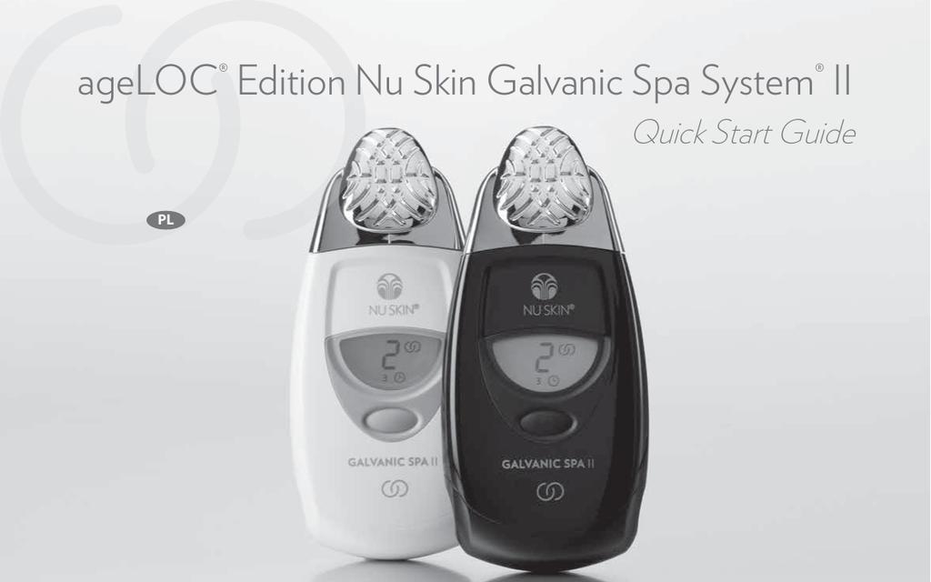 ageLOC® Edition Nu Skin Galvanic Spa System® II Quick Start Guide PL PL ■ Ważne ostrzeżenia przed rozpoczęciem korzystania z urządzenia ► Przed rozpoczęciem należy zapoznać się z poniższymi informacjami: 1. Przed rozpoczęciem zabiegu należy każdorazowo sprawdzić stan urządzenia oraz przystawki. Szczególnie należy zwrócić uwagę czy nie występuje porowata lub uszkodzona powierzchnia, ostre krawędzie czy wybrzuszenia. W razie zauważenia jakichkolwiek nieprawidłowości, należy zaprzestać używania urządzenia i skontaktować się z lokalnym biurem Nu Skin. Przechowywać w suchym miejscu w temperaturze pokojowej, przy minimalnej temperaturze 4°C w celu zapobiegania tworzeniu się pęcherzyków na chromowych częściach urządzenia. 2. Urządzenie może okazać się nieodpowiednie dla niektórych rodzajów skóry lub osób w pewnym wieku. ageLOC® Edition Nu Skin Galvanic Spa System® II należy stosować jedynie na zdrowej skórze. Nie używać na obszarach o popękanych naczyniach krwionośnych, zaatakowanych wysypką lub stanami zapalnymi oraz na powierzchniach otwartych ran. Nie zaleca się używania przez osoby ze skłonnością do trądziku różowatego, uczulonych na metal lub o problematycznej, nadwrażliwej skórze. Osoby o nadwrażliwym rodzaju skóry, kobiety w ciąży, osoby z wszczepionym rozrusznikiem serca lub metalowymi implantami, osoby noszące metalowe aparaty korekcyjne lub cierpiące na epilepsję powinny skonsultować się z lekarzem przed użyciem urządzenia Nu Skin Galvanic Spa System® II. 3. Nie stosować na powierzchni ust i powiek. Urządzenie oraz kompatybilne produkty przeznaczone są wyłącznie do użytku zewnętrznego. W przypadku wystąpienia zaczerwienień lub objawów podrażnienia skóry, należy natychmiast zaniechać stosowania. Przechowywać w miejscu niedostępnym dla dzieci. 4. Osoby o skórze wrażliwej i skłonnej do reakcji alergicznych, a także użytkownicy, którzy stosują Nu Skin Galvanic Spa System® II po raz pierwszy powinni zawsze najpierw przetestować urządzenie na niewielkiej powierzchni skóry. 5. Należy używać urządzenia wyłącznie zgodnie ze wskazówkami zawartymi w instrukcji obsługi Nu Skin Galvanic Spa System® II. Nie używać dłużej lub częściej niż zaleca to niniejszy przewodnik. 6. Przed użyciem trzeba usunąć wszelkie folie zabezpieczające. 7. Aby uniknąć ryzyka obrażeń, porażenia prądem, pożaru i poparzeń: Nie zanurzać urządzenia w wodzie. Nie przechowywać lub nie kłaść urządzenia w miejscach, z których może łatwo wpaść do wanny, umywalki lub toalety. Nie używać uszkodzonego urządzenia. Nie posługiwać się urządzeniem w sposób inny niż zalecany w instrukcji obsługi. 8. Nie przytrzymywać i nie ściskać płaszczyzny przystawki podczas zdejmowania, gdyż może to utrudniać działanie mechanizmu zwalniającego. Przystawkę należy ująć za krawędzie po obu stronach. 9. Niniejszy „Przewodnik szybkiego startu” nie zawiera kompletnych informacji potrzebnych do prawidłowego posługiwania się urządzeniem lub do przeprowadzenia zabiegu. Przed użyciem urządzenia Nu Skin Galvanic Spa System® II i kompatybilnych produktów należy zapoznać się z pełną wersją instrukcji obsługi, która jest dostępna na płycie CD-ROM dołączonej do zestawu lub w Bibliotece zakładki Biuro. 1 PL ■ Nu Skin Galvanic Spa System® II – ryciny i oznaczenia ► ageLOC Edition Nu Skin Galvanic Spa System® II obejmuje programowane urządzenie wykorzystujące specjalny system oznaczeń oraz cztery przystawki ® Ryciny, do których odnosi się poniższa legenda znajdują się na stronie 103. Elementy urządzenia: (3) Ekran (1) G łówka przystosowana do nakładania przystawki (4) Klawisz programowania (2) Przycisk zwalniający przystawkę (5) Chromowa płytka aktywacyjna Przystawki: (10) Przystawka do ciała (8) Przystawka do twarzy ageLOC® (11) Przystawka do skóry głowy (6) K omora na baterie (z już zainstalowanymi dwoma bateriami AAA) (7) W skaźnik pozycji przystawki (wgłębienie) (9) Przystawka do wybranych partii skóry System oznaczeń: (12) Numery 1, 2, 3, 4 lub 5 określają poszczególne rodzaje zabiegów oraz przeznaczone do nich produkty. (13) Wizerunek tarczy zegara i numer oznacza zalecaną długość zabiegu w minutach (2, 3 lub 5 minut). (14) Podczas zabiegu nr 2 (zabiegu właściwego przy użyciu Galvanic Treatment Facial Gel) z prawej strony numeru zabiegu na górze pojawia się symbol ageLOC®. (15) K iedy baterie zaczynają słabnąć, przy każdym uruchomieniu urządzenia w centrum ekranu pojawia się symbol „0” i miga czterokrotnie. Sytuacja taka powtarza się do chwili dokonania wymiany baterii. 2 PL ► Numer zabiegu pojawiający się na ekranie odpowiada poszczególnym produktom. Rodzaj zabiegu Numer zabiegu 1 2 3 Produkt* Nu Skin Galvanic Spa System® II Facial Pre-treat Gel Nu Skin Galvanic Spa System® II Facial Treatment Gel Tru Face® Line Corrector 4 5 Nutriol® Hair Fitness Treatment Czas trwania** Częstotliwość wykonywania 2 minuty 2 – 3 razy w tygodniu 3 minuty 2 – 3 razy w tygodniu 5 minut*** Codziennie, rano i wieczorem 5 minut*** 2 razy w tygodniu (rano i wieczorem) 2 minuty 3 razy w tygodniu *Produkty nie wymienione w tabeli nie są przeznaczone do stosowania z ageLOC® Edition Nu Skin Galvanic Spa System® II. **Osoby, które stosują Nu Skin Galvanic Spa System® II po raz pierwszy powinny przetestować urządzenie na niewielkiej, niewidocznej powierzchni skóry, aby upewnić się, że nie wystąpią podrażnienia. Osobom o skórze nadwrażliwej mogą wystarczyć krótsze zabiegi. ***Pięć minut to zalecana długość całkowitego zabiegu na twarzy/ciele. W zależności od partii ciała, na których zabieg jest wykonywany oraz ich powierzchni zabieg może być krótszy. Należy zachować szczególną ostrożność, stosując urządzenie na wyjątkowo delikatnych partiach (jak np. okolice oczu, gdzie zalecany 