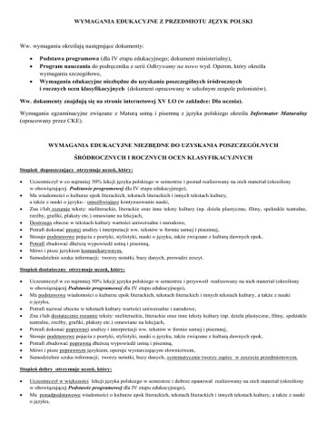 WYMAGANIA EDUKACYJNE Z PRZEDMIOTU JĘZYK POLSKI Ww. wymagania określają następujące dokumenty: Podstawa programowa (dla IV etapu edukacyjnego; dokument ministerialny), Program nauczania do podręcznika z serii Odkrywamy na nowo wyd. Operon, który określa wymagania szczegółowe, Wymagania edukacyjne niezbędne do uzyskania poszczególnych śródrocznych i rocznych ocen klasyfikacyjnych (dokument opracowany w szkolnym zespole polonistów). Ww. dokumenty znajdują się na stronie internetowej XV LO (w zakładce: Dla ucznia). Wymagania egzaminacyjne związane z Maturą ustną i pisemną z języka polskiego określa Informator Maturalny (opracowany przez CKE). WYMAGANIA EDUKACYJNE NIEZBĘDNE DO UZYSKANIA POSZCZEGÓLNYCH ŚRÓDROCZNYCH I ROCZNYCH OCEN KLASYFIKACYJNYCH Stopień dopuszczający otrzymuje uczeń, który: Uczestniczył w co najmniej 50% lekcji języka polskiego w semestrze i poznał realizowany na nich materiał (określony w obowiązującej Podstawie programowej dla IV etapu edukacyjnego), Ma wiadomości o kulturze epok literackich, tekstach literackich i innych tekstach kultury, a także z nauki o języku - umożliwiające kontynuowanie nauki, Zna i/lub rozumie teksty: nieliterackie, literackie oraz inne teksty kultury (np. dzieła plastyczne, filmy, spektakle teatralne, rzeźby, grafiki, plakaty etc.) omawiane na lekcjach, Dostrzega obecne w tekstach kultury wartości uniwersalne i narodowe, Potrafi dokonać prostej analizy i interpretacji ww. tekstów w formie ustnej i pisemnej, Stosuje podstawowe pojęcia z poetyki, stylistyki, nauki o języku, także związane z kulturą dawnych epok, Potrafi zbudować dłuższą wypowiedź ustną i pisemną, Mówi i pisze językiem komunikatywnym, Samodzielnie szuka informacji; tworzy notatki, bazy danych, prowadzi zeszyt. Stopień dostateczny otrzymuje uczeń, który: Uczestniczył w co najmniej 50% lekcji języka polskiego w semestrze i przyswoił realizowany na nich materiał (określony w obowiązującej Podstawie programowej dla IV etapu edukacyjnego), Ma podstawowe wiadomości o kulturze epok literackich, tekstach literackich i innych tekstach kultury, a także z nauki o języku, Potrafi nazwać obecne w tekstach kultury wartości uniwersalne i narodowe, Zna i/lub dostatecznie rozumie teksty: nieliterackie, literackie oraz inne teksty kultury (np. dzieła plastyczne, filmy, spektakle teatralne, rzeźby, grafiki, plakaty etc.) omawiane na lekcjach, Potrafi dokonać poprawnej analizy i interpretacji ww. tekstów w formie ustnej i pisemnej, Stosuje podstawowe pojęcia z poetyki, stylistyki, nauki o języku, także związane z kulturą dawnych epok, Potrafi zbudować poprawną dłuższą wypowiedź ustną i pisemną, Mówi i pisze poprawnym językiem, operuje wystarczającym słownictwem, Samodzielnie szuka informacji; tworzy notatki, bazy danych, systematycznie tworzy zapisy w zeszycie przedmiotowym. Stopień dobry otrzymuje uczeń, który: Uczestniczył w większości lekcji języka polskiego w semestrze i dobrze opanował realizowany na nich materiał (określony w obowiązującej Podstawie programowej dla IV etapu edukacyjnego), Ma ponadpodstawowe wiadomości o kulturze epok literackich, tekstach literackich i innych tekstach kultury, a także z nauki o języku, Rozumie obecne w tekstach kultury wartości uniwersalne i narodowe, a także rozumie związek języka z wartościami, Dobrze zna i/lub rozumie teksty: nieliterackie, literackie oraz inne teksty kultury (np. dzieła plastyczne, filmy, spektakle teatralne, rzeźby, grafiki, plakaty etc.) omawiane na lekcjach, Potrafi dokonać właściwej analizy i interpretacji ww. tekstów w formie ustnej i pisemnej, przywołuje przy tym różne konteksty, Operuje pojęciami z poetyki, stylistyki, nauki o języku, także związanymi z kulturą dawnych epok, Potrafi zbudować uporządkowaną dłuższą wypowiedź ustną i pisemną, Używa dobrego języka i stylu, ma zróżnicowane słownictwo; mówi płynnie, Jest samodzielny w myśleniu i działaniach takich jak: korzystanie z różnych źródeł informacji, tworzenie notatek, baz danych, starannie prowadzi zeszyt przedmiotowy, Czasami wykonuje zadania dla ochotników. Stopień bardzo dobry otrzymuje uczeń, który: Uczestniczył w zdecydowanej większości lekcji języka polskiego w semestrze i w pełni opanował realizowany na nich materiał (określony w obowiązującej Podstawie programowej dla IV etapu edukacyjnego), Ma bardzo dużo wiadomości o kulturze epok literackich, tekstach literackich i innych tekstach kultury, a także z nauki o języku, Rozumie obecne w tekstach kultury wartości uniwersalne i narodowe, a także rozumie związek języka z wartościami i konflikty wartości, Bardzo dobrze rozumie i/lub zna teksty: nieliterackie, literackie oraz inne teksty kultury (np. dzieła plastyczne, filmy, spektakle teatralne, rzeźby, grafiki, plakaty etc.) omawiane na lekcjach, Potrafi dokonać głębszej (wnikliwej) analizy i interpretacji ww. tekstów w formie ustnej i pisemnej, przywołuje przy tym różne konteksty, Swobodnie operuje pojęciami z poetyki, stylistyki, nauki o języku, także związanymi z kulturą dawnych epok, Swobodnie tworzy dłuższą wypowiedź ustną i pisemną, buduje logiczny wywód, Posługuje się stylem jasnym, swobodnym, indywidualnym; ma zróżnicowane i bogate słownictwo; przestrzega zasad etykiety językowej, Jest samodzielny i twórczy w myśleniu i działaniach takich jak: korzystanie z różnych źródeł informacji, tworzenie notatek, baz danych; starannie prowadzi zeszyt przedmiotowy, Chętnie wykonuje zadania dla ochotników. Stopień celujący otrzymuje uczeń, który spełnia wymagania na stopień bardo dobry, a ponadto: Samodzielnie dobiera i poznaje różnorodne teksty kultury, Wykazuje się samodzielnością, śmiałością i twórczością w myśleniu oraz działaniu, Odwołuje się do aktualności życia kulturalnego, ew. uczestniczył w olimpiadzie z języka polskiego. Dla każdego u