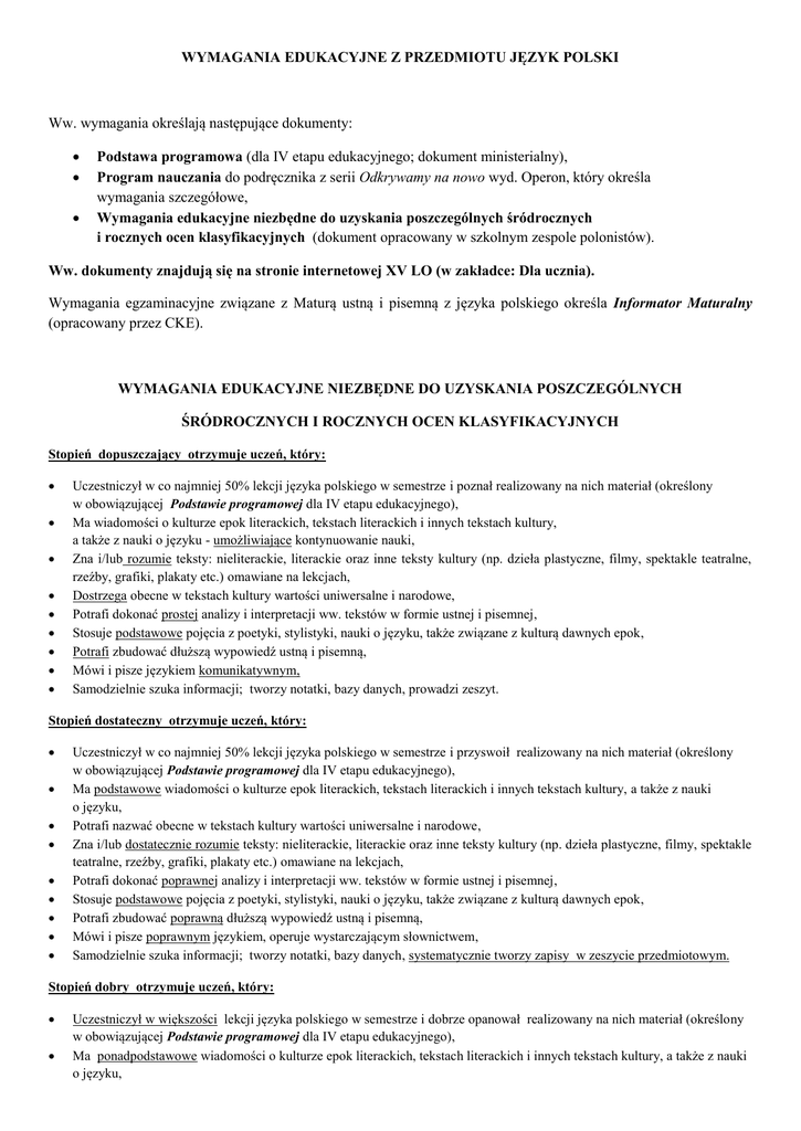 Wymagania edukacyjne - Oficjalna strona XV LO w Krakowie