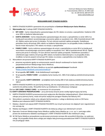 Centrum Medyczne Swiss Medicus ul. Franciszkańska 104/112, 91-845 Łódź tel.: 42 209 30 50, 609 074 074 www.swissmedicus.pl REGULAMIN KART STAŁEGO KLIENTA 1. KARTA STAŁEGO KLIENTA upoważnia do przywilejów w Centrum Medycznym Swiss Medicus. 2. Wprowadza się 3 rodzaje KART STAŁEGO KLIENTA: · MY CARD – karta indywidualna upoważaniająca do 5% rabatu na wizyty u specjalistów i badania USG oraz 20% na badania laboratoryjne · KARTA ZDROWIE – karta indywidualna upoważaniająca do wizyt u specjalistów w cenie 100 zł za każdą pod warunkiem wcześniejszego uiszczenia opłaty w wysokości min. 200 zł (wielokrotność 100 zł). Opłata ważna jest przez 6 miesięcy. Po tym okresie ważność opłaty przepada. Dodatkowo posiadacz karty otrzymuje 20% rabatu na badania laboratoryjne a w przypadku braku środków na karcie może skorzystać z 5% rabatu na wizyty u specjalistów. · FAMILY CARD – karta rodzinna upoważniająca do wizyt u specjalistów w cenie 90 zł za każdą pod warunkiem wcześniejszego uiszczenia opłaty w wysokości min. 360 zł (wielokrotność 90 zł). Opłata ważna jest przez 6 miesięcy. Po tym okresie ważność opłaty przepada. Dodatkowo posiadacz i członkowie jego rodziny otrzymują 20% rabatu na badania laboratoryjne a w przypadku braku środków na karcie pacjent otrzymuje 5% rabatu na wizyty u specjalistów oraz badania USG. 3. Warunkiem otrzymania KARTY STAŁEGO KLIENTA jest: · pisemne wyrażenie zgody na umieszczenie swoich danych osobowych w bazie stałych pacjentówCentrum Medycznego Swiss Medicus; · polubieniu profilu CM Swiss Medicus na portalu społecznościowym Facebook (https://www.facebook.com/swissmedicus) · W przypadku MY CARD – brak dodatkowych wymogów · W przypadku FAMILY CARD – przedpłata karty kwotą min. 360 zł lub większą wielokrotnością kwoty 90 zł. · W przypadku KARTY ZDROWIE – przedpłata karty kwotą 200 zł lub większą wielokrotnością kwoty 100 zł 4. KARTA STAŁEGO KLIENTA nie jest kartą imienną, ale ma niepowtarzalny numer, który przypisany jest w systemie do jednej osoby. Wszystkie karty są nieaktywne. Ich aktywacja następuje Dla kart MY CARD i FAMILY CARD – w momencie ich otrzymania Dla KARTY ZDROWIE PRZEDPŁACONEJ – przy pierwszej wizycie przez osobę legitymującą się kartą. 5. KARTA STAŁEGO KLIENTA przeznaczona jest wyłącznie dla klientów indywidualnych. Klient dokonujący zakupu przy pomocy karty, może otrzymać wyłącznie paragon fiskalny lub fakturę VAT. 6. Warunkiem uzyskania rabatu przy zakupie lub korzystaniu z usług w obniżonej cenie w CM Swiss Medicus jest okazanie KARTY STAŁEGO KLIENTA. 7. Rabaty z dwóch lub więcej KART STAŁEGO PACJENTA czy innych promocji nie objętych tym regulaminem nie sumują się. 8. Rabaty wynikające z KART STAŁEGO KLIENTA nie dotyczą usług w już obniżonych cenach. 9. Operator Centrum Medycznego Swiss Medicus spółka Swiss-Medica sp. z o.o. sp. k. zastrzega sobie prawo do anulowania rabatów wynikających z KART STAŁEGO KLIENTA dla niektórych usług. 10. W CM Swiss Medicus prowadzone są okresowe promocje cenowe dla wszystkich klientów, na wybrane usługi. W przypadku kiedy dana usługa jest objęta taką promocją posiadaczowi KARTY STAŁEGO KLIENTA nie przysługuje rabat. 19 sierpnia 2014 1 Centrum Medyczne Swiss Medicus ul. Franciszkańska 104/112, 91-845 Łódź tel.: 42 209 30 50, 609 074 074 www.swissmedicus.pl 11. KARTA uszkodzona w sposób uniemożliwiający identyfikację KARTY lub właściciela, nie będzie honorowana. 12. W razie zniszczenia lub zagubienia KARTA STAŁEGO KLIENTA nie podlega wymianie. 13. Operator Centrum Medycznego Swiss Medicus spółka Swiss-Medica sp. z o.o. sp. k. zastrzega sobie prawo zmian w Regulaminie KARTY STAŁEGO KLIENTA. 14. Na wybrane usługi w Centrum Medycznym Swiss Medicus mogą obowiązywać inne rabaty, niż wynikające z posiadanej KARTY STAŁEGO KLIENTA. 15. Każdemu użytkownikowi KARTY STAŁEGO KLIENTA przysługuje prawo do wglądu i edytowania swoich danych udostępnionych CM Swiss Medicus przy otrzymywaniu KARTY STAŁEGO KLIENTA. 16. Niniejszy regulamin wchodzi w życie z dniem 19 sierpnia 2014 r. 19 sierpnia 2014 2