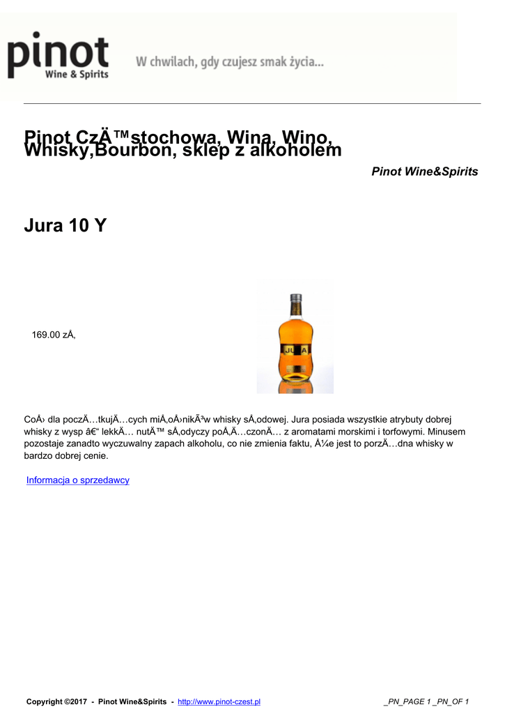 Pinot CzÄ™stochowa, Wina, Wino, Whisky,Bourbon, sklep z alkoholem Pinot Wine&Spirits Jura 10 Y 169.00 zÅ‚ CoÅ› dla poczÄ…tkujÄ…cych miÅ‚oÅ›ników whisky sÅ‚odowej. Jura posiada wszystkie atrybuty dobrej whisky z wysp – lekkÄ… nutÄ™ sÅ‚odyczy połączonÄ… z aromatami morskimi i torfowymi. Minusem pozostaje zanadto wyczuwalny zapach alkoholu, co nie zmienia faktu, że jest to porzÄ…dna whisky w bardzo dobrej cenie. Informacja o sprzedawcy Copyright ©2017 - Pinot Wine&Spirits - http://www.pinot-czest.pl _PN_PAGE 1 _PN_OF 1
