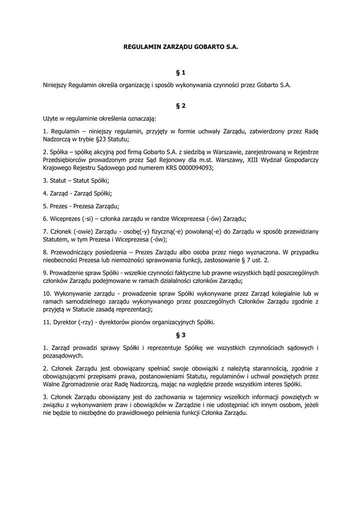 REGULAMIN ZARZĄDU GOBARTO S.A. §1 Niniejszy Regulamin określa organizację i sposób wykonywania czynności przez Gobarto S.A. §2 Użyte w regulaminie określenia oznaczają: 1. Regulamin – niniejszy regulamin, przyjęty w formie uchwały Zarządu, zatwierdzony przez Radę Nadzorczą w trybie §23 Statutu; 2. Spółka – spółkę akcyjną pod firmą Gobarto S.A. z siedzibą w Warszawie, zarejestrowaną w Rejestrze Przedsiębiorców prowadzonym przez Sąd Rejonowy dla m.st. Warszawy, XIII Wydział Gospodarczy Krajowego Rejestru Sądowego pod numerem KRS 0000094093; 3. Statut – Statut Spółki; 4. Zarząd - Zarząd Spółki; 5. Prezes - Prezesa Zarządu; 6. Wiceprezes (-si) – członka zarządu w randze Wiceprezesa (-ów) Zarządu; 7. Członek (-owie) Zarządu - osobę(-y) fizyczną(-e) powołaną(-e) do Zarządu w sposób przewidziany Statutem, w tym Prezesa i Wiceprezesa (-ów); 8. Przewodniczący posiedzenia – Prezes Zarządu albo osoba przez niego wyznaczona. W przypadku nieobecności Prezesa lub niemożności sprawowania funkcji, zastosowanie § 7 ust. 2. 9. Prowadzenie spraw Spółki - wszelkie czynności faktyczne lub prawne wszystkich bądź poszczególnych członków Zarządu podejmowane w ramach działalności członków Zarządu; 10. Wykonywanie zarządu - prowadzenie spraw Spółki wykonywane przez Zarząd kolegialnie lub w ramach samodzielnego zarządu wykonywanego przez poszczególnych Członków Zarządu zgodnie z przyjętą w Statucie zasadą reprezentacji; 11. Dyrektor (-rzy) - dyrektorów pionów organizacyjnych Spółki. §3 1. Zarząd prowadzi sprawy Spółki i reprezentuje Spółkę we wszystkich czynnościach sądowych i pozasądowych. 2. Członek Zarządu jest obowiązany spełniać swoje obowiązki z należytą starannością, zgodnie z obowiązującymi przepisami prawa, postanowieniami Statutu, regulaminów i uchwał powziętych przez Walne Zgromadzenie oraz Radę Nadzorczą, mając na względzie przede wszystkim interes Spółki. 3. Członek Zarządu obowiązany jest do zachowania w tajemnicy wszelkich informacji powziętych w związku z wykonywaniem praw i obowiązków w Zarządzie i nie udostępniać ich innym osobom, jeżeli nie będzie to niezbędne do prawidłowego pełnienia funkcji Członka Zarządu. II. Powołanie w skład Zarządu. Zmiana Zarządu. Rezygnacja. §4 1. Członków Zarządu, powołuje na stanowiska i odwołuje ze stanowisk Rada Nadzorcza bądź Walne Zgromadzenie. Szczegółowy tryb powoływania i odwoływania Członków Zarządu reguluje Statut. 2. Rezygnacja Członka Zarządu wymaga skierowania pisemnego oświadczenia do Przewodniczącego Rady Nadzorczej oraz pisemnego zawiadomienia do Prezesa Zarządu. W przypadku rezygnacji Prezesa Zarządu, pisemne zawiadomienie winno być skierowane także do pozostałych Członków Zarządu. §5 1. Spółkę, w sprawach między nią a Członkiem Zarządu reprezentuje Rada Nadzorcza bądź pełnomocnik powołany uchwałą Walnego Zgromadzenia w trybie art. 379 § 1 Kodeksu spółek handlowych. 2. Członkowie Zarządu mogą być zatrudnieni przez Spółkę na podstawie umowy o pracę, umowy zlecenia lub innej umowy cywilnoprawnej. Rada Nadzorcza może również określić, że członkowie Zarządu otrzymywać będą wynagrodzenie za pełnienie funkcji w Zarządzie niezależnie od ich wynagrodzenia wynikającego z umowy o pracę lub umowy zlecenia. §6 1. W przypadku całkowitej bądź częściowej zmiany Zarządu, nowo powołani Członkowie Zarządu, przejmują protokolarnie od ustępujących Członków Zarządu prowadzenie Spółki. 2. Protokół sporządzany jest przez ustępujących: Zarząd bądź członka Zarządu i powinien zawierać: a) opis stanu faktycznego poszczególnych dziedzin działalności Spółki z zakresu odpowiedzialności ustępującego członka zarządu, na dzień przekazania b) odpis aktualny z Krajowego Rejestru Sądowego, c) protokoły i uchwały Walnych Zgromadzeń, Rady Nadzorczej i Zarządu Spółki, d) inne niezbędne dokumenty i informacje - zgodnie z żądaniem nowego Zarządu. 3. Protokół podpisują wszyscy ustępujący i nowo powołani Członkowie Zarządu. Protokół winien być sporządzony w ilości odpowiedniej do liczby ustępujących i nowo powołanych Członków Zarządu oraz Rady Nadzorczej, a także dla Spółki dla celów dowodowych. 4. W przypadku niemożności przekazania spraw przez ustępujący Zarząd, protokół sporządza komisja powołana przez Radę Nadzorczą. III. Organizacja Zarządu §7 1. Prezes kieruje pracami Zarządu oraz reprezentuje go wobec pozostałych organów Spółki i innych osób. Prezes może upoważnić jednego z Członków Zarządu do prowadzenia spraw z zakresu reprezentowania Zarządu wobec pozostałych organów Spółki i innych osób. 2. W przypadku nieobecności lub wynikającej z innych przyczyn niemożności pełnienia przez Prezesa jego funkcji, o których mowa w ust. 1, sprawuje ją wiceprezes zarządu lub inny członek wybrany przez Zarząd. Zarząd może, w drodze uchwały, przyjąć zasady wzajemnego zastępowania się przez poszczególnych Członków Zarządu na wypadek nieobecności. 3. Udział w posiedzeniu Zarządu jest obowiązkiem Członka Zarządu. Członek Zarządu przedstawia Prezesowi przyczyny swojej nieobecności. IV. Posiedzenia Zarządu §8 1. Podstawową formą pracy Zarządu jest odbywanie posiedzeń i podejmowanie uchwał związanych z prowadzeniem spraw Spółki i wykonywaniem zarządu. 2. Posiedzenia Zarządu odbywają się w miarę potrzeby, nie rzadziej niż raz na miesiąc. 3. Posiedzenia Zarządu odbywają się w siedzibie Spółki, w Grąbkowie lub w innym miejscu wyznaczonym przez Prezesa. 4. Posiedzenia mogą odbywać się również w drodze telekonferencji lub przy wykorzystaniu innego środka porozumiewania się na odległość umożliwiającego wzajemne porozumienie wszystkich uczestniczących w takim posiedzeniu członków Zarządu. 5. Posiedzenia Zarządu zwoływane są przez 
