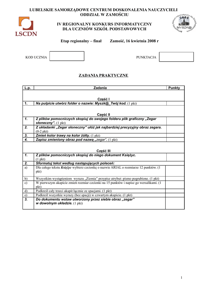 LUBELSKIE SAMORZĄDOWE CENTRUM DOSKONALENIA NAUCZYCIELI ODDZIAŁ W ZAMOŚCIU IV REGIONALNY KONKURS INFORMATYCZNY DLA UCZNIÓW SZKÓŁ PODSTAWOWYCH Etap regionalny – finał Zamość, 16 kwietnia 2008 r KOD UCZNIA PUNKTACJA ZADANIA PRAKTYCZNE L.p. 1. 1. 2. 3. 4. 1. 2. a) b) c) d) e) 3. Zadania Punkty Część I Na pulpicie utwórz folder o nazwie: Myszk@_Twój kod. (1 pkt) Część II Z plików pomocniczych skopiuj do swojego folderu plik graficzny „Zegar słoneczny”. (1 pkt) Z układanki „Zegar słoneczny” ułóż jak najbardziej precyzyjny obraz zegara. (0-2 pkt) Zmień kolor trawy na kolor żółty. (1 pkt) Zapisz zmieniony obraz pod nazwą „zegar”. (1 pkt) Część III Z plików pomocniczych skopiuj do niego dokument Księżyc. (1 pkt) Sformatuj tekst według następujących poleceń: Dla całego tekstu Księżyc wybierz czcionkę o nazwie ARIAL o rozmiarze 12 punktów. (1 pkt) Wszystkim wystąpieniom wyrazu „Ziemia” przypisz atrybut: pismo pogrubione. (1 pkt) W pierwszym akapicie zmień rozmiar czcionki na 15 punktów i napisz go wersalikami. (1 pkt) Podkreśl cały trzeci akapit łącznie ze spacjami. (1 pkt) Podkreśl wszystkie wyrazy (bez spacji) w czwartym akapicie. (1 pkt) Do dokumentu wstaw utworzony przez siebie obraz „zegar” w dowolnym układzie. (1 pkt) 1 1. 2. 3. 1. 2. Część IV Z plików pomocniczych skopiuj do swojego folderu dokument „Szyfr”. (1 pkt) Odkoduj zaszyfrowany tekst. (1 pkt) Zacieniuj odkodowane fragmenty hasła dowolnym kolorem. (1 pkt) Część V W edytorze tekstu Word sporządź tabelkę według wzoru. Wpisz do niej 4 strony WWW o tematyce Kosmos. Opisz w kilku słowach, co zawierają. (4 pkt) Strony WWW - KOSMOS Adres internetowy Informacja o stronie Pod tabelą umieścić zrzut ekranu jednej z wybranych przez siebie stron internetowych. Zapisz plik pod nazwą „strony www” (1 pkt) Łączna ilość punktów: Łączna liczba punktów: 21 Podpisy członków komisji: 1. ........................................................... 2. ........................................................... 3. ........................................................... 2