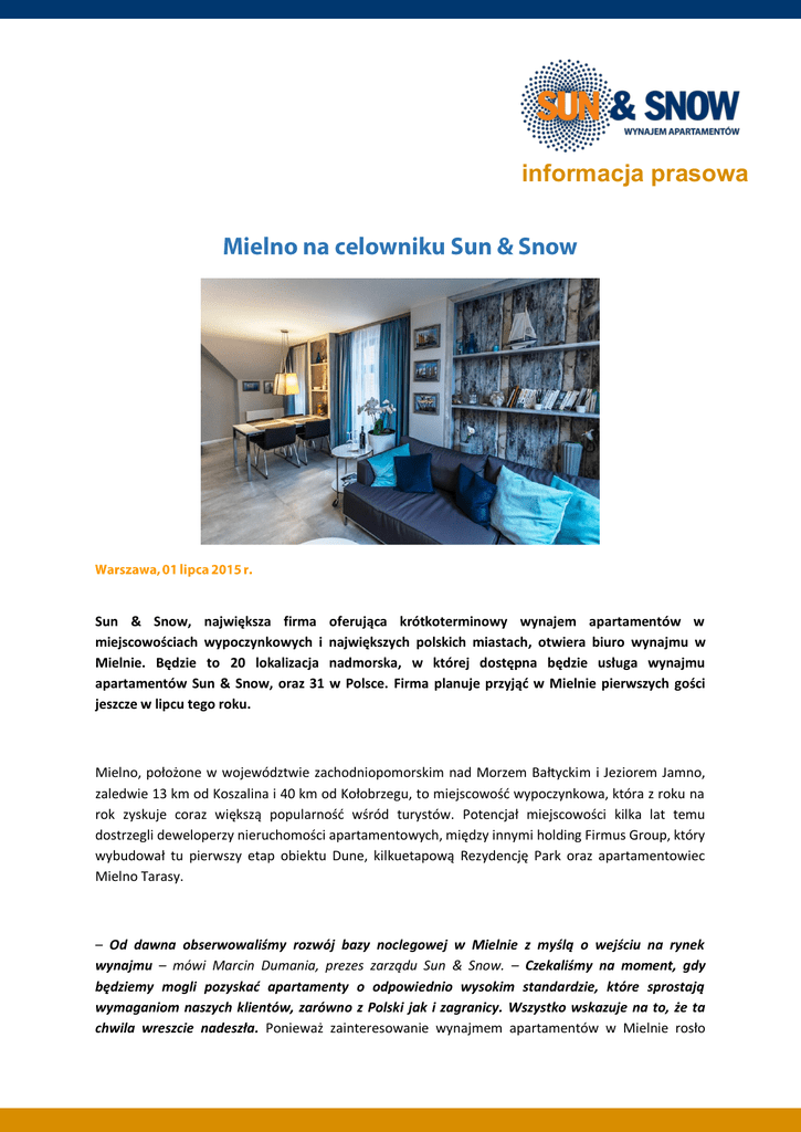 informacja prasowa Sun & Snow, największa firma oferująca krótkoterminowy wynajem apartamentów w miejscowościach wypoczynkowych i największych polskich miastach, otwiera biuro wynajmu w Mielnie. Będzie to 20 lokalizacja nadmorska, w której dostępna będzie usługa wynajmu apartamentów Sun & Snow, oraz 31 w Polsce. Firma planuje przyjąć w Mielnie pierwszych gości jeszcze w lipcu tego roku. Mielno, położone w województwie zachodniopomorskim nad Morzem Bałtyckim i Jeziorem Jamno, zaledwie 13 km od Koszalina i 40 km od Kołobrzegu, to miejscowość wypoczynkowa, która z roku na rok zyskuje coraz większą popularność wśród turystów. Potencjał miejscowości kilka lat temu dostrzegli deweloperzy nieruchomości apartamentowych, między innymi holding Firmus Group, który wybudował tu pierwszy etap obiektu Dune, kilkuetapową Rezydencję Park oraz apartamentowiec Mielno Tarasy. – Od dawna obserwowaliśmy rozwój bazy noclegowej w Mielnie z myślą o wejściu na rynek wynajmu – mówi Marcin Dumania, prezes zarządu Sun & Snow. – Czekaliśmy na moment, gdy będziemy mogli pozyskać apartamenty o odpowiednio wysokim standardzie, które sprostają wymaganiom naszych klientów, zarówno z Polski jak i zagranicy. Wszystko wskazuje na to, że ta chwila wreszcie nadeszła. Ponieważ zainteresowanie wynajmem apartamentów w Mielnie rosło wśród klientów Sun & Snow od kilku sezonów, firma spodziewa się wysokiego obłożenia już od pierwszych dni wprowadzenia oferty. Zwłaszcza ze strony osób, które rezerwacje miejsca noclegowego na wakacje zostawiły na ostatnią chwilę. Siła marki Sun & Snow, firma która zaczęła wynajmować apartamenty turystom blisko 8 lat temu, obsłużyła do tej pory ponad 100 tysięcy rezerwacji. Przychody firmy z wynajmu krótkoterminowego rosną średnio o 40% rocznie, co widać przy porównaniu średniej kwoty rezerwacji w sezonie letnim 2015 r. do roku ubiegłego. Wzrosła ona od 50 do 70% w zależności od miejscowości. Właściciele, którzy zdecydują się wprowadzić swój apartament do sieci Sun & Snow mogą liczyć na pakiet korzyści, w tym do wyboru dwa rodzaje rozliczenia wynagrodzenia, bezpośredni podgląd rezerwacji apartamentu, kompleksową obsługę gości na miejscu, a także usługę sprzątania. Dodatkowe profity to tzw. noclegi właścicielskie oraz korzyści wynikające z członkostwa w Klubie Właściciela Sun & Snow, czyli możliwość bezpłatnego noclegu w innych apartamentach zarządzanych przez sieć. Do bazy tej należą także dwie inwestycje apartamentowo-hotelowe działające pod marką Sun & Snow Resorts, jedna w Szklarskiej Porębie, a druga w Zakopanem. Wkrótce firma planuje rozpocząć budowę trzeciego obiektu, tym razem nad morzem. Sun & Snow współpracuje z globalnymi portalami rezerwacyjnymi, posiada także własne call center oraz system rezerwacji on-line. – Przez ostatni rok naszą stronę odwiedziło ponad milion osób, z czego liczba unikalnych użytkowników wyniosła aż 500 tys. – mówi Agnieszka Jędrzejczyk, Marketing Manager z Sun & Snow. – W maju odnotowaliśmy rekordowe zainteresowanie ofertą i dzienny rekord wejść na stronę, który wyniósł 18 tys. To wyniki, które plasują nas na pierwszym miejscu wśród firm wynajmujących apartamenty w Polsce. Mielno jest trendy Mielno będzie czwartą lokalizacją obsługiwaną przez Sun & Snow w województwie zachodniopomorskim, po Kołobrzegu, Międzyzdrojach i Świnoujściu. Biuro przyjmujące gości mieści się przy ulicy Tadeusza Kościuszki 15, tuż przy popularnej Promenadzie. Miejski deptak został niedawno wyremontowany, i jest centralnym punktem miasteczka, przy którym zlokalizowane są liczne restauracje, puby, kluby i dyskoteki. Miejscowość ma mnóstwo do zaoferowania zarówno rodzinom z dziećmi, jak i fanom sportów wodnych, wędkarzom oraz turystom spragnionym rozrywek. Wśród imprez zaplanowanych na lato tego roku wymienić można rozgrywki w ramach Pucharu Polski w Kiteboardingu oraz Festiwal Organowy. W Mielnie organizowane jest Kino na Leżakach, a od poniedziałku do niedzieli działają kluby i dyskoteki, w tym Klub Bajka, Arena, Disco Plaża i Senso Dance Club. Wczasowicze mogą korzystać z wypożyczalni rowerów miejskich, rowerów wodnych, kajaków oraz łódek. Dużą popularnością cieszą się rejsy statkiem Mila po Jeziorze Jamno. Z kolei zimą w Mielnie co roku odbywa się Międzynarodowy Zlot Morsów. Władze miejscowości mają w planach dotrzeć też do seniorów oraz osób zainteresowanych turystyką medyczną – Mielno stara się bowiem o status uzdrowiska. Ile za drugi dom na wakacje Ceny wynajęcia apartamentu w Milenie w te wakacje będą zbliżone do cen oferowanych w innych miejscowościach województwa, i wyniosą od 280 zł z apartament 2-pokojowy oraz od 430 zł za apartament 3-pokojowy. Baza apartamentów zarządzanych w Polsce przez Sun & Snow liczy już ponad 1000 lokali, z czego ponad 30% z nich znajduje się w województwie zachodniopomorskim: Kołobrzegu, Międzyzdrojach, Międzywodziu i Świnoujściu. Apartamenty należące do sieci Sun & Snow położone są w bardzo dobrych lokalizacjach popularnych miejscowości. Oferują gościom pełne umeblowanie i wyposażenie, także w sprzęt AGD, dzięki czemu nazywane są przez gości drugimi domami. www.sunandsnow.pl www.sunandsnow.pl