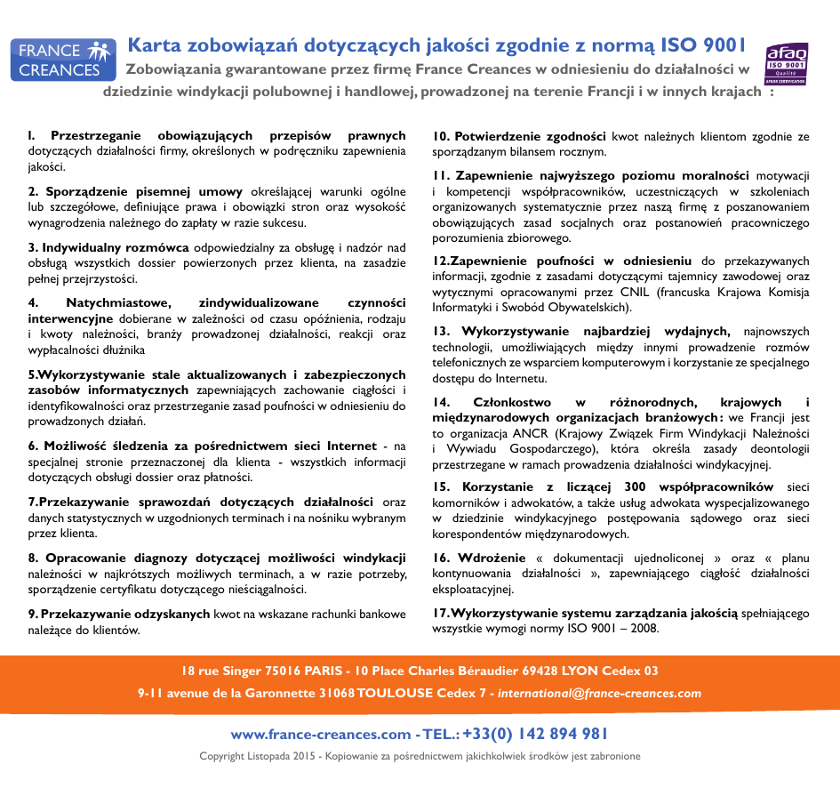 FRANCE CREANCES Karta zobowiązań dotyczących jakości zgodnie z normą ISO 9001 Zobowiązania gwarantowane przez firmę France Creances w odniesieniu do działalności w dziedzinie windykacji polubownej i handlowej, prowadzonej na terenie Francji i w innych krajach : l. Przestrzeganie obowiązujących przepisów prawnych dotyczących działalności firmy, określonych w podręczniku zapewnienia jakości. 2. Sporządzenie pisemnej umowy określającej warunki ogólne lub szczegółowe, definiujące prawa i obowiązki stron oraz wysokość wynagrodzenia należnego do zapłaty w razie sukcesu. 3. Indywidualny rozmówca odpowiedzialny za obsługę i nadzór nad obsługą wszystkich dossier powierzonych przez klienta, na zasadzie pełnej przejrzystości. 4. Natychmiastowe, zindywidualizowane czynności interwencyjne dobierane w zależności od czasu opóźnienia, rodzaju i kwoty należności, branży prowadzonej działalności, reakcji oraz wypłacalności dłużnika 5. Wykorzystywanie stale aktualizowanych i zabezpieczonych zasobów informatycznych zapewniających zachowanie ciągłości i identyfikowalności oraz przestrzeganie zasad poufności w odniesieniu do prowadzonych działań. 6. Możliwość śledzenia za pośrednictwem sieci Internet - na specjalnej stronie przeznaczonej dla klienta - wszystkich informacji dotyczących obsługi dossier oraz płatności. 10. Potwierdzenie zgodności kwot należnych klientom zgodnie ze sporządzanym bilansem rocznym. 11. Zapewnienie najwyższego poziomu moralności motywacji i kompetencji współpracowników, uczestniczących w szkoleniach organizowanych systematycznie przez naszą firmę z poszanowaniem obowiązujących zasad socjalnych oraz postanowień pracowniczego porozumienia zbiorowego. 12.Zapewnienie poufności w odniesieniu do przekazywanych informacji, zgodnie z zasadami dotyczącymi tajemnicy zawodowej oraz wytycznymi opracowanymi przez CNIL (francuska Krajowa Komisja Informatyki i Swobód Obywatelskich). 13. Wykorzystywanie najbardziej wydajnych, najnowszych technologii, umożliwiających między innymi prowadzenie rozmów telefonicznych ze wsparciem komputerowym i korzystanie ze specjalnego dostępu do Internetu. 14. Członkostwo w różnorodnych, krajowych i międzynarodowych organizacjach branżowych : we Francji jest to organizacja ANCR (Krajowy Związek Firm Windykacji Należności i Wywiadu Gospodarczego), która określa zasady deontologii przestrzegane w ramach prowadzenia działalności windykacyjnej. 7.Przekazywanie sprawozdań dotyczących działalności oraz danych statystycznych w uzgodnionych terminach i na nośniku wybranym przez klienta. 15. Korzystanie z liczącej 300 współpracowników sieci komorników i adwokatów, a także usług adwokata wyspecjalizowanego w dziedzinie windykacyjnego postępowania sądowego oraz sieci korespondentów międzynarodowych. 8. Opracowanie diagnozy dotyczącej możliwości windykacji należności w najkrótszych możliwych terminach, a w razie potrzeby, sporządzenie certyfikatu dotyczącego nieściągalności. 16. Wdrożenie « dokumentacji ujednoliconej » oraz « planu kontynuowania działalności », zapewniającego ciągłość działalności eksploatacyjnej. 9. Przekazywanie odzyskanych kwot na wskazane rachunki bankowe należące do klientów. 17. Wykorzystywanie systemu zarządzania jakością spełniającego wszystkie wymogi normy ISO 9001 – 2008. 18 rue Singer 75016 Paris - 10 Place Charles Béraudier 69428 Lyon Cedex 03 9-11 avenue de la Garonnette 31068 TOULOUSE Cedex 7 - [email protected] www.france-creances.com - TEL. : +33(0) 142 894 981 Copyright Listopada 2015 - Kopiowanie za pośrednictwem jakichkolwiek środków jest zabronione
