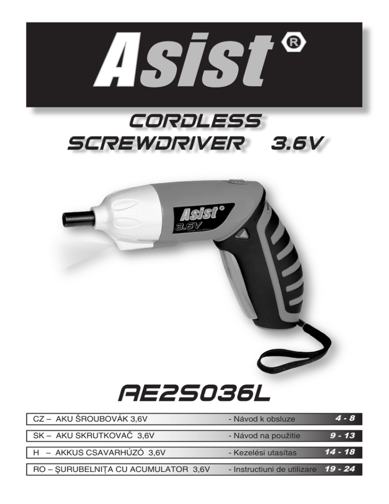 4-8 CZ – AKU ŠROUBOVÁK 3,6V - Návod k obsluze SK – AKU SKRUTKOVAČ 3,6V - Návod na použitie H – AKKUS CSAVARHÚZÓ 3,6V - Kezelési utasítas RO – ŞURUBELNIŢA CU ACUMULATOR 3,6V - Instructiuni de utilizare 19 - 24 9 - 13 14 - 18 SYMBOLS Read operating instructions before use Před prvním použitím si pročtěte návod k obsluze Pred prvím použitím si prečítajte návod na použitie Beüzemelés előtt olvassa el a használati utasítást Cititi cu atentie instructiunile inainte de a folosi produsul Warning Nebezpečí Nebezpečie Figyelmeztetés Atentie Wear ear protection Používejte ochranu sluchu Používajte ochranu sluchu Használjon fülvédőt Folositi protectie fonica Wear eye protection Používejte ochranu zraku Používajte ochranu zraku Használjon védőszemüveget Folositi ochelari de protectie Wear dust mask Používejte ochrannou dýchací roušku Používajte ochrannú dýchaciu rúžku Használjon porvédő maszkot Folositi masca impotriva prafului Double insulation Dvojitá izolace Dvojitá izolácia Dupla szigetelés Dubla izolare Indoor use only Pouze pro vnitřní použití Iba na vnútorné použitiei Csak beltéri használatra A se folosi doar in spatii acoperite cd cd cd cd cd cd Do not expose to rain or water Nevystavujte dešti nebo vodě Nevistavujte daždu alebo vode Nu expuneti la apa sau ploaie Ne tegye ki nedvességnek Do not burn Nevhazujte do ohně Nehádžte do ohna Ne dobja tűzbe. Nu expuneti la flacara deschisa 3 Originální návod CZ AE2S036L - AKU ŠROUBOVÁK 3,6V OBECNÉ BEZPEČNOSTNÍ POKYNY Tyto bezpečnostní pokyny si pečlivě prostudujte, zapamatujte a uschovejte UPOZORNĚNÍ: Při používání elektrických strojů a elektrického nářadí je nutno respektovat a dodržovat následující bezpečnostní pokyny z důvodů ochrany před úrazem elektrickým proudem, zraněním osob a nebezpečím vzniku požáru. Výrazem „elektrické nářadí“ je ve všech níže uvedených pokynech myšleno jak elektrické nářadí napájené ze sítě (napájecím kabelem), tak nářadí napájené z baterií (bez napájecího kabelu). Uschovejte všechna varovaní a pokyny pro příští použití. k jeho řádnému připojení a používání. Použití těchto zařízení může omezit nebezpečí vznikající prachem. h) Pevně upevněte obrobek. Použijte truhlářskou svěrku nebo svěrák pro upevnění dílu, který budete obrábět. i) Nepoužívejte elektrické nářadí pokud jste pod vlivem alkoholu, drog, léků nebo jiných omamných či návykových látek. j) Toto zařízení není určené pro použití osobami (včetně dětí) se sníženými fyzickými, smyslovými nebo mentálními schopnostmi nebo s nedostatkem zkušeností a znalostí, pokud nejsou pod dozorem nebo nedostali pokyny s ohledem na použiti zařízení od osoby zodpovědné za jejich bezpečnost. Děti musí být pod dozorem, aby jste se ujistili, že si nehrají se zařízením. 4. Používání elektrického nářadí a jeho údržba a) El. nářadí vždy odpojte z el. sítě v případě jakéhokoliv problému při práci, před každým čistěním nebo údržbou, při každém přesunu a po ukončení práce! Nikdy nepracujte s el. nářadím, pokud je jakýmkoliv způsobem poškozené. b) Pokud začne nářadí vydávat abnormální zvuk nebo zápach, okamžitě ukončete práci. c) Elektrické nářadí nepřetěžujte. Elektrické nářadí bude pracovat lépe a bezpečněji, pokud jej budete provozovat v otáčkách, pro které bylo navrženo. Používejte správné nářadí, které je určeno pro danou činnost. Správné nářadí bude lépe a bezpečněji vykonávat práci, pro kterou bylo zkonstruováno. d) Nepoužívejte elektrické nářadí, které nelze bezpečně zapnout a vypnout ovládacím spínačem. Používání takového nářadí je nebezpečné. Vadné spínače musí být opraveny certifikovaným servisem. e) Odpojte nářadí od zdroje elektrické energie předtím, než začnete provádět jeho seřizování, výměnu příslušenství nebo údržbu. Toto opatření zamezí nebezpečí náhodného spuštění. f) Nepoužívané elektrické nářadí ukliďte a uschovejte tak, aby bylo mimo dosah dětí a nepovolaných osob. Elektrické nářadí v rukou nezkušených uživatelů může být nebezpečné. Elektrické nářadí skladujte na suchém a bezpečném místě. g) Udržujte elektrické nářadí v dobrém stavu. Pravidelně kontrolujte seřízení pohybujících se částí a jejich pohyblivost. Kontrolujte zda nedošlo k poškození ochranných krytů nebo jiných částí, které mohou ohrozit bezpečnou funkci elektrického nářadí. Je-li nářadí poškozeno, před dalším použitím zajistěte jeho řádnou opravu. Mnoho úrazů je způsobeno špatně udržovaným elektrickým nářadím. h) Řezací nástroje udržujte ostré a čisté. Správně udržované a naostřené nástroje usnadňují práci, omezují nebezpečí zranění a práce s nimi se snáze kontroluje. Použití jiných příslušenství než těch, která jsou uvedena v návodu k obsluze mohou způsobit poškození nářadí a být příčinou zranění. i) Elektrické nářadí, příslušenství, pracovní nástroje atd. používejte v souladu s těmito pokyny a takovým způsobem, který je předepsán pro konkrétní elektrické nářadí a to s ohledem na dané podmínky práce a druh prováděné práce. Používání nářadí k jiným účelúm, než pro jaké je určeno, může vést k nebezpečným situacím. 5. Používání akumulátorového nářadí a) Před vložením akumulátoru se přesvědčte, že je vypínač v poloze „0-vypnuto“. Vložení akumulátoru do zapnutého nářadí může být příčinou nebezpečných situací. b) K nabíjení akumulátorů používejte pouze nabíječky předepsané výrobcem. Použití nabíječky pro jiný typ akumulátoru může mít za následek jeho poškození a v
