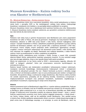 Muzeum Kowalstwa – Kuźnia rodziny Socha oraz Klasztor w Bieńkowicach PL - MUZEUM KOWALSTWA – KUŹNIA RODZINY SOCHA Muzeum Kowalstwa mieści się w warsztacie kowalskim, który został wybudowany w miejscu starej kuźni z początku XVIII w. Na zwiedzających czekają tutaj pokazy tradycyjnego kowalstwa i zwiedzanie mini kolekcji, a na pamiątkę żelazne podkówki na szczęście. Muzeum Kowalstwa mieści się w zabytkowej kuźni państwa Sochów przy ulicy Wojnowskiej 5. Muzeum Kowalstwa można zwiedzać codziennie, po uprzednim umówieniu telefonicznym (tel. 032 419 65 29, 032 419 65 23) Opis Położona nad rzeką Cyną w gminie Krzyżanowice wieś Bieńkowice jest znana pasjonatom kowalstwa nie tylko w Polsce, ale poza jej granicami. Znajdujące się tutaj bowiem Muzeum Kowalstwa, założone w 1999 roku przez kowali z rodu Socha, stanowi najbogatszy zbiór maszyn i narzędzi kowalskich w Polsce. Zabytkowe przedmioty gromadzone są przez rodzinę Sochów od dziewięciu pokoleń. Jest ich już ponad 100, a najstarszy pochodzi z 1702 roku. W muzeum można między innymi podziwiać wiele unikatowych egzemplarzy narzędzi, urządzeń i maszyn rolniczych wykonanych lub okuwanych przez kowali z rodu Sochów. Bez nich rolnictwo nie mogłoby się obejść. Rzemiosło oraz tradycje kowalskie, a także historia rodziny i kuźni są przekazywane w rodzie z pokolenia na pokolenie. Zabytkową kuźnię, odwiedzaną przez turystów z Polski, Europy, a nawet USA, prowadzi obecnie Robert Socha, jednocześnie inspirator powstania muzeum. To ona namówił swego ojca Jana do jego założenia, chcąc w ten sposób złożyć hołd swoim przodkom. Warto też wspomnieć, że Jan Socha został w 2010 r. uhonorowany nagrodą „Mieszko AD 2009” w kategorii „plastyka”, która jest przyznawana corocznie wyróżniającym się animatorom kultury. Rodzina kowali Sochów jest doskonałym przykładem kultywowania tradycji rodzinnych, rozwijania rzemiosła kowalskiego, dostosowywania tradycyjnych metod i umiejętności kowalskich do aktualnych potrzeb. Pan Jan i Robert Sochowie są dumni z dorobku swego rodu, w którym od dziewięciu pokoleń z ojca na syna przekazywana jest wiedza i umiejętności kowalskie. Skrupulatnie dbają o zachowanie swego dziedzictwa. Aby historia rodziny Sochów nie została zapomniana, prowadzą od lat rodzinną kronikę. Uczestniczą w krajowych i międzynarodowych turniejach oraz pokazach kowalskich, wystawach, współpracują z placówkami muzealnymi, wypożyczają im swoje cenne eksponaty. Historia Historia powstania kuźni w Bieńkowicach sięga XVII w. i czasów odsieczy wiedeńskiej. Podczas swojego marszu na Wiedeń, król Jan III Sobieski zatrzymał się w dniach 23–24 sierpnia 1683 r. w Raciborzu, gdzie uczestniczył m.in. w mszy św. w drewnianym kościółku pw. Matki Bożej. W jego 27-tysięcznej armii husarskiej znalazło się wówczas dwóch kowali – ojciec z synem. Podczas wspomnianej wcześniej mszy Socha (ojciec) doglądał ekwipunku, a młody kowal – Jan Socha, ciekaw świata, udał się do pobliskiej wioski Bieńkowice. Tam spotkał pannę o imieniu Ewa. Krótkie spotkanie zaowocowało silnym uczuciem i młody kowal poprzysiągł, że jeżeli armia Jana III Sobieskiego zwycięży, a on przeżyje, to wróci do Bieńkowic, ożeni się z panną Ewą i postawi kuźnię. Los chciał, że Janek Socha przeżył bitwę i powrócił wraz ze zwycięską armią do domu. Słowa dotrzymał i przybył do Bieńkowic, gdzie ożenił się i w 1702 r. postawił drewnianą kuźnię krytą gontem. W ten sposób Jan i Ewa Sochowie stali się założycielami rodu kowali z Bieńkowic. Przez kolejne lata dziewięć pokoleń Sochów doskonaliło rzemiosło. I tak warsztat przechodził z Janka na Andreasa, z Andreasa na Franza, z Franza na Urbana, z Urbana na Antona, z Antona na Johanna, z Johanna na Aloisa, z Aloisa na Jana, a z Jana na Roberta. Starszy brat Jana Sochy, Wilibald był także kowalem, w latach 70. postawił obok kuźni ojca swój warsztat, a Jan przejął warsztat po ojcu. Robert i Jan Sochowie podtrzymują tradycje kowalskie rodu. Nadal kują żelazo w starej kuźni (obecna murowana powstała w 1840 r. na miejscu drewnianej), dobudowano dom murowany, który jest nadal zamieszkany. Murowane palenisko kowalskie, jak również miech skórzany, w który zaopatrzył swoją kuźnię w 1702 r. Janek Socha, znajdują się tam do dziś. Jeszcze niedawno kowale trudnili się głównie usługami dla rolnictwa, okuwali wozy, pługi i brony, które początkowo wykonywano z drewna. Wykonywali większość narzędzi rolniczych i ogrodniczych, kojce dla zwierząt, śrutowniki, ładowacze obornika, sadzarki do ziemniaków, ogrodzenia, drobne narzędzia, etc., a także podkuwali konie. Jednak w związku ze znacznym rozwojem techniki i mechanizacji, kowalstwo straciło na znaczeniu w latach 80. minionego wieku. Kuźnia Sochów zmieniła więc profil swojej działalności na kowalstwo artystyczne. I tak po dziś dzień mistrz Jan Socha wraz z synem Robertem, który także jest już mistrzem kowalskim, rozwijają kowalstwo artystyczne. Wykonują pięknie zdobione ogrodzenia, balustrady dla zamków i kościołów oraz wiele kutych ozdób, także do domów czy ogrodów. Nadal jednak, w razie potrzeby, wykonują niewielkie usługi kowalskie dla okolicznych rolników. CZ - MUZEUM KOVÁŘSTVÍ – KOVÁRNA RODINY SOCHŮ Muzeum kovařství se nachází v kovářské dílně, která byla postavena na místě staré kovárny z počátku XVIII století. Návštěvníky tady čekají ukázky tradičního kovářství a prohlídku mini sbírky a na památku železnou podkovu pro štěstí. Muzeum kovařství se nachází v historické kovárně na Wojnowské ulici 5. Muzeum kovařství je možné navštívit každý den po předchozí telefonické domluvě (tel. 032 419 65 29, 032 419 65 23) Popis Vesnice Bieńkowice nacházející se nad řekou Cyna v obci Krzyżanowice je známá nadšencům ko